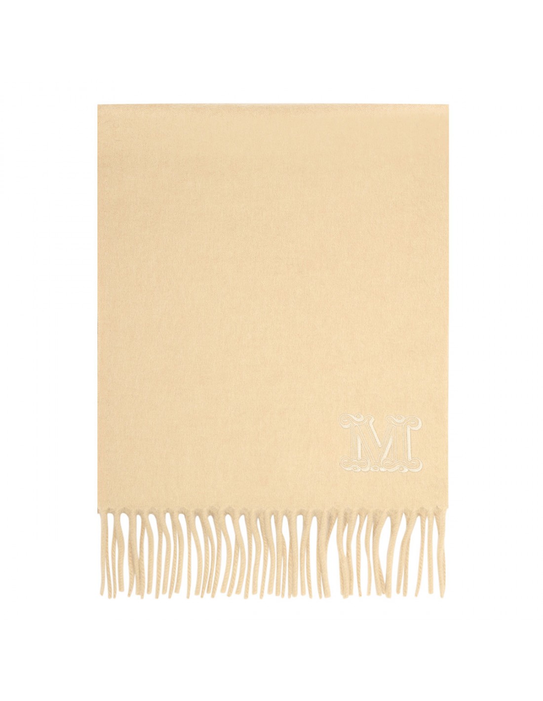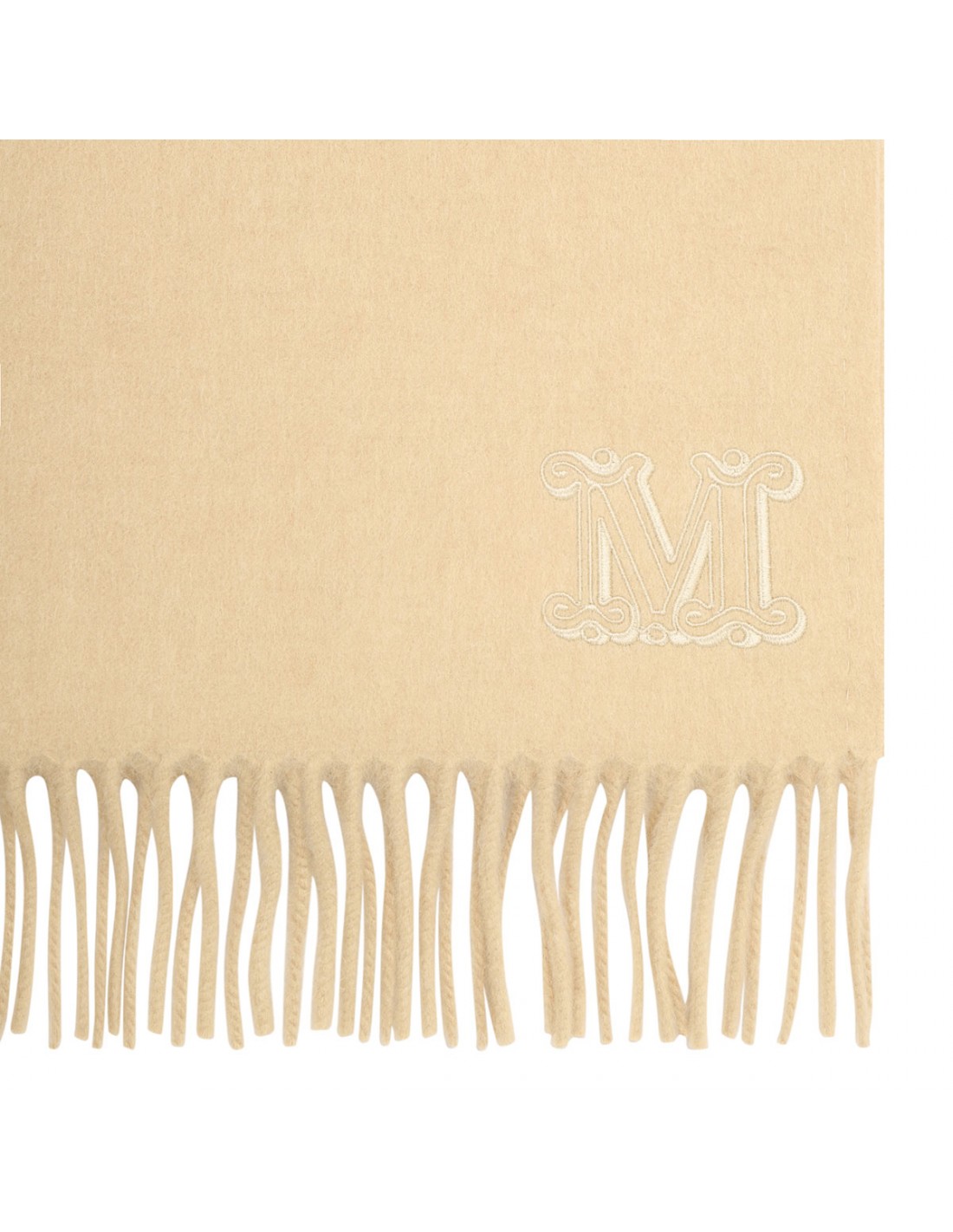 Golden-beige camel-wool stole from Max Mara featuring sable-look, M monogram embroidery, hand-stitched detail on the trims, fringed edges.