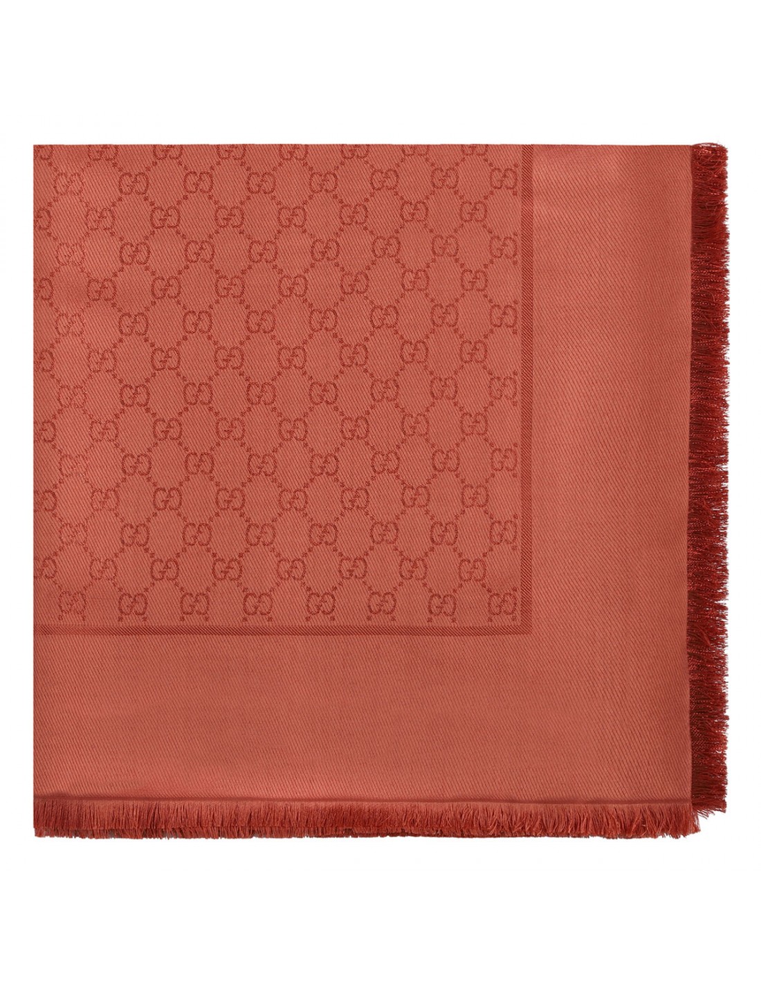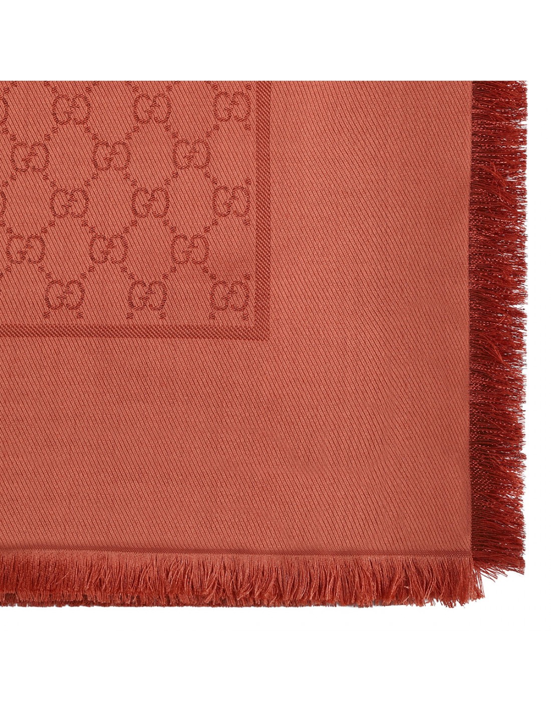 Orange silk wool lamé shawl from Gucci featuring GG motif, fringed trims.