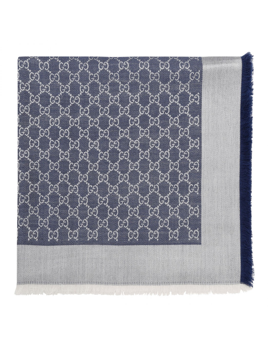 White and blue silk wool shawl from Gucci featuring GG motif, fringed trims.