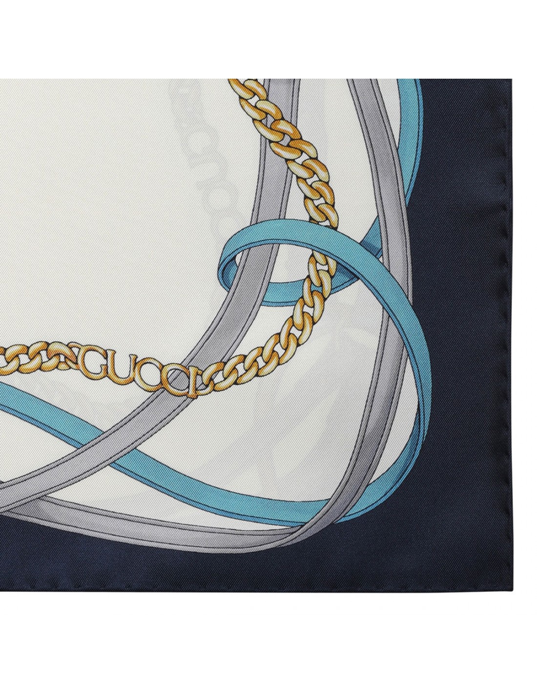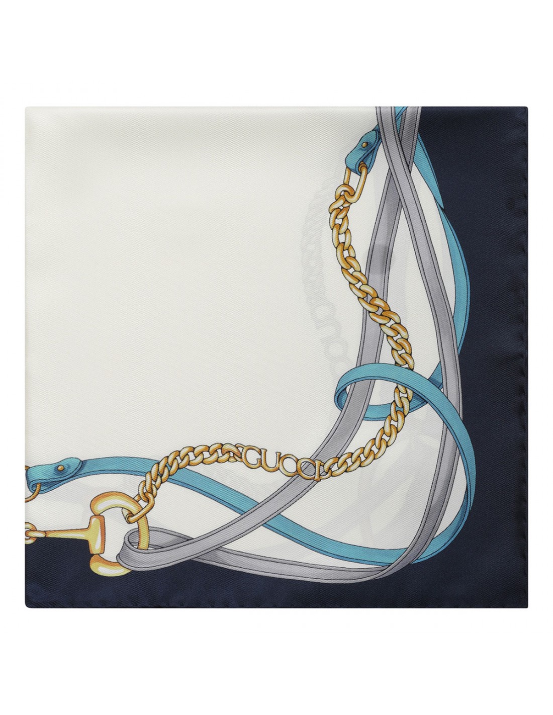 Off-white silk scarf from Gucci featuring contrasting Horsebit chain print, blue borders.