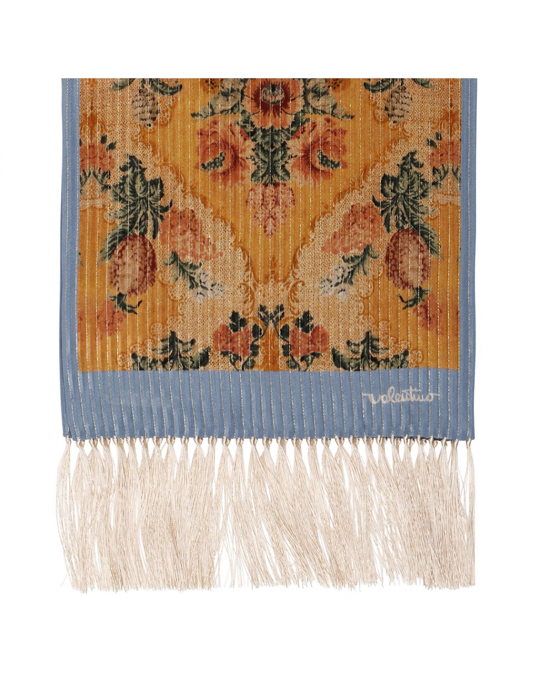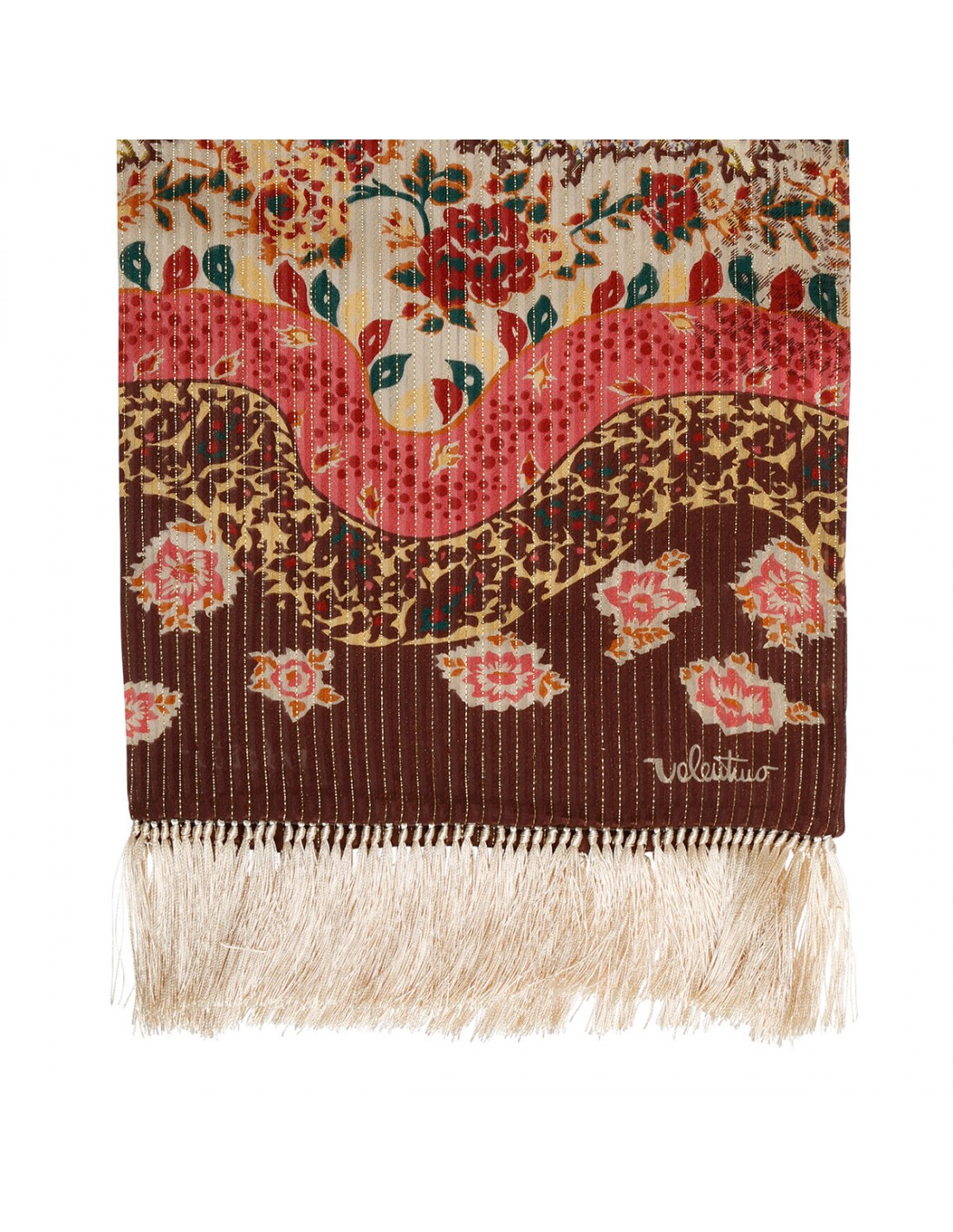 Multicolor silk thin scarf from Valentino featuring floral motif, lurex threads, fringed hem, logo signature print.