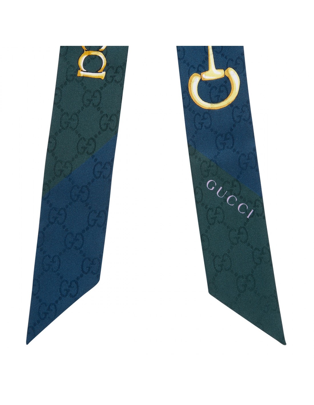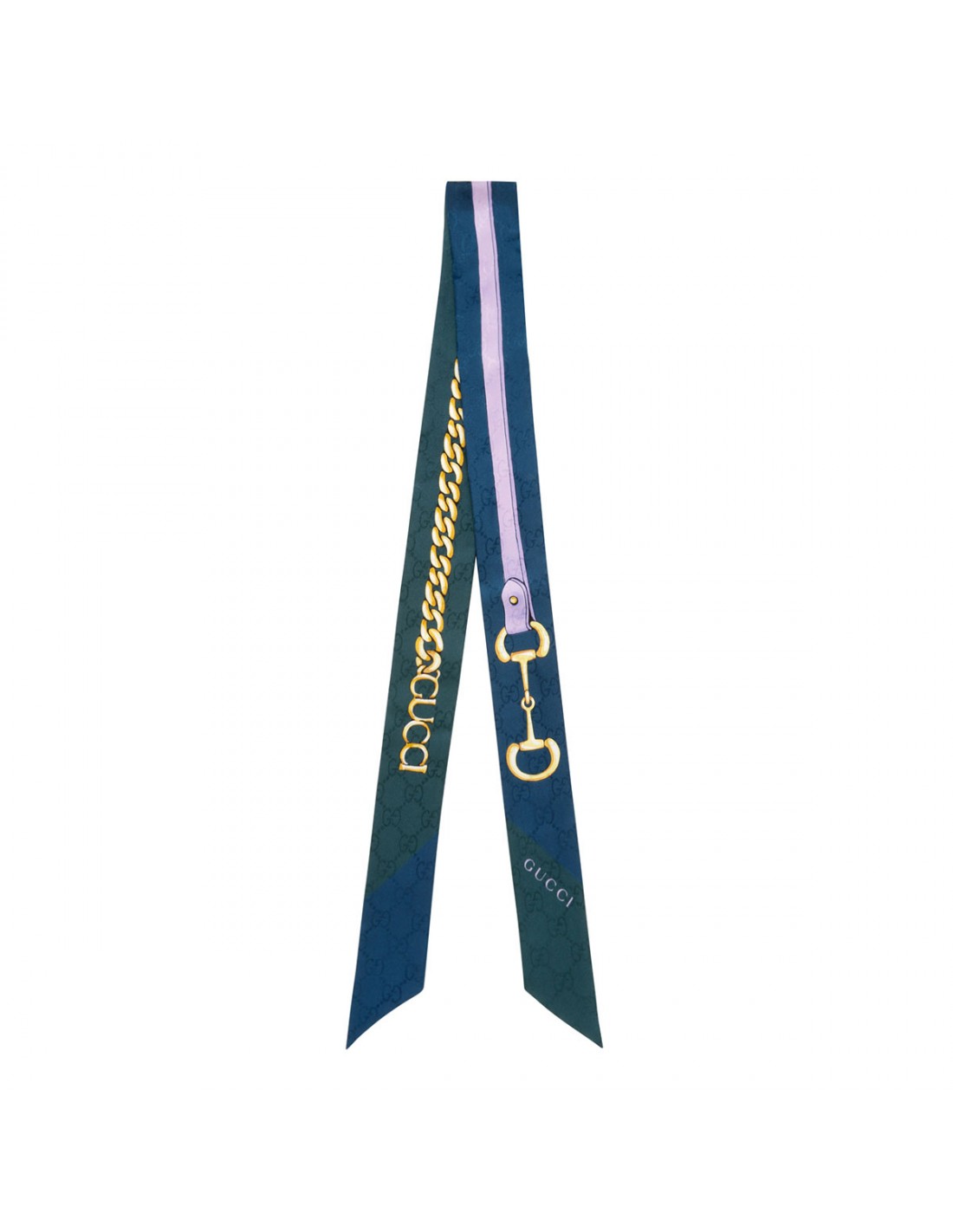 Navy and dark green silk twill scarf from Gucci featuring allover chain Horsebit print and Gucci logo.