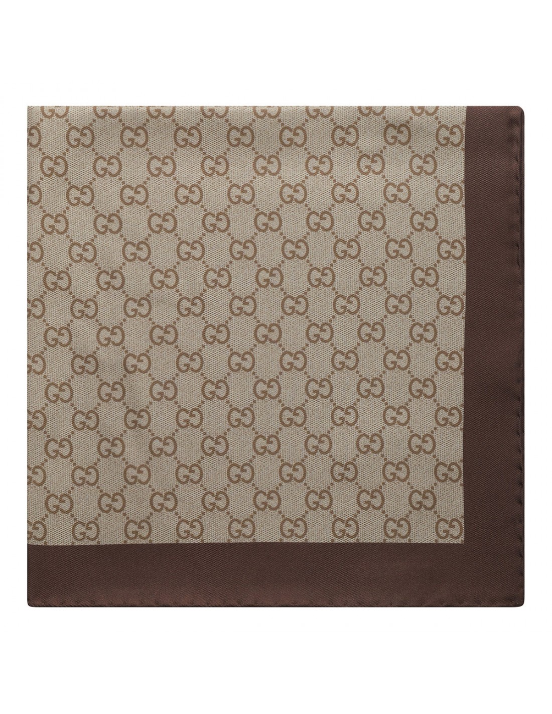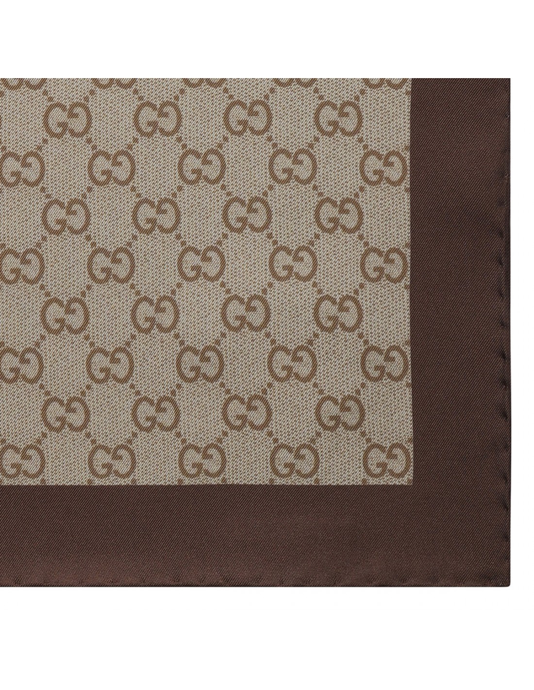 Brown and light brown silk twill carré from Gucci featuring allover GG print and brown borders. (W55cm x L55cm)