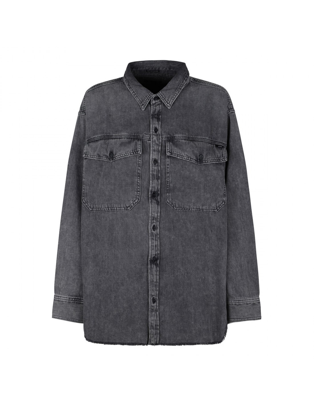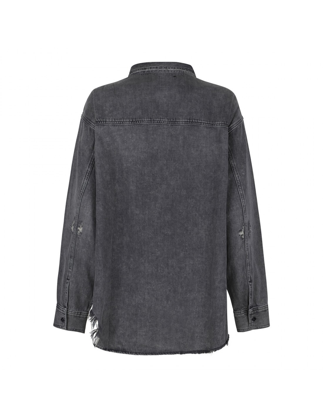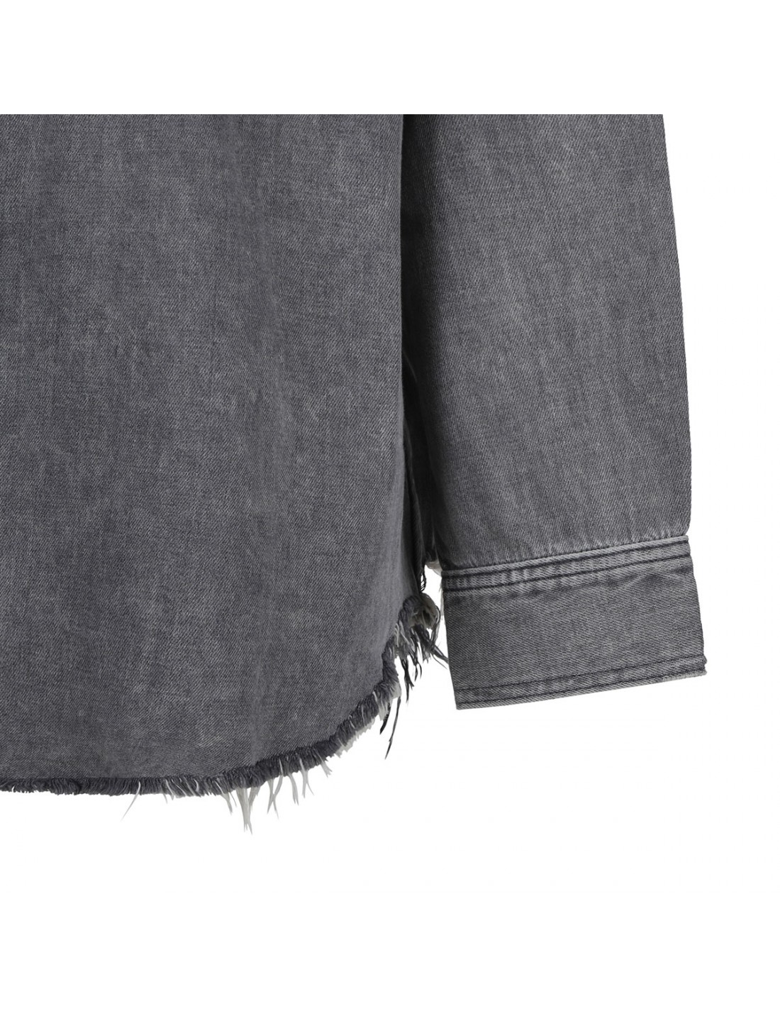 Faded dark gray denim cotton The Lazy Sunday shirt from Mother featuring extra-large buttoned flap pockets at chest, dropped shoulders, frayed and curved hem, oversized silhouette, button closure at front, long sleeves with buttoned cuffs, pointed collar.