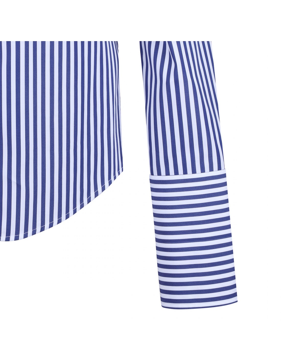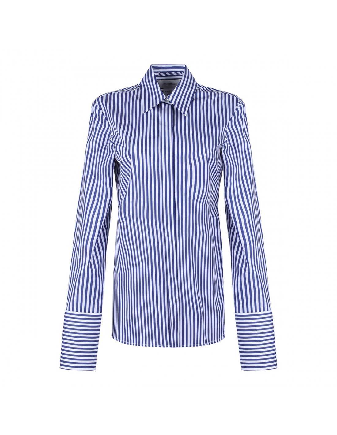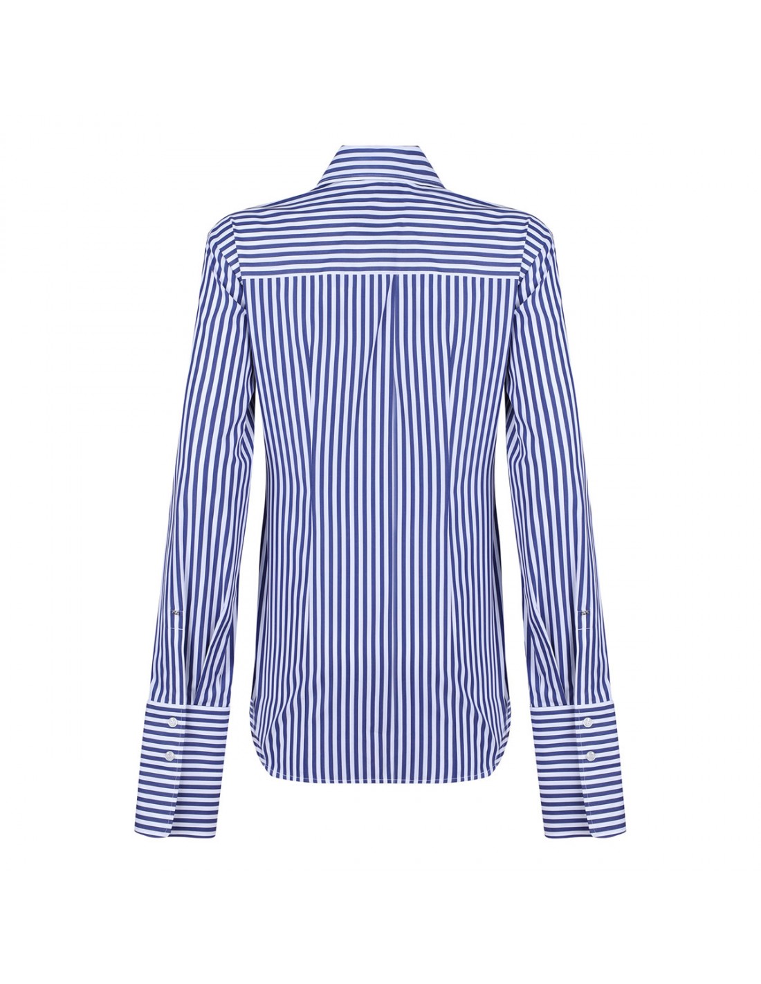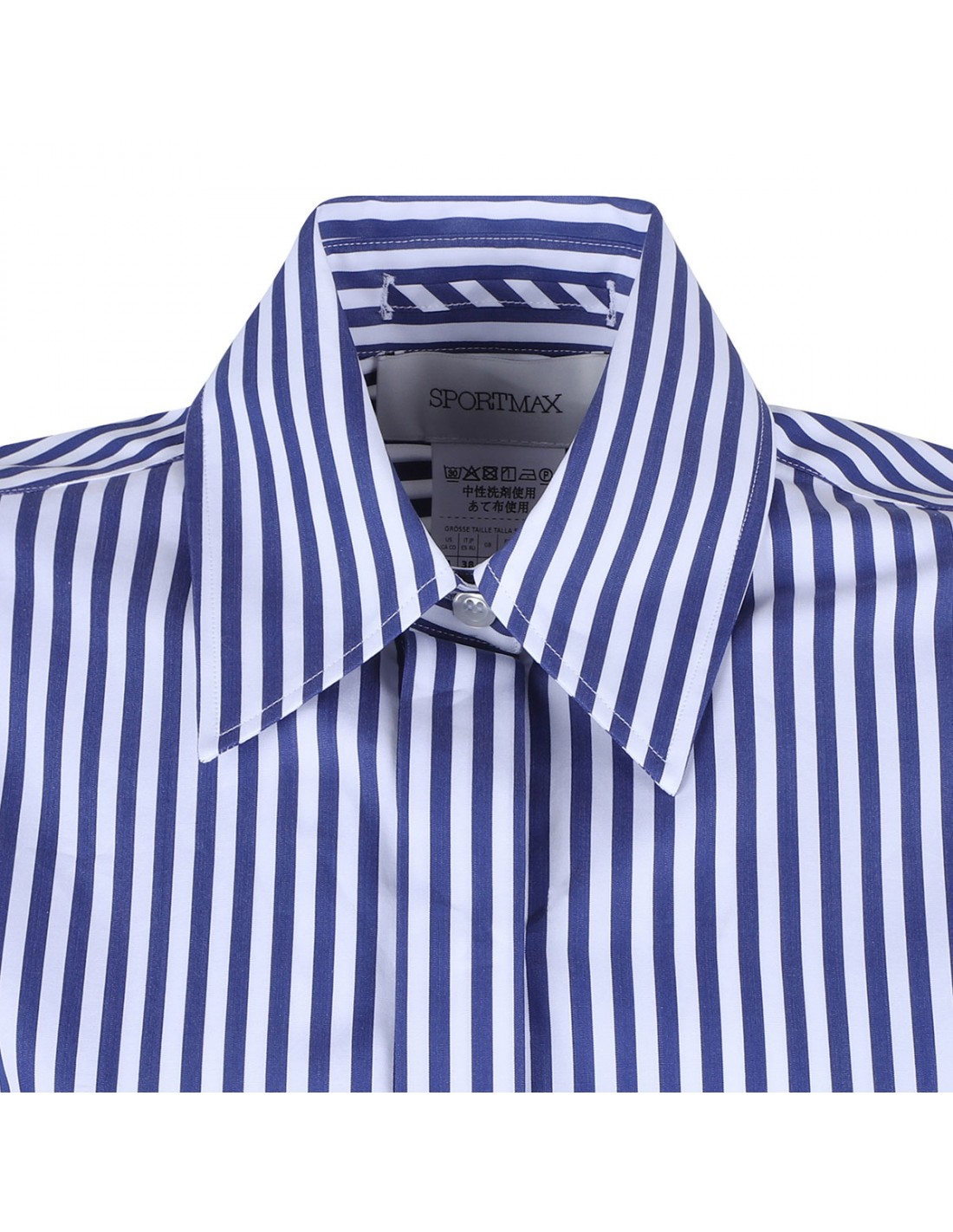 White and blue pure cotton poplin Conio shirt from Sportmax featuring striped motif, concealed button closure, long sleeves with double-height cuffs, fitted silhouette, yokes on shoulders, pointed collar and rounded hem.