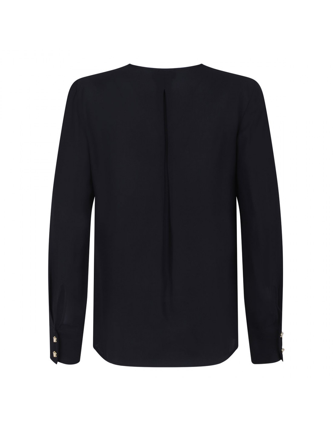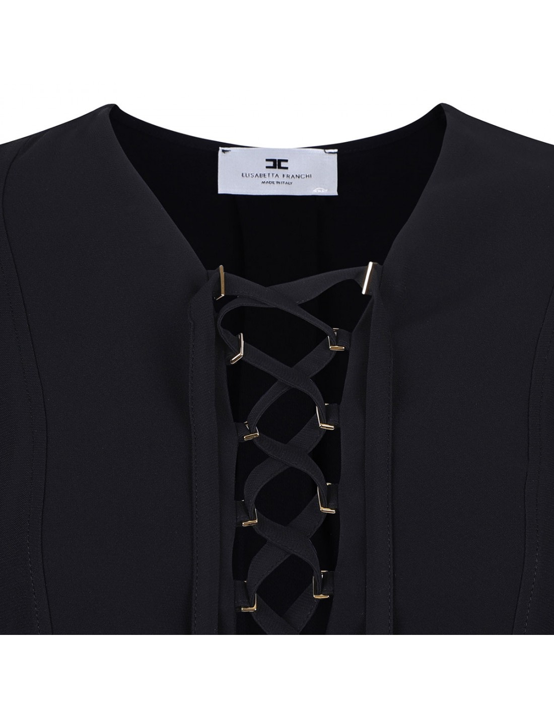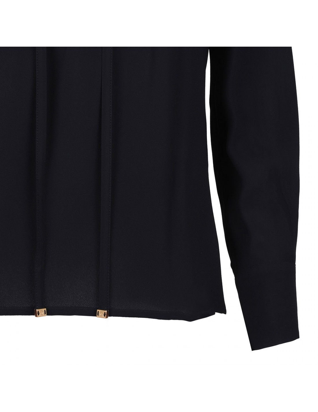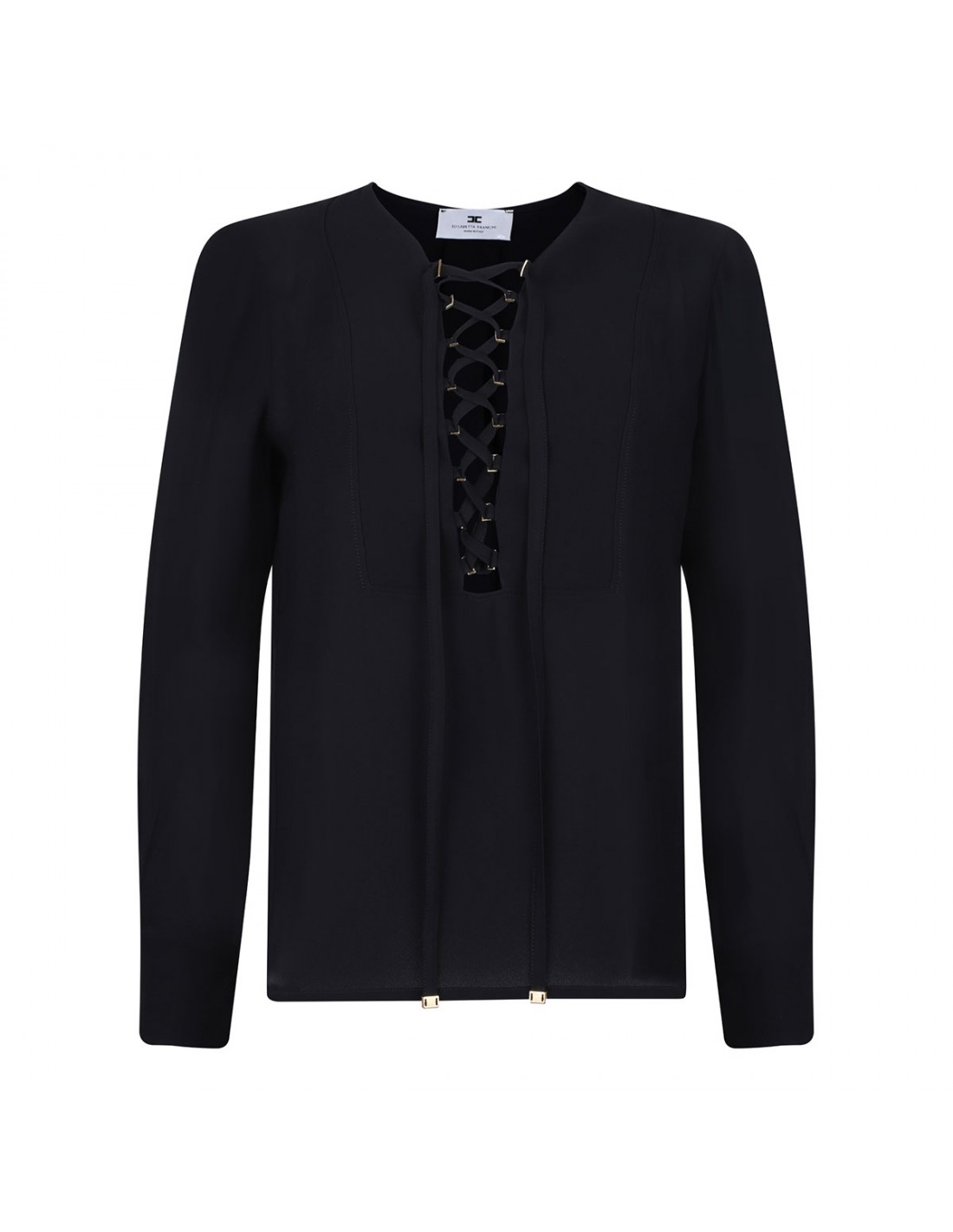 Black georgette blouse from Elisabetta Franchi featuring lace-up neck with square rings, long sleeves with buttoned cuffs, relaxed silhouette.