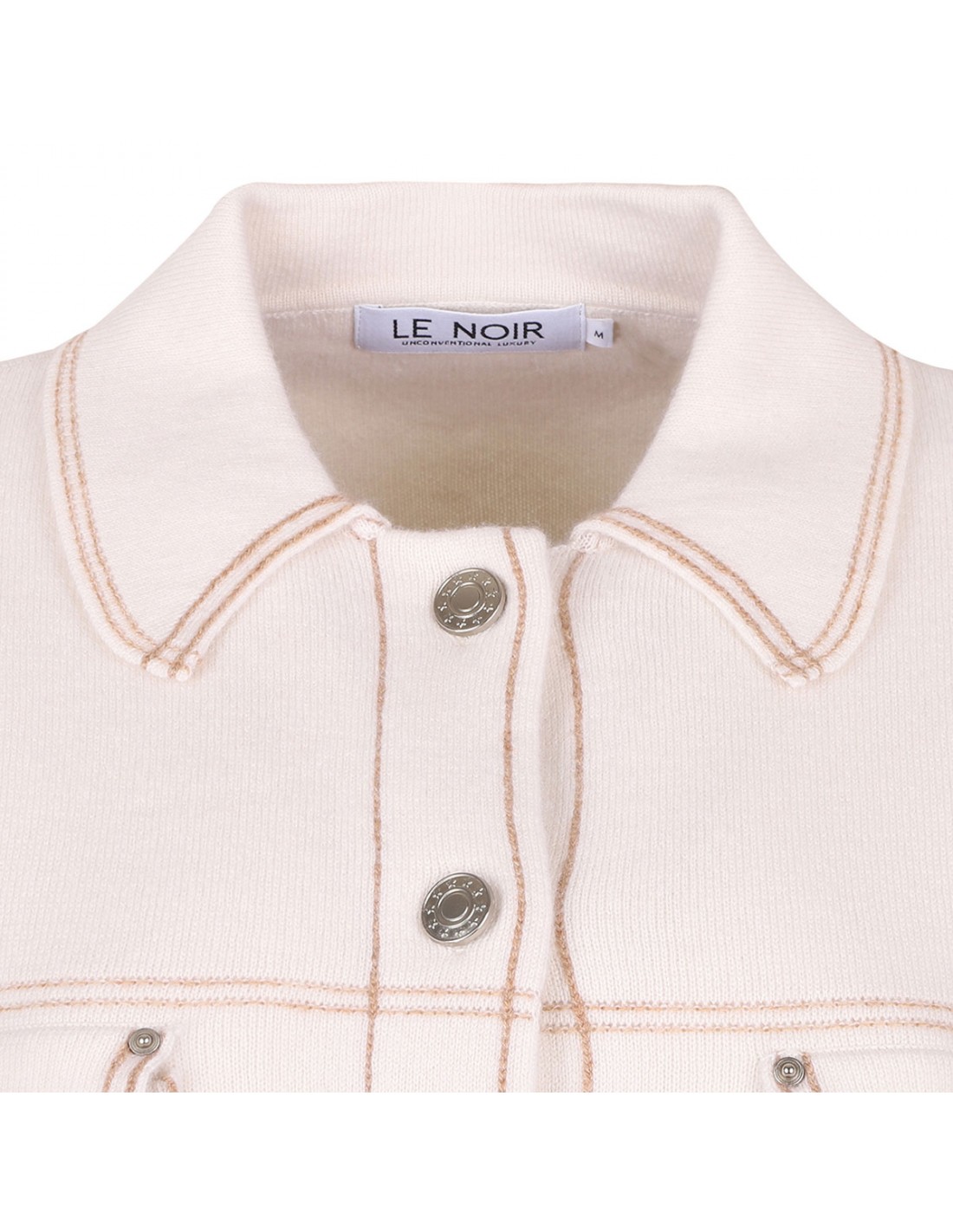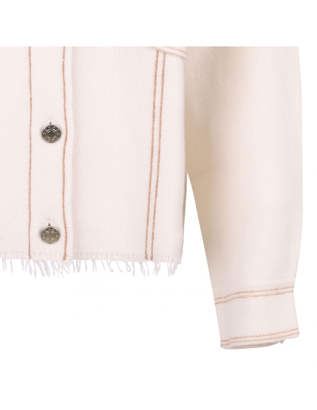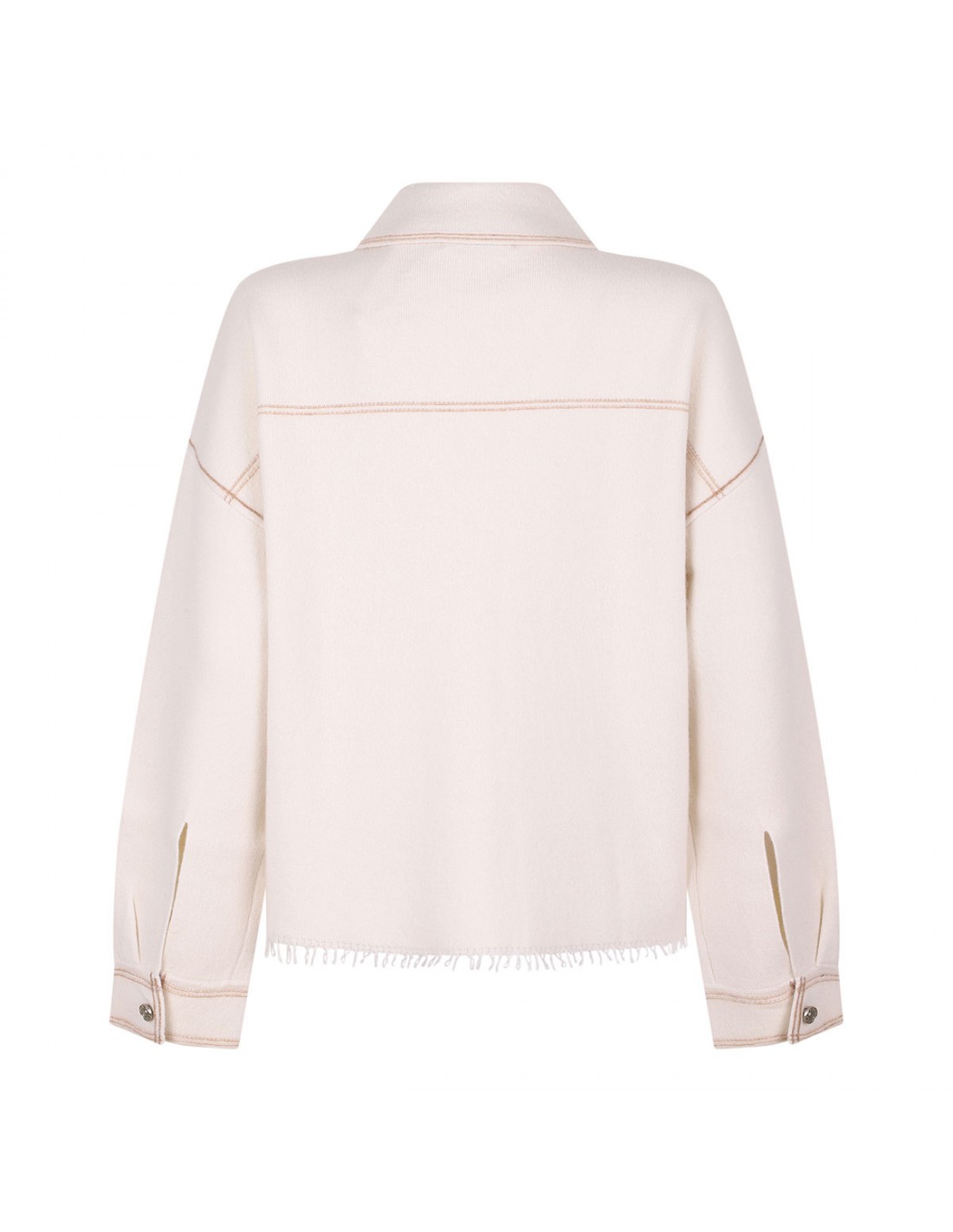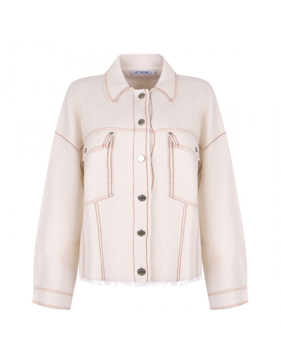 Ecru cashmere Levo overshirt from Le Noir featuring contrasting camel stitching, pointed collar, long sleeves with buttoned cuffs, dropped shoulders, fringed hem, double buttoned flap pocket on chest.
