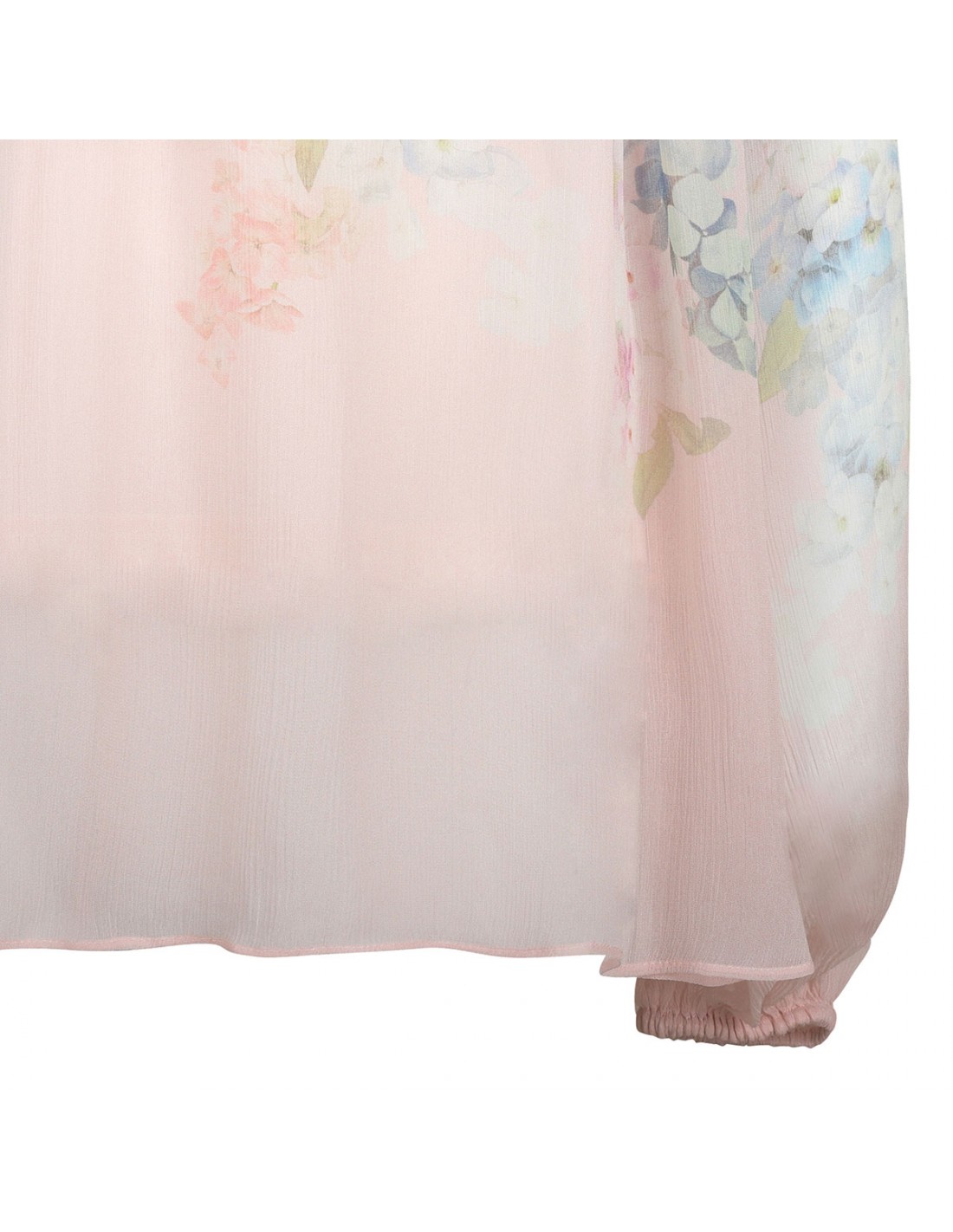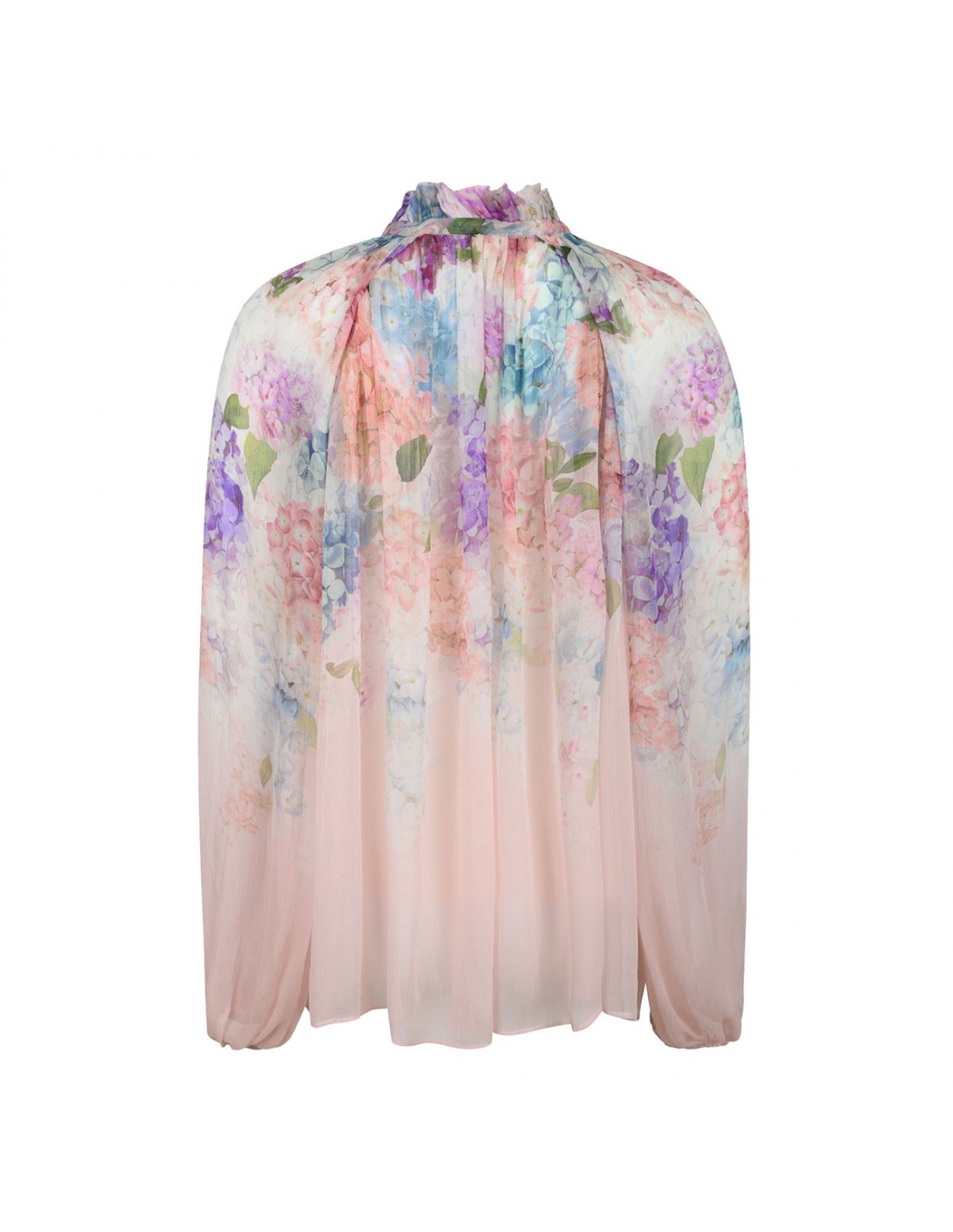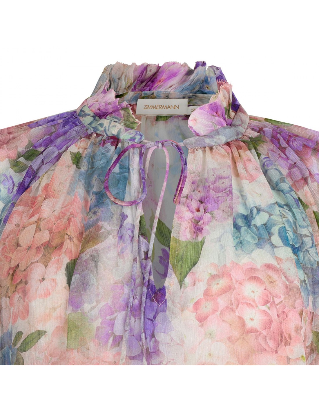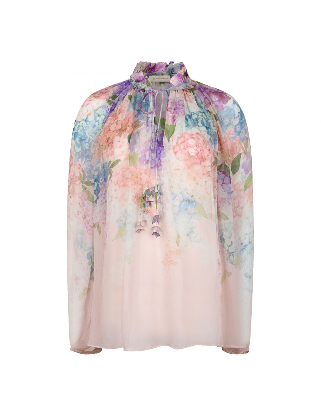 Multicolor viscose Dawning billow blouse from Zimmermann featuring hydrangea motif, long blouson sleeves with elasticated cuffs, gathered at front and back, stand collar with self rouleau tie at neckline with flower trim, relaxed silhouette.