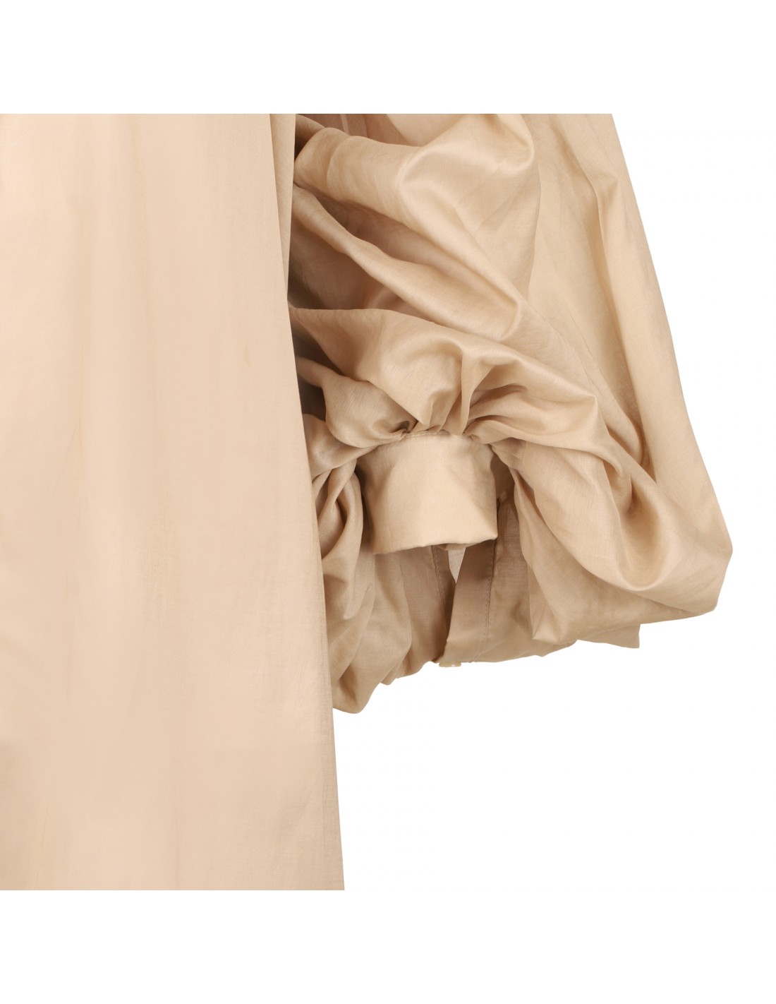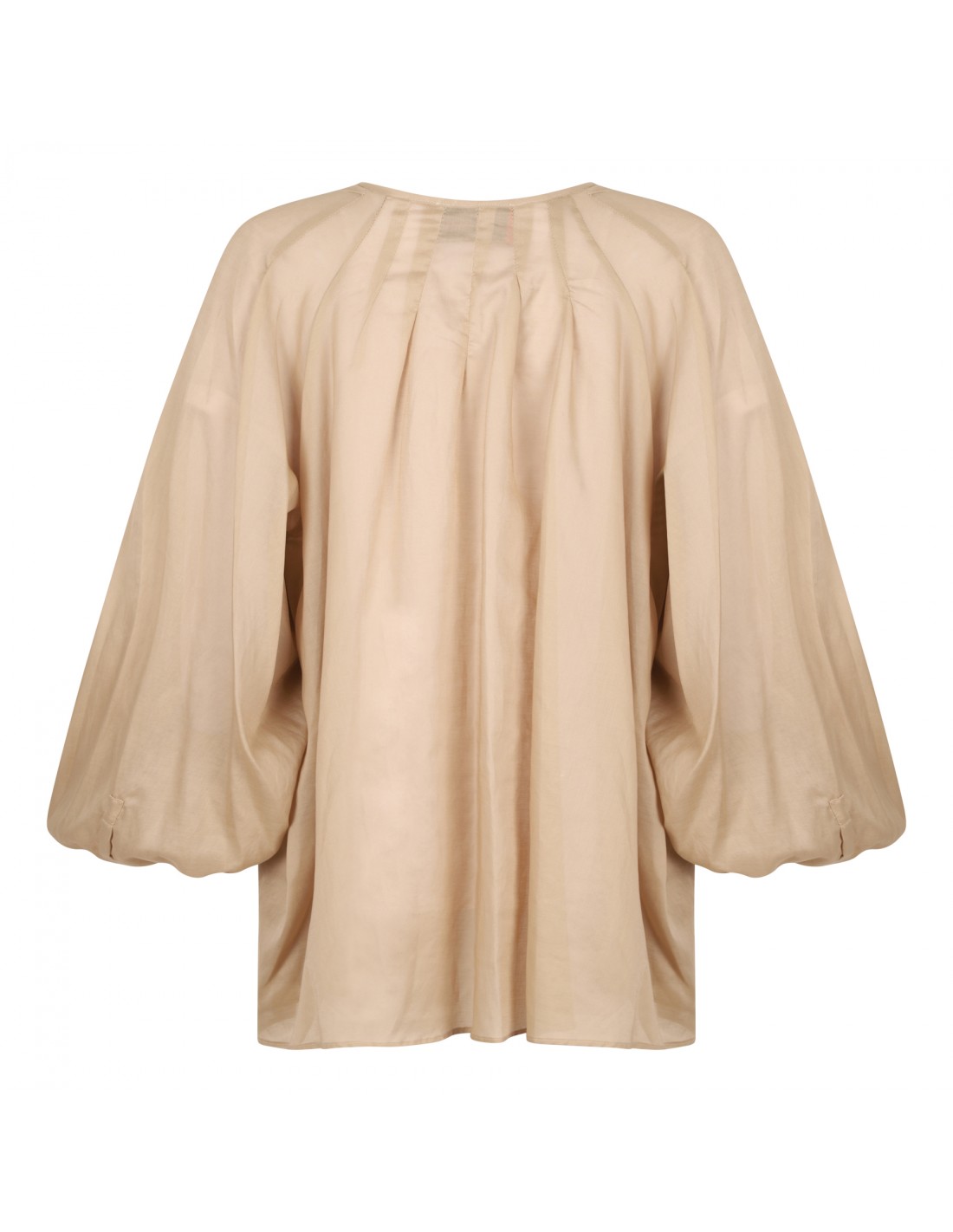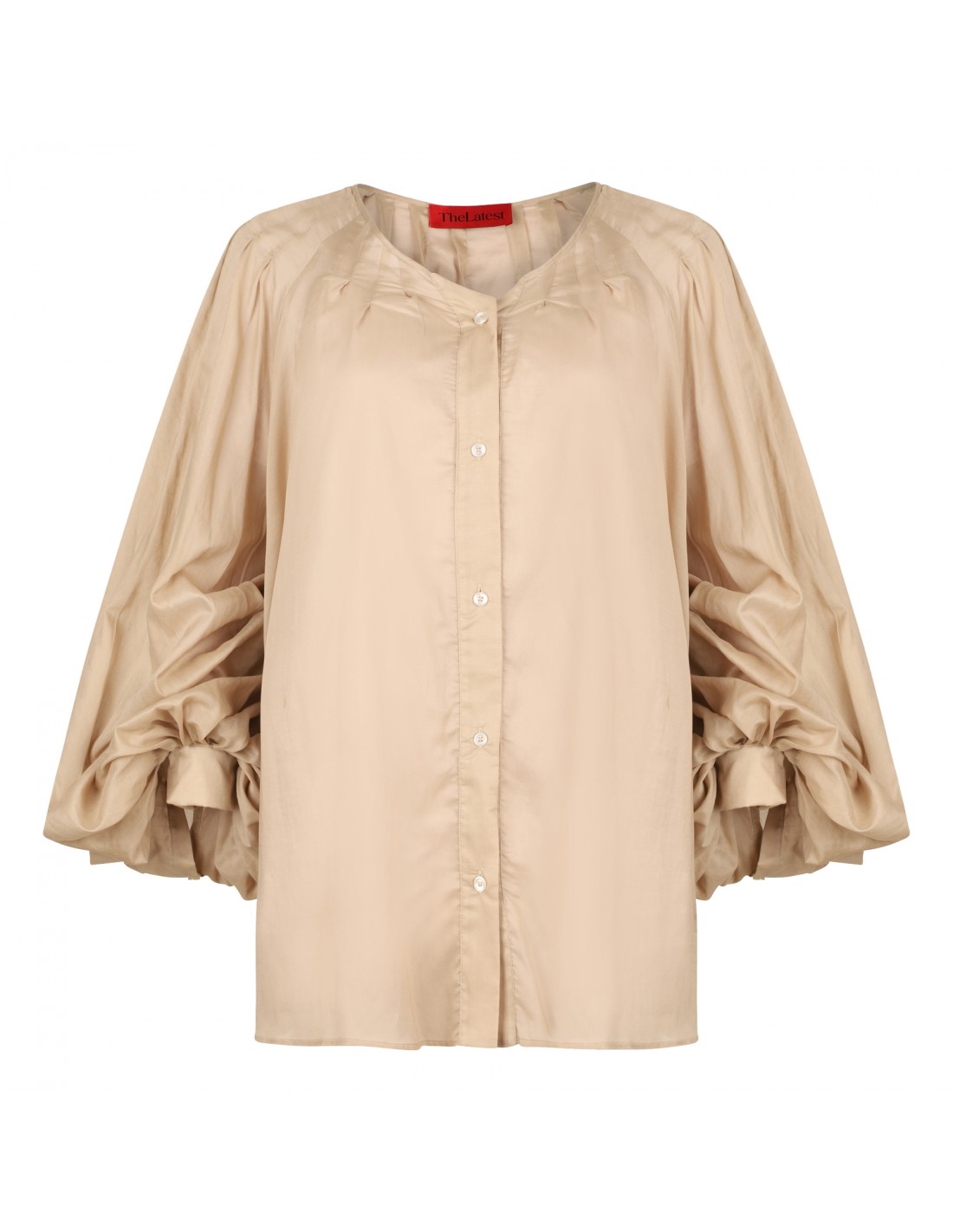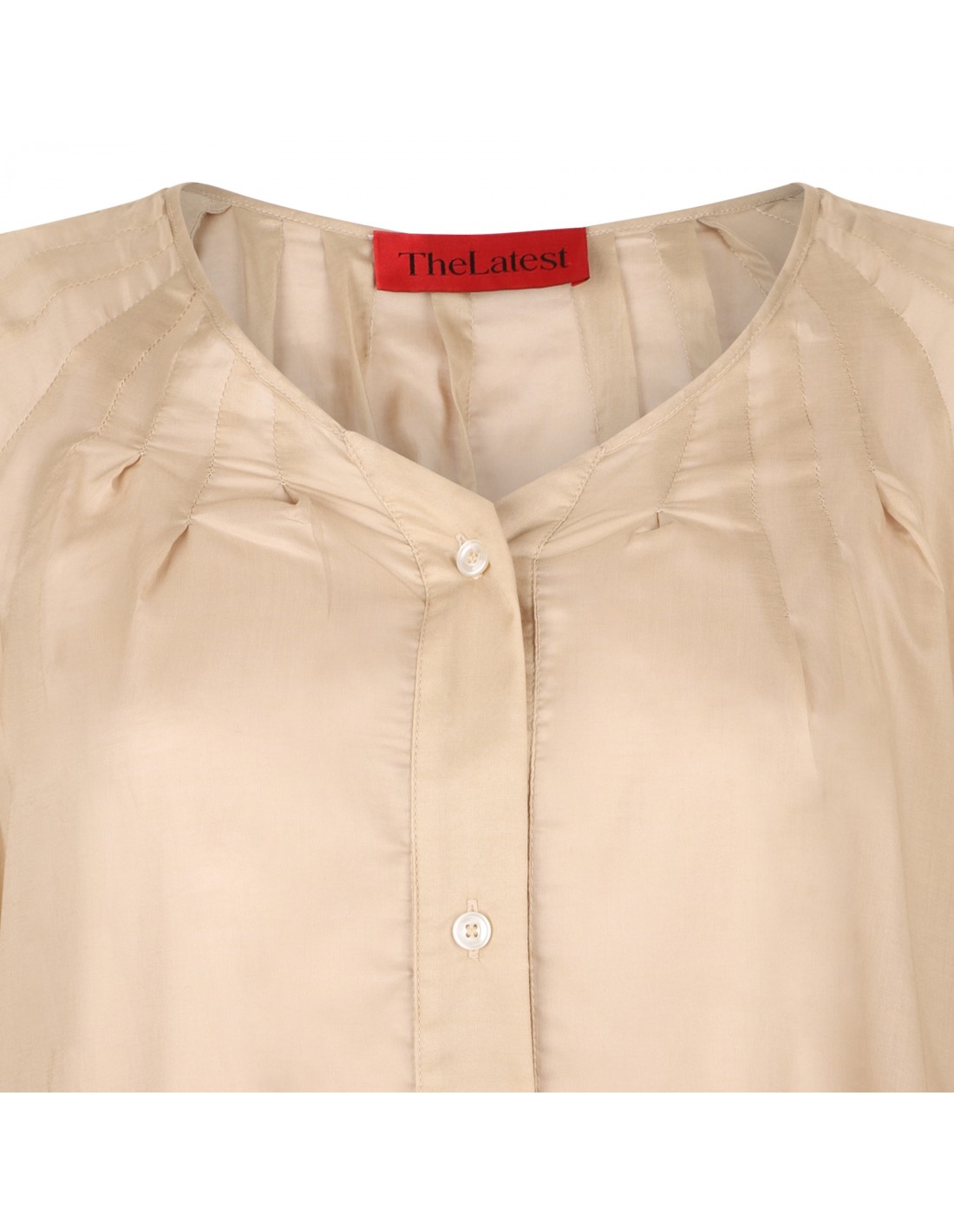 Sand lightweight cotton blend Biro blouse from The Latest featuring crew collar, button closure on front, pleats, wide long sleeves with buttoned cuffs, two side seam pockets and oversized fit.