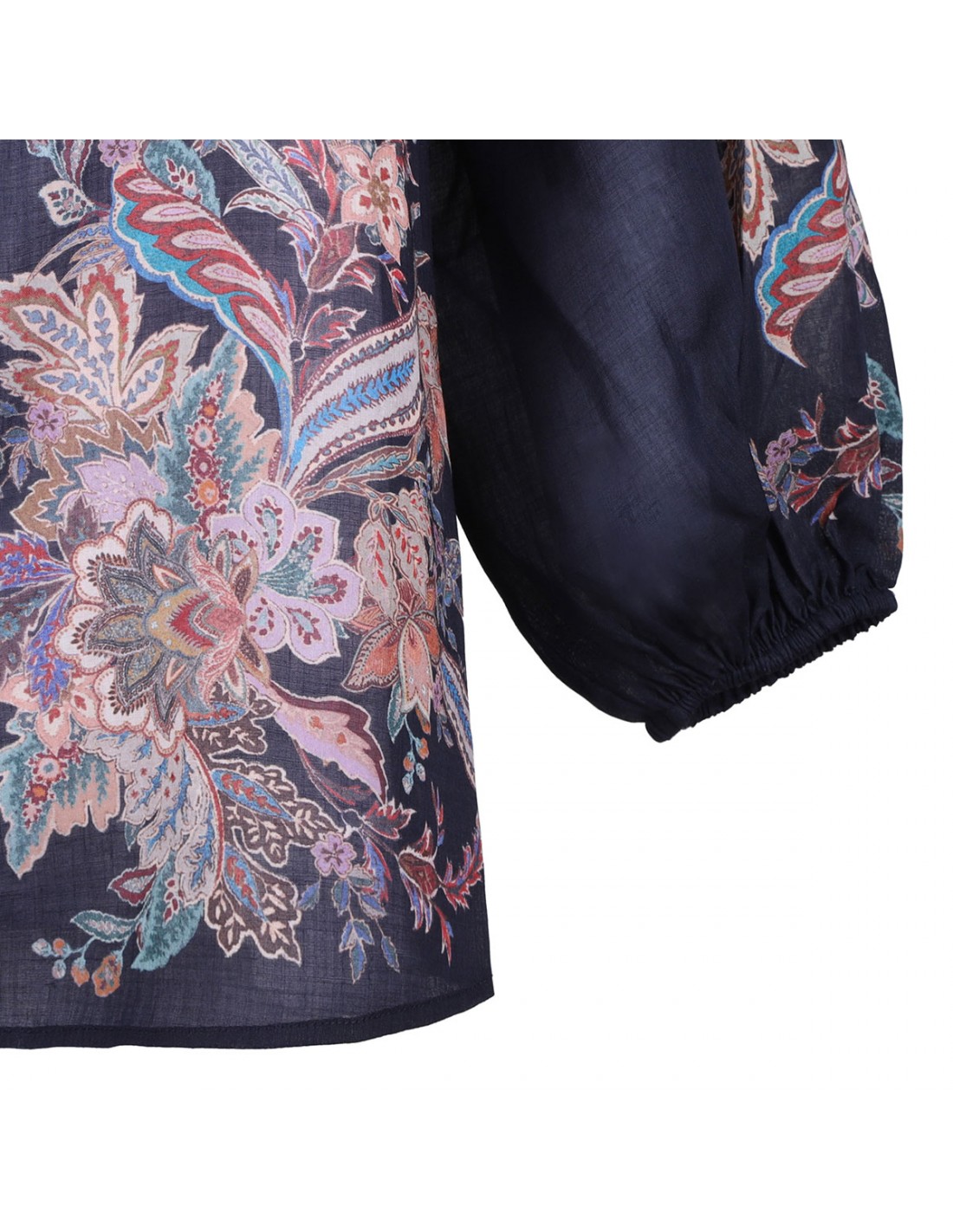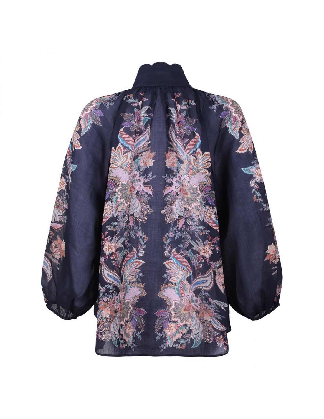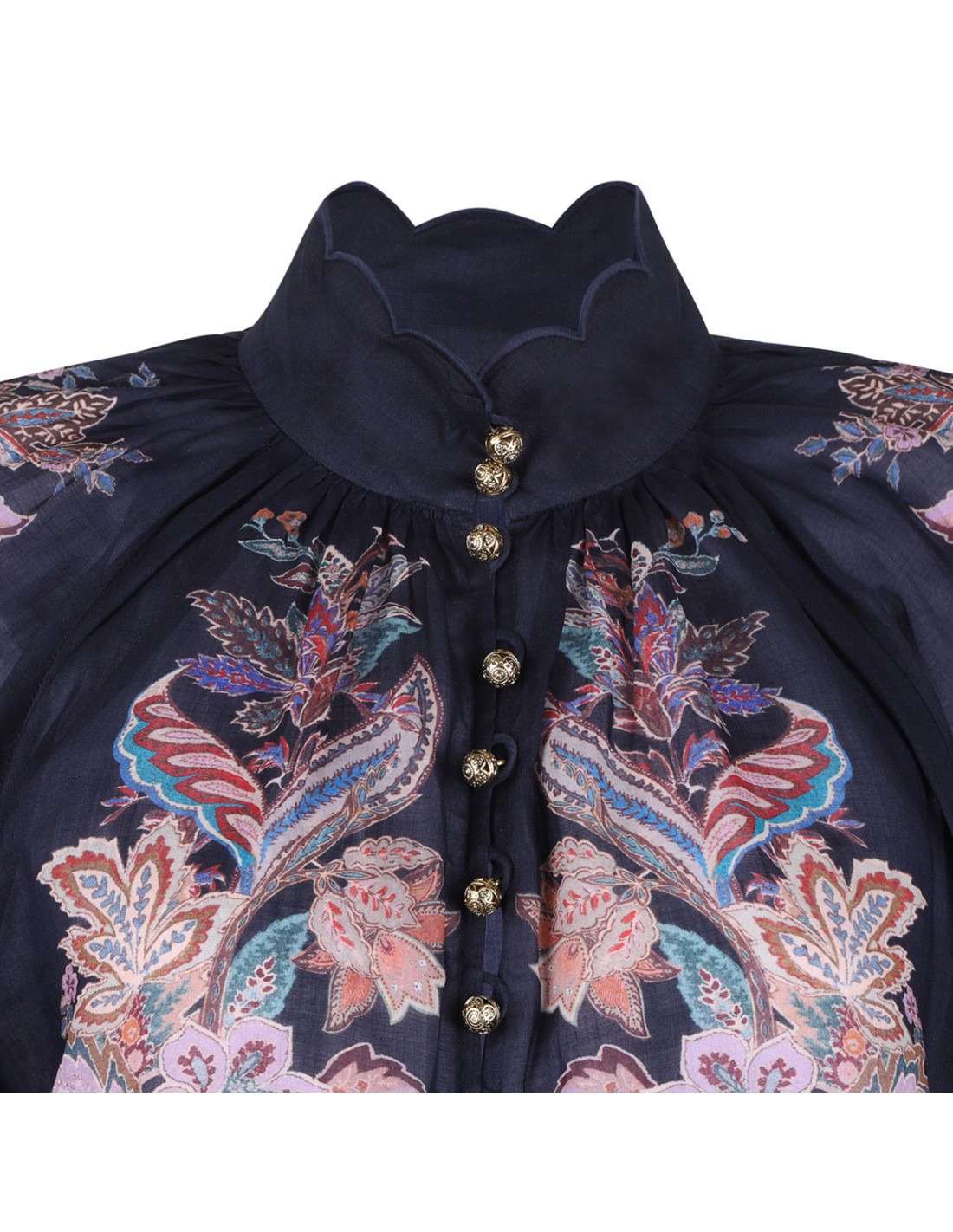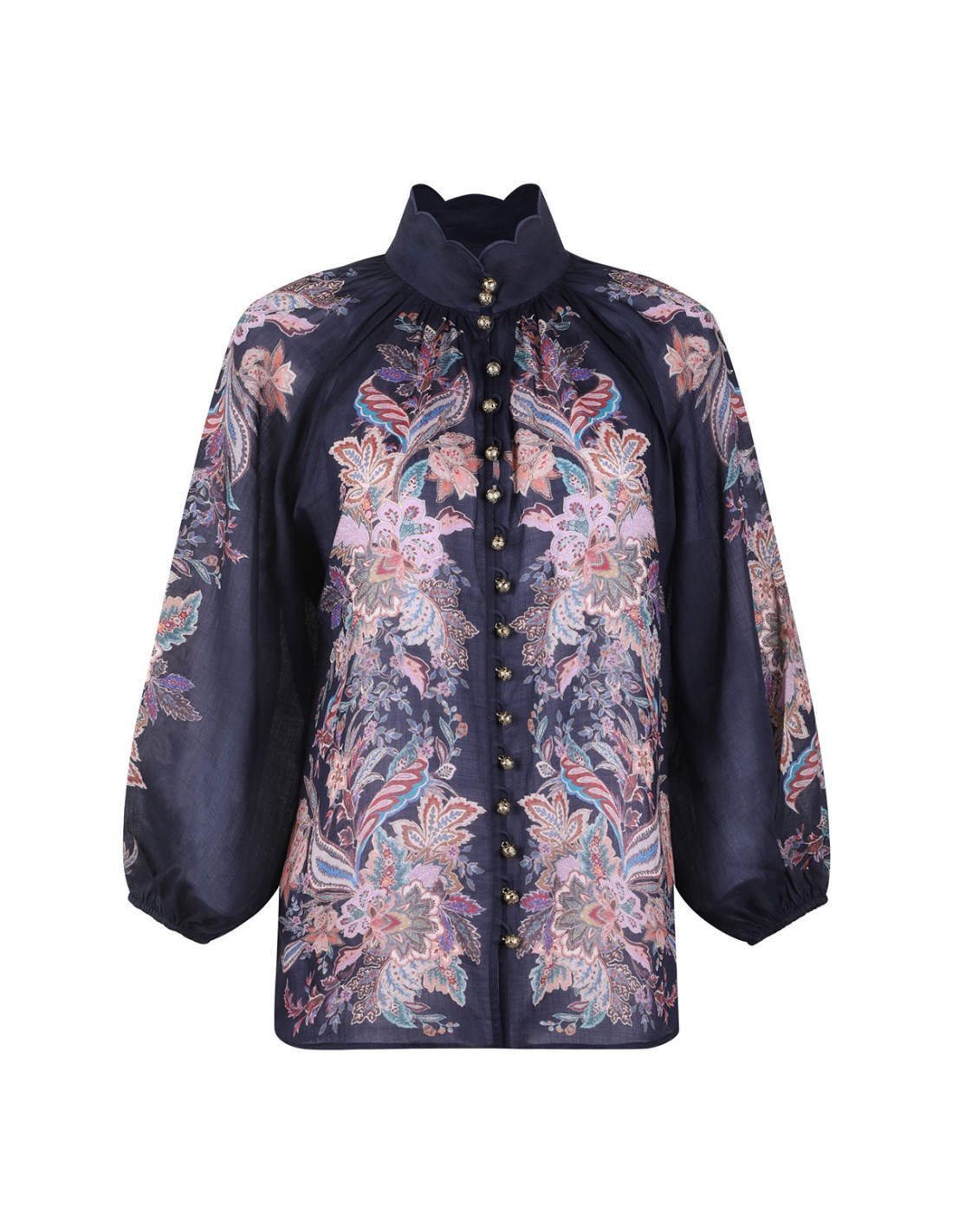 Navy ramie Rhiannon billow blouse from Zimmermann featuring multicolor paisley motif, long billowy sleeves with elastic cuffs, gold bell buttons on front, scalloped edge at stand collar.