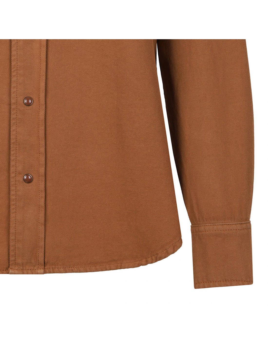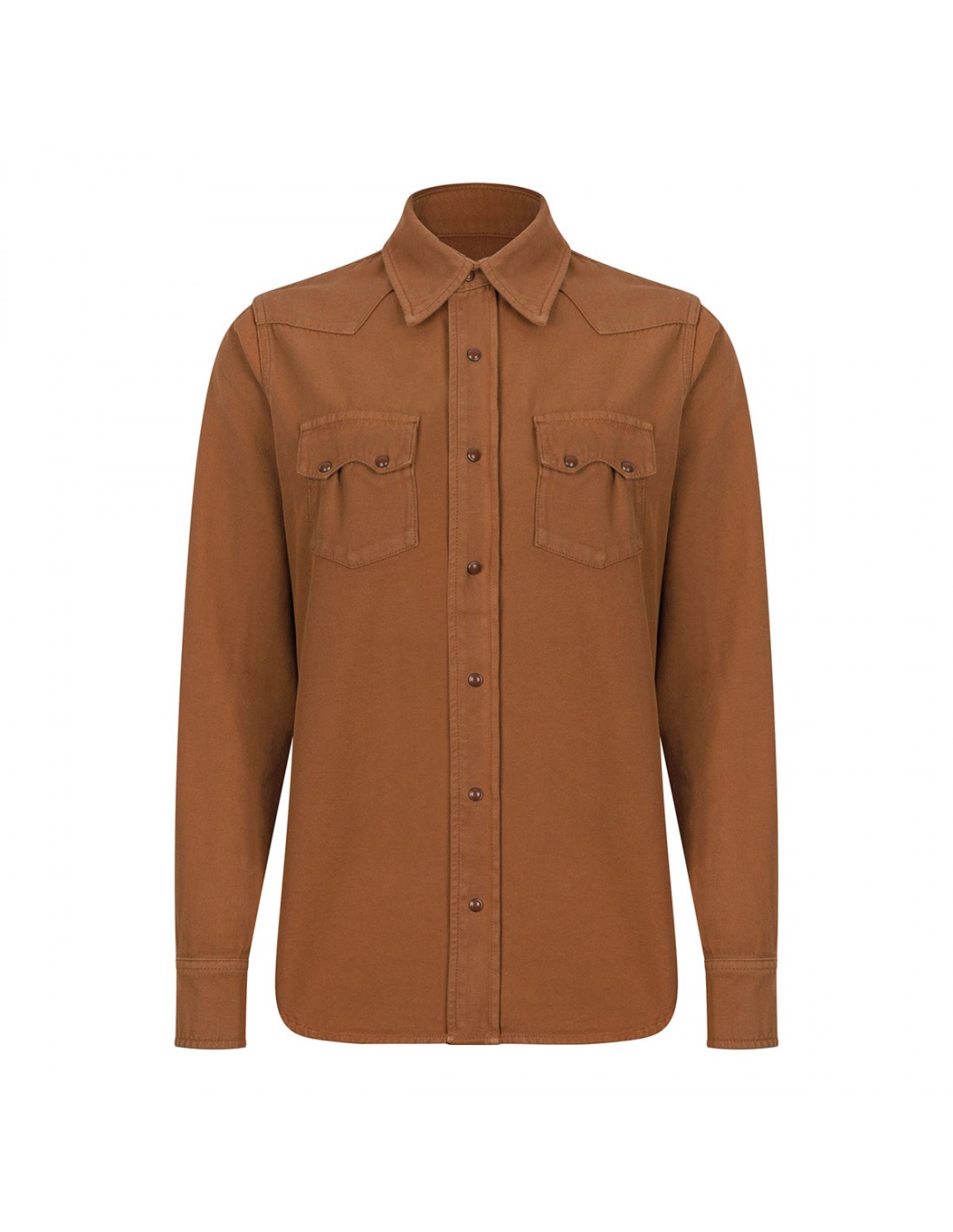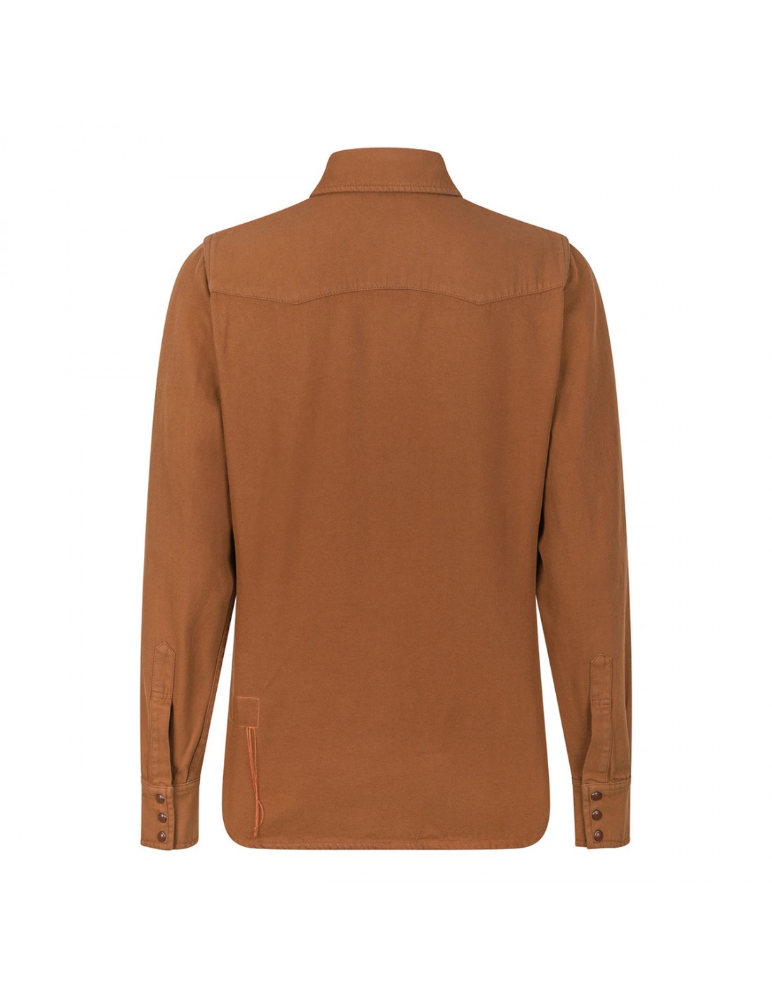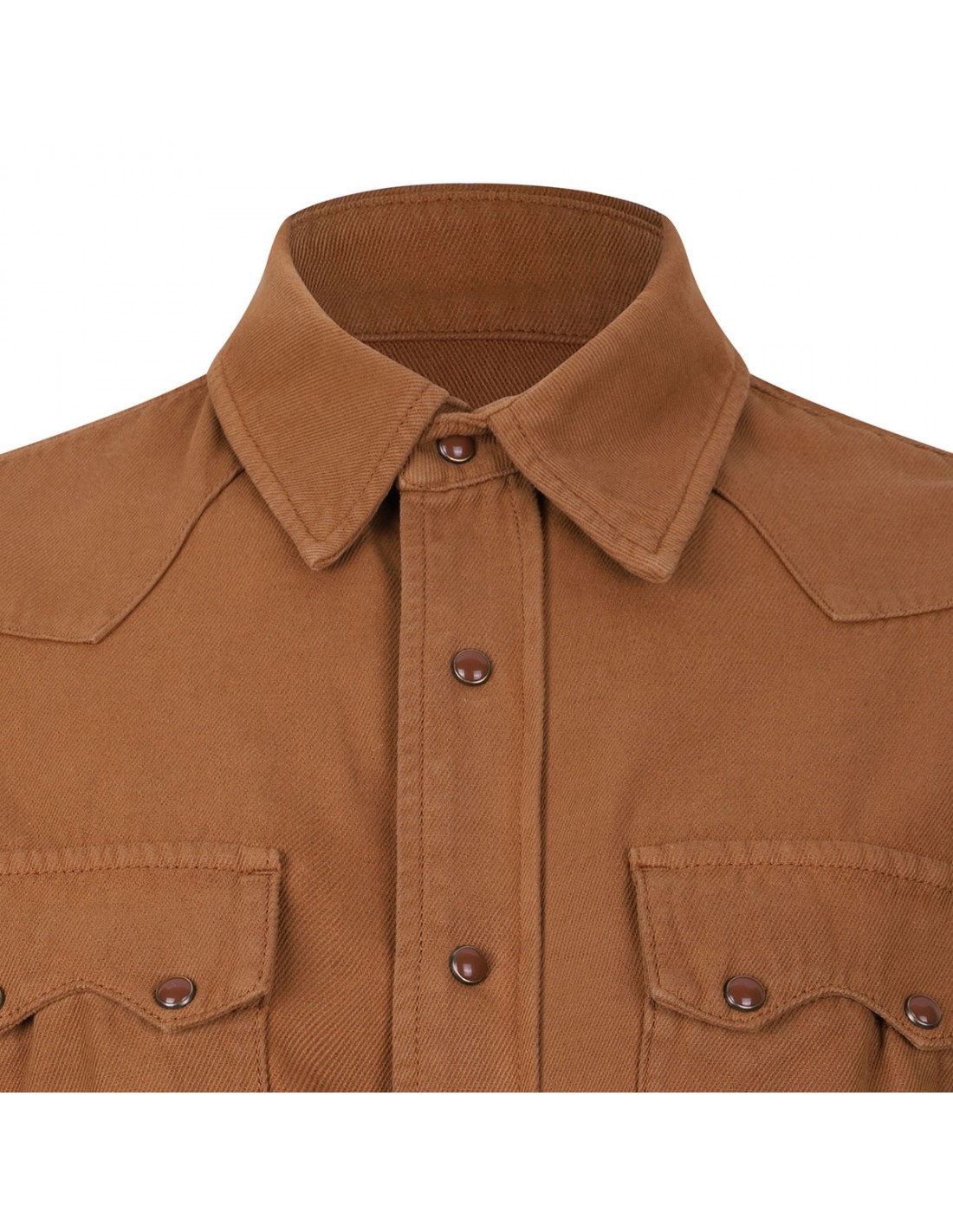 Coffee brushed wool Toledo Texan shirt from Fortela featuring chest buttoned flap pockets, oversized silhouette, yoke applied front and back, button fastening along front, pointed collar, long sleeves with buttoned cuffs.