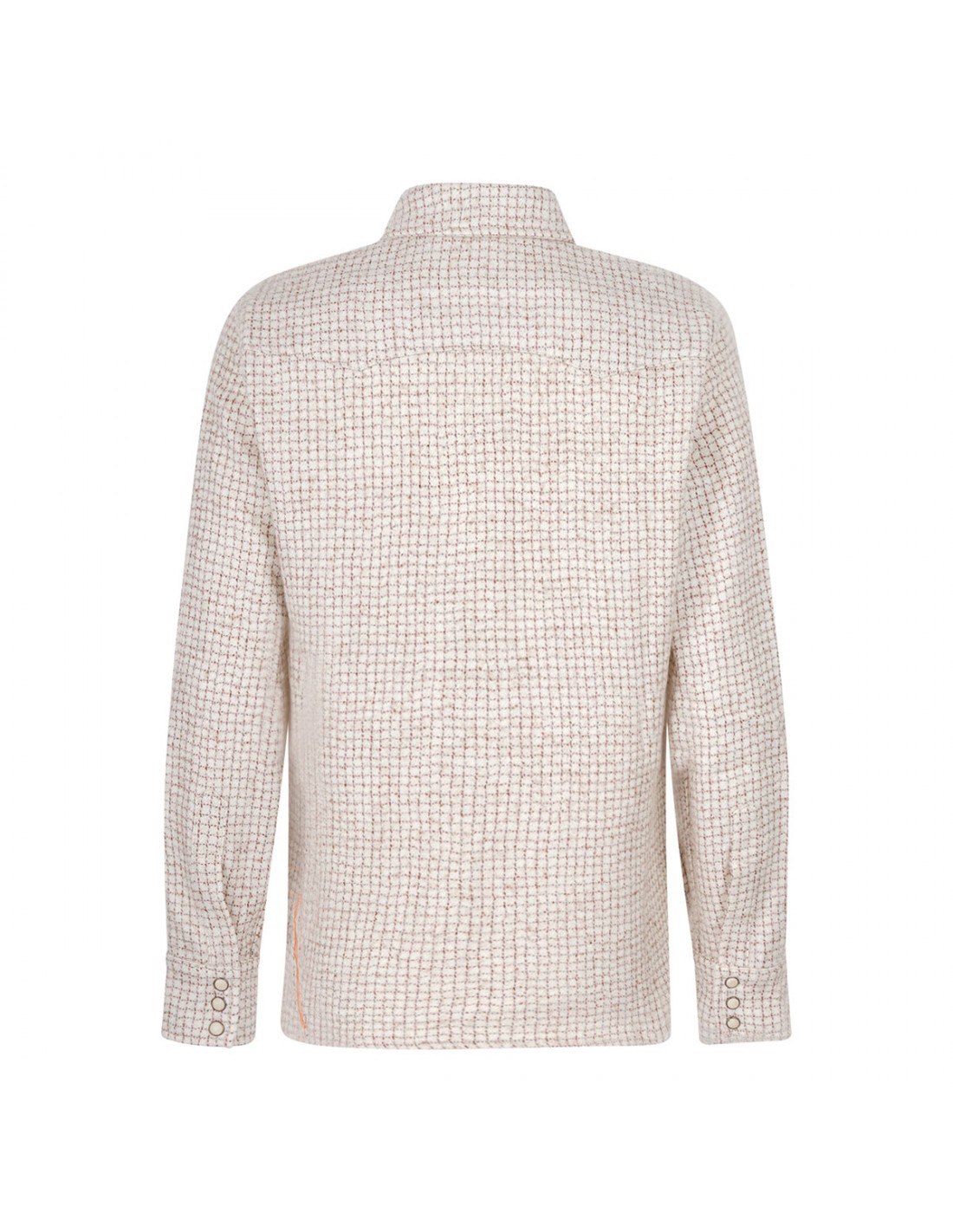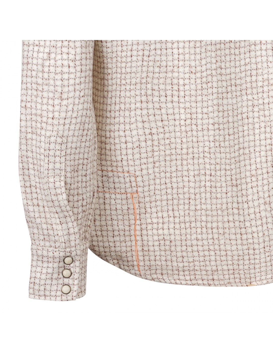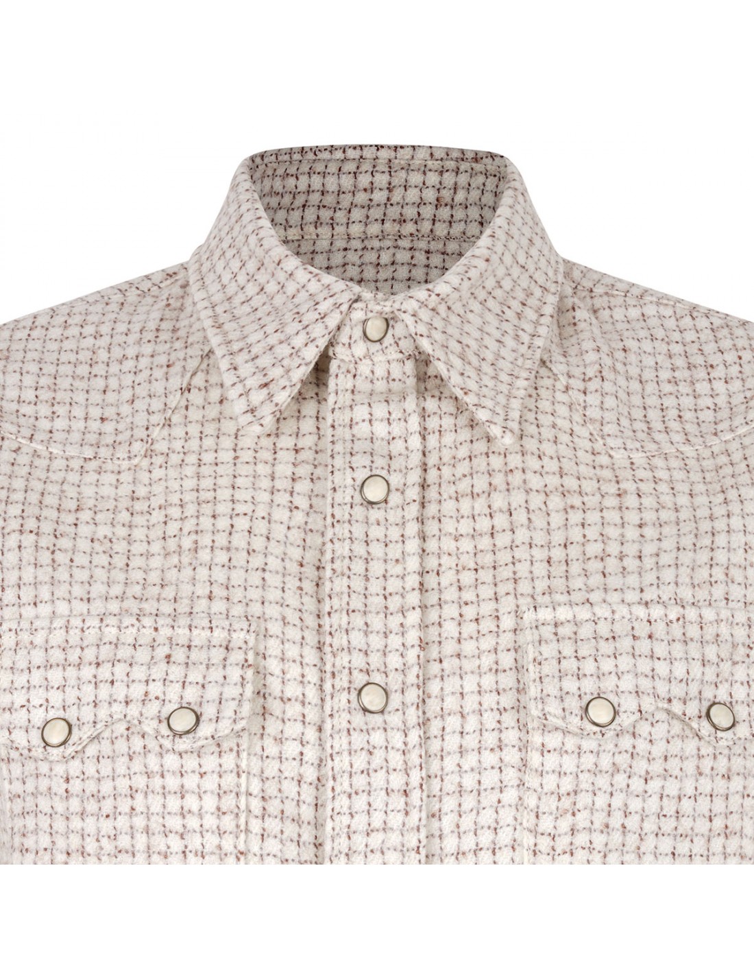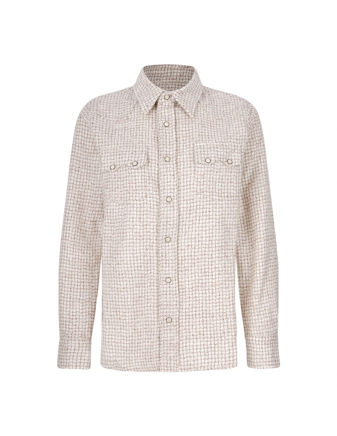 Beige brushed wool Toledo Texan shirt from Fortela featuring check motif, chest buttoned flap pockets, oversized silhouette, yoke applied front and back, button fastening along front, pointed collar, long sleeves with buttoned cuffs.