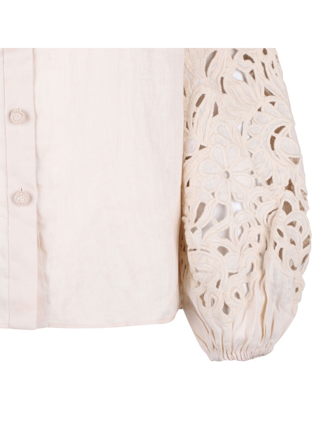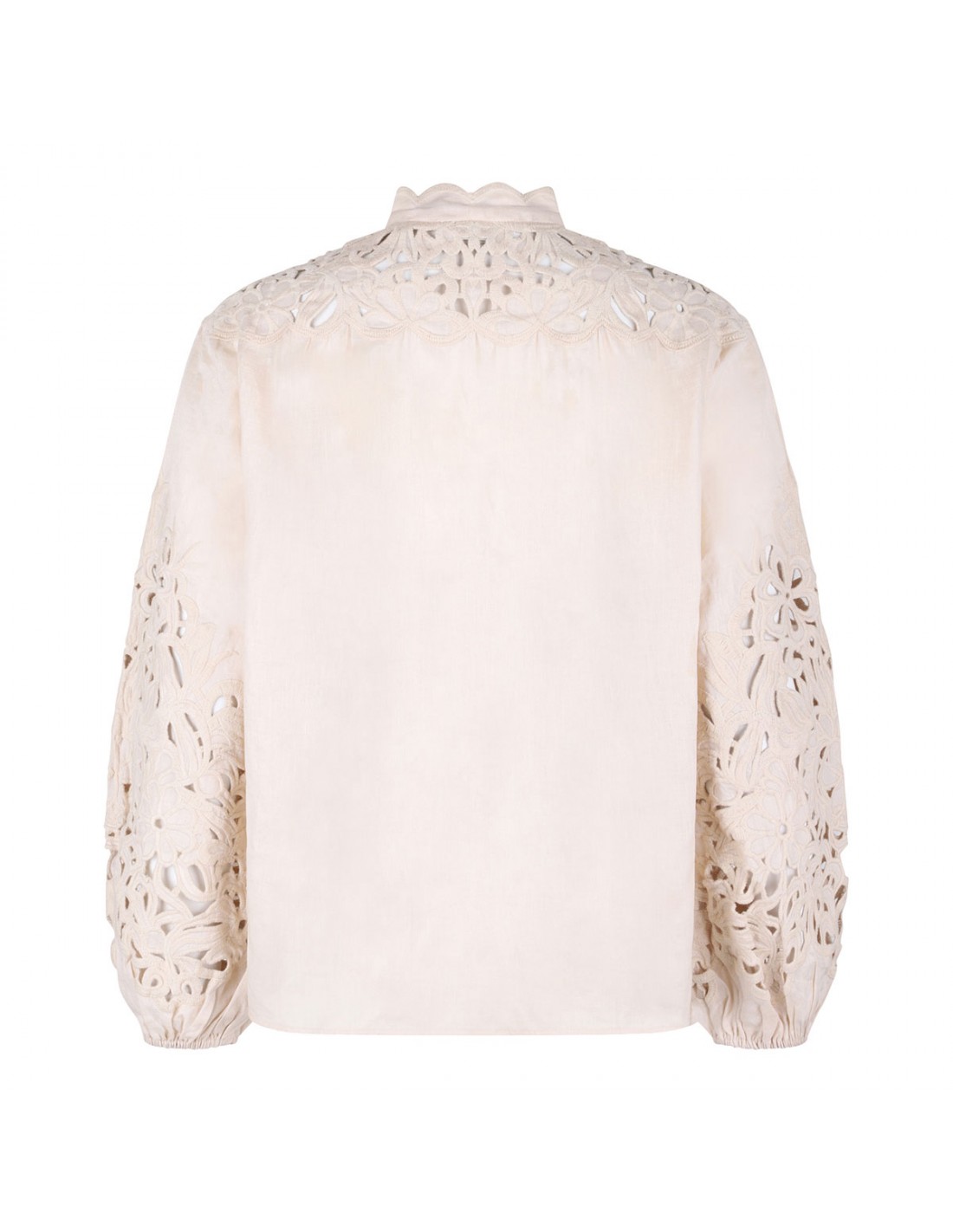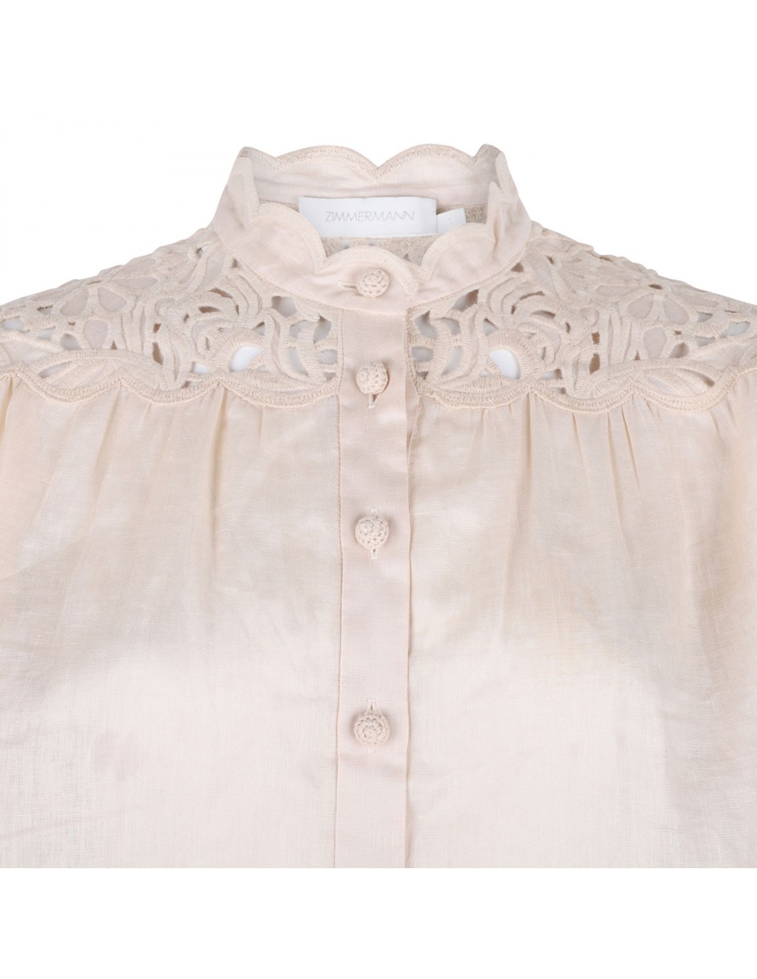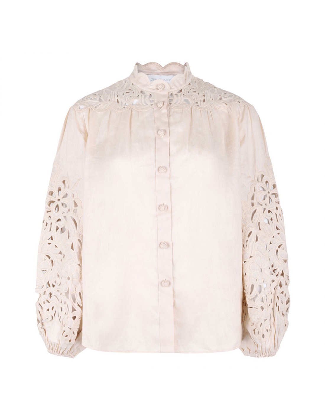 Cream linen Wylie embroidered blouse from Zimmermann featuring broderie anglaise embroidery along collar and sleeves, stand collar, long balloon sleeves with elastic cuffs, button closure on front.