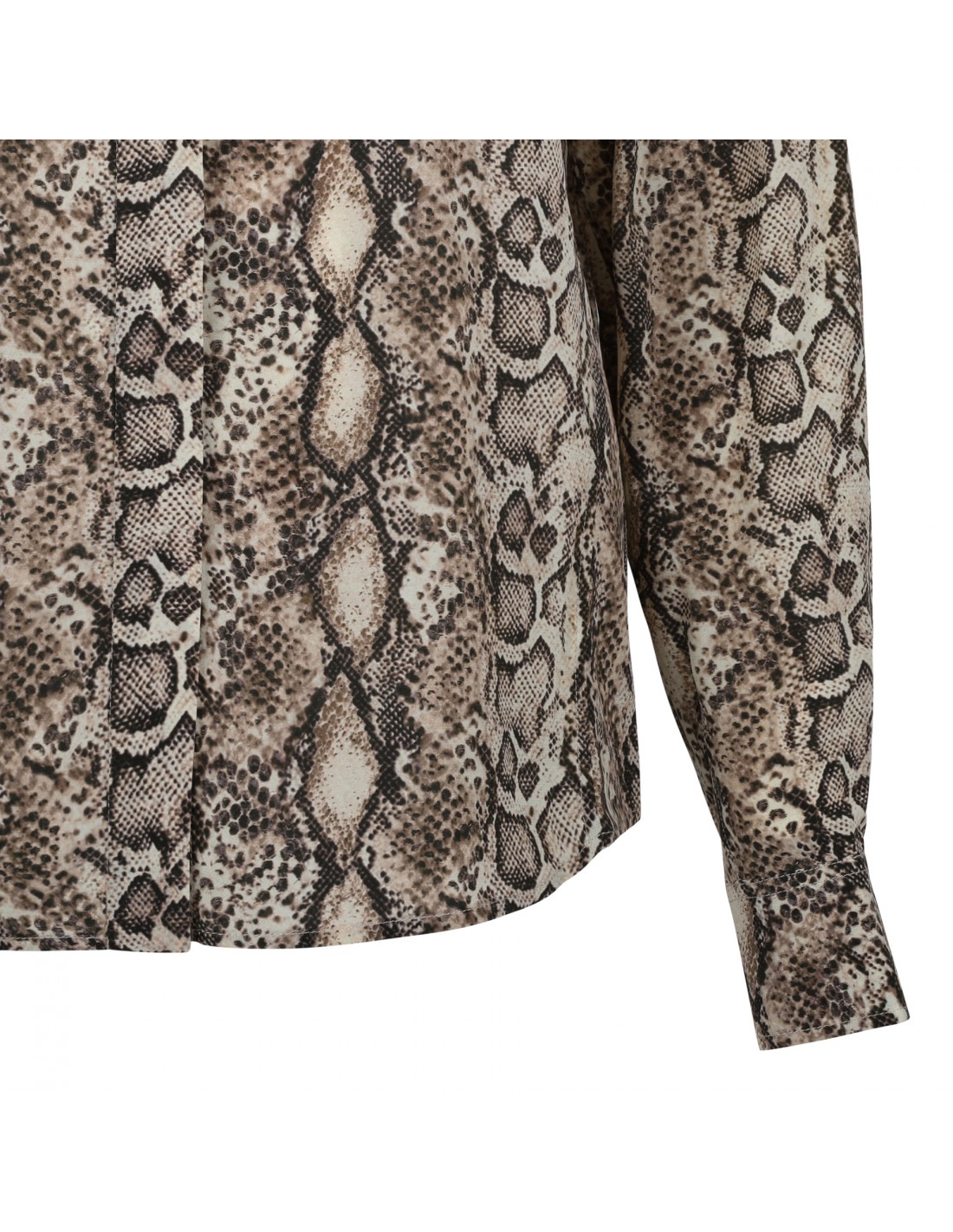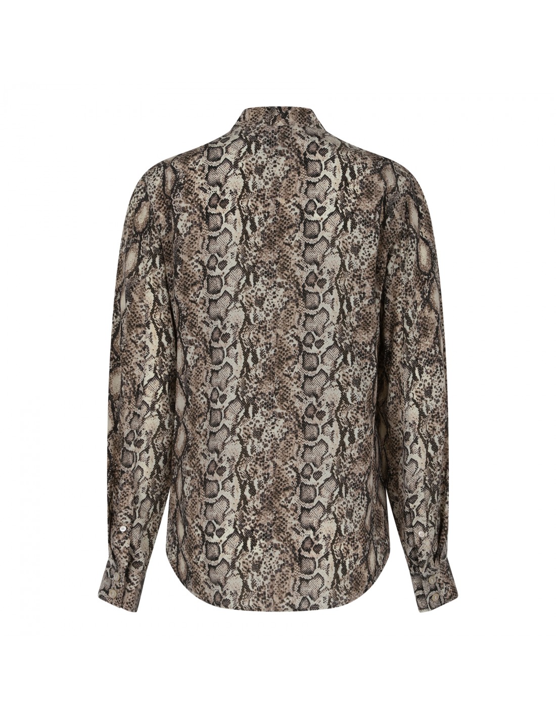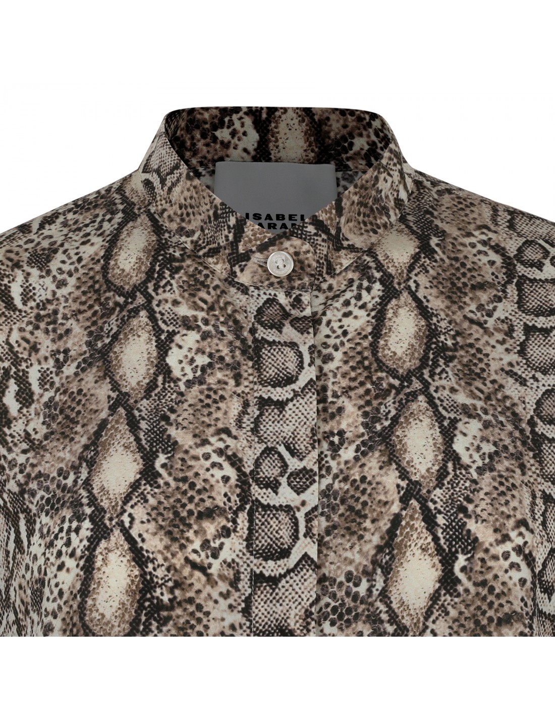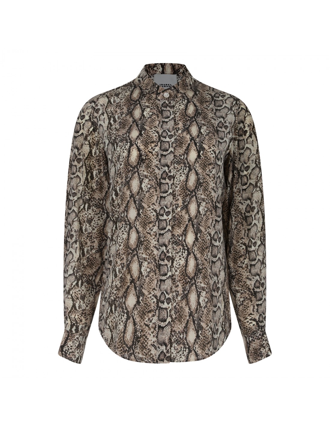 Natural, black and beige silk Ilda shirt from Isabel Marant featuring animalier printed motif allover, stand-up collar, concealed button fastening, shoulder yokes, curved hem, long sleeves with buttoned cuffs.