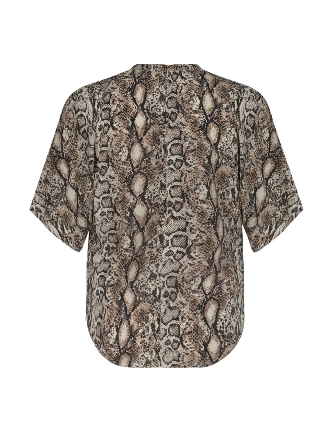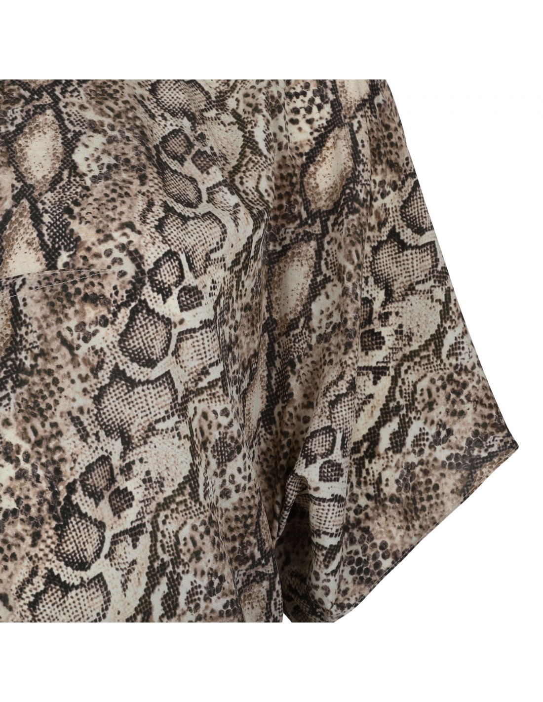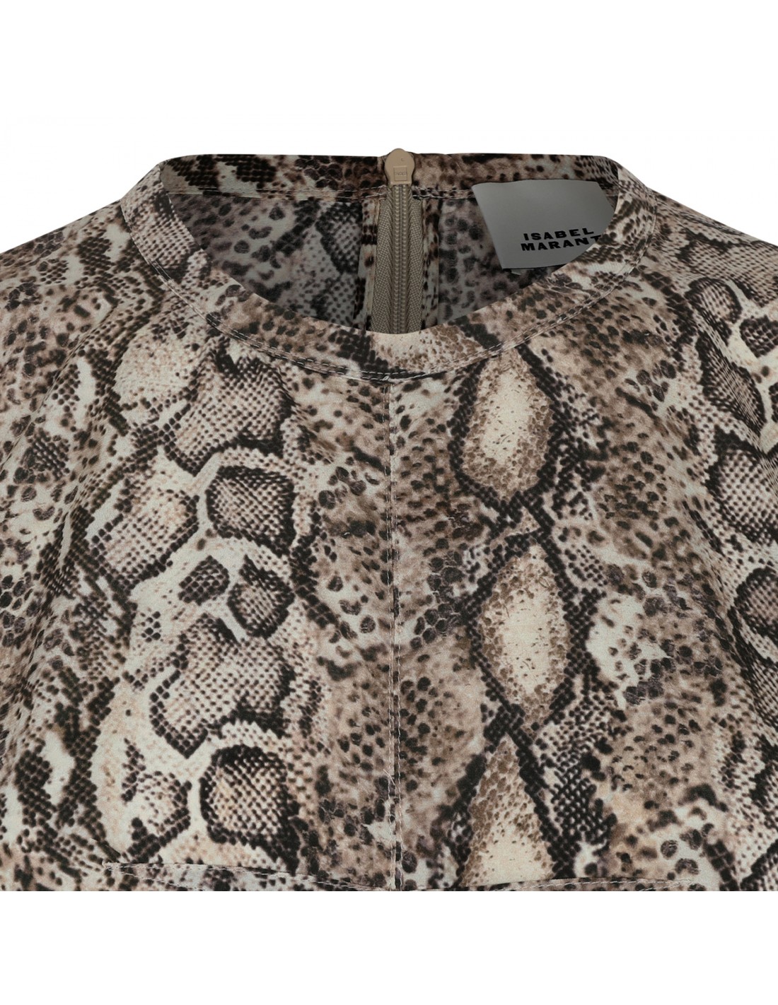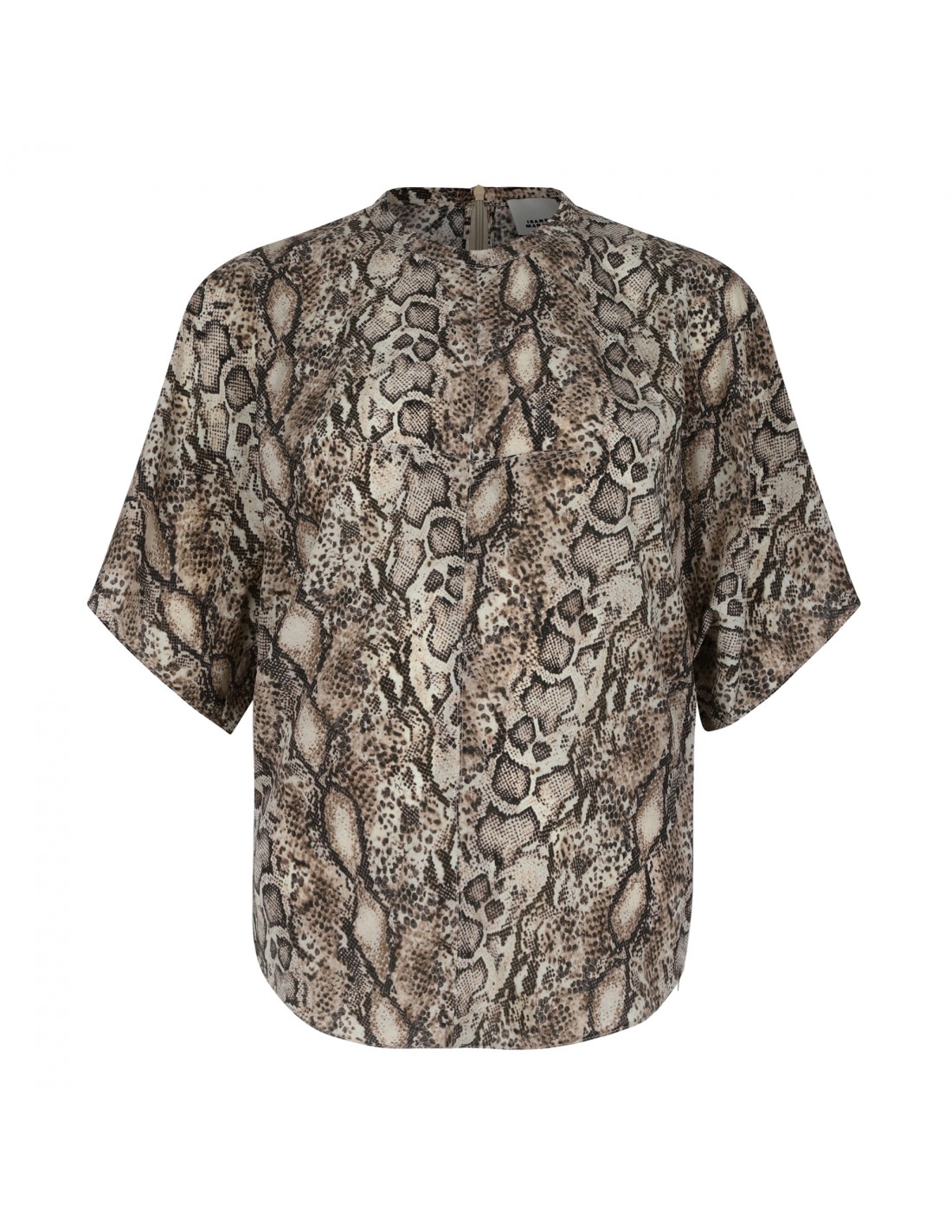 Natural, beige and black Karlita silk blend top from Isabel Marant featuring animalier printed motif, round neck, short slit sleeves, triangular seam in front, concealed zip fastening at side.