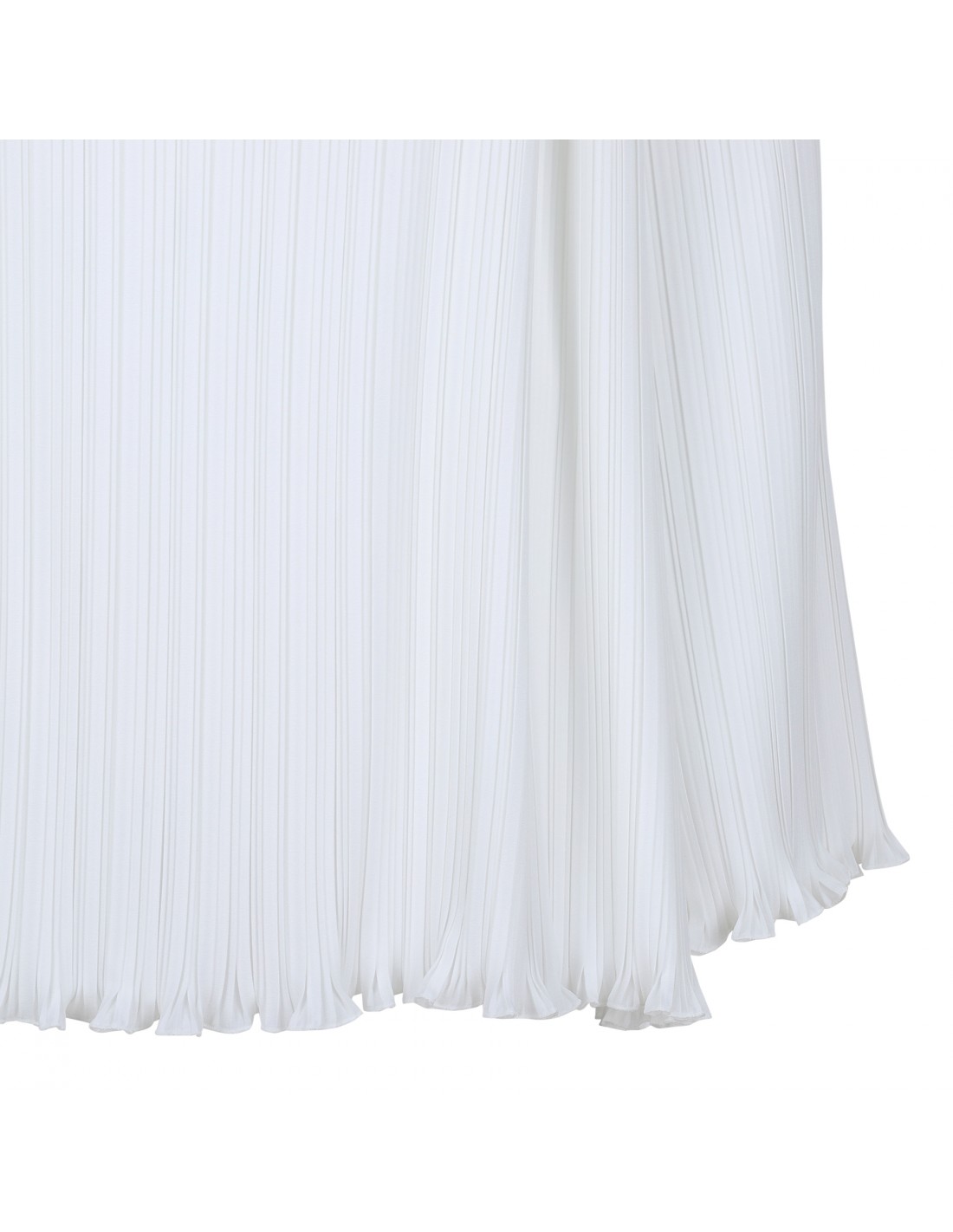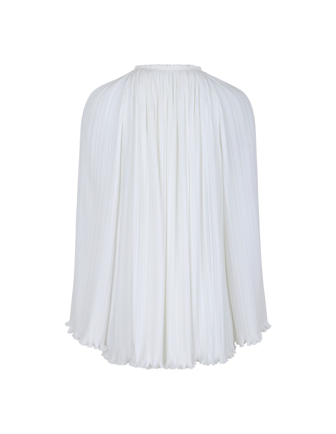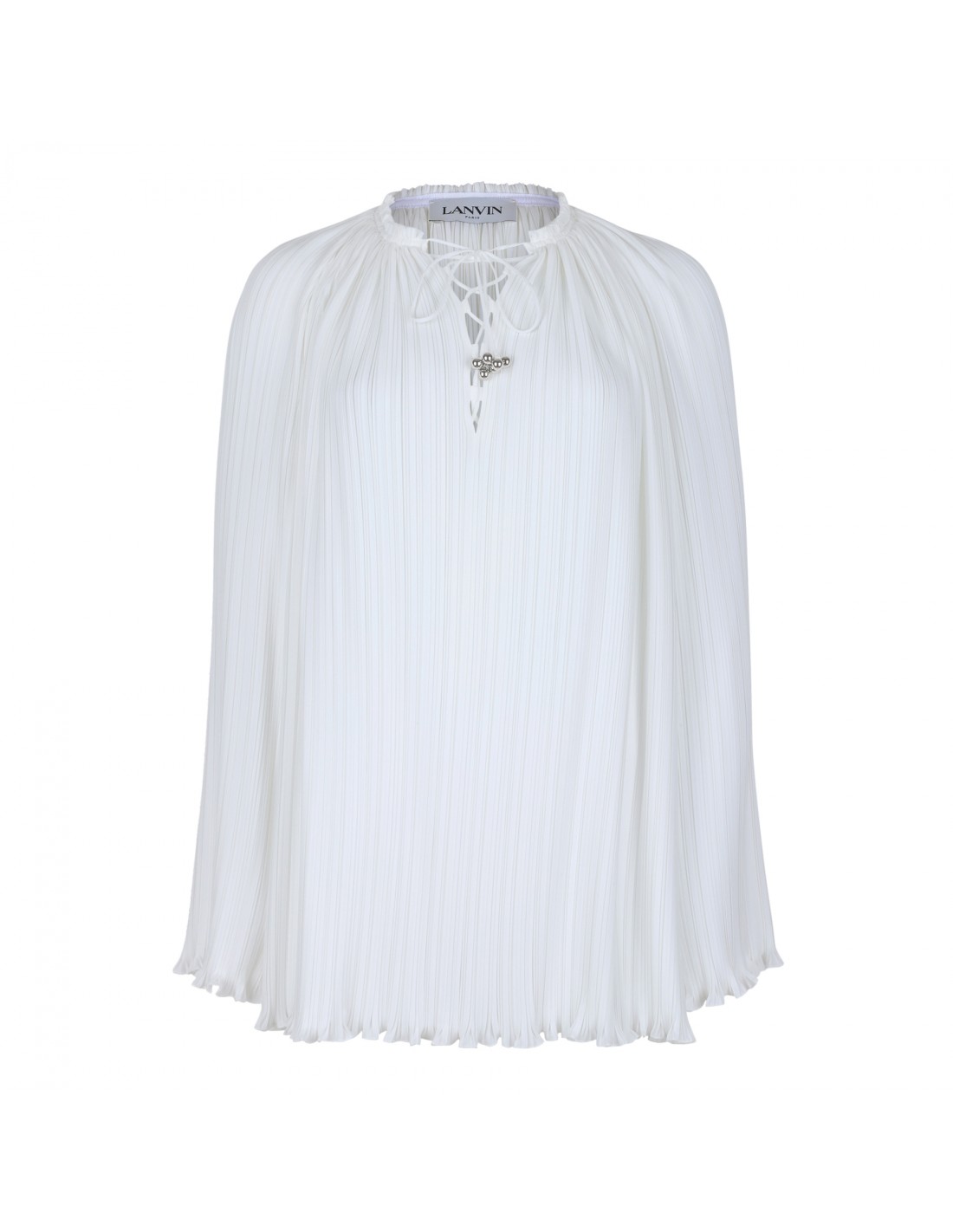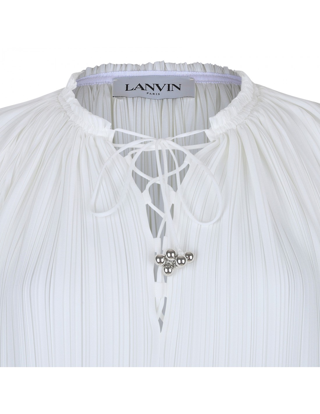 Off-white fluid pleated jersey top from Lanvin featuring pleated silhouette, gathered tie neck, crew collar with split, long sleeves, ruffled hem.