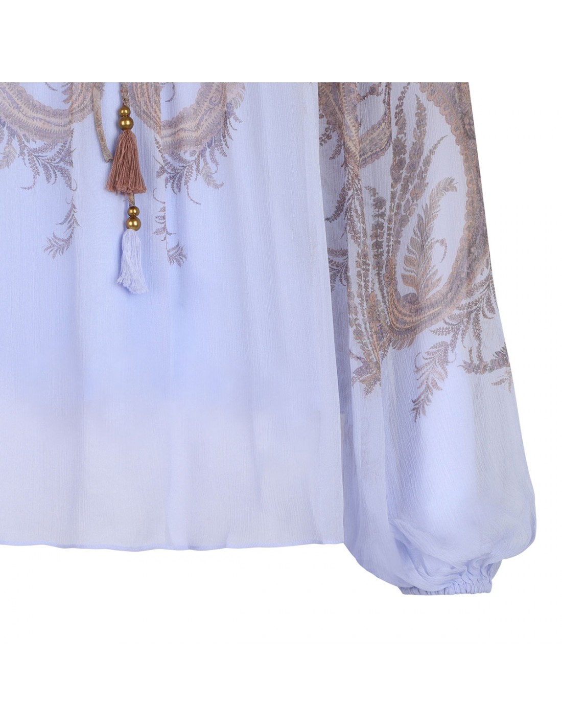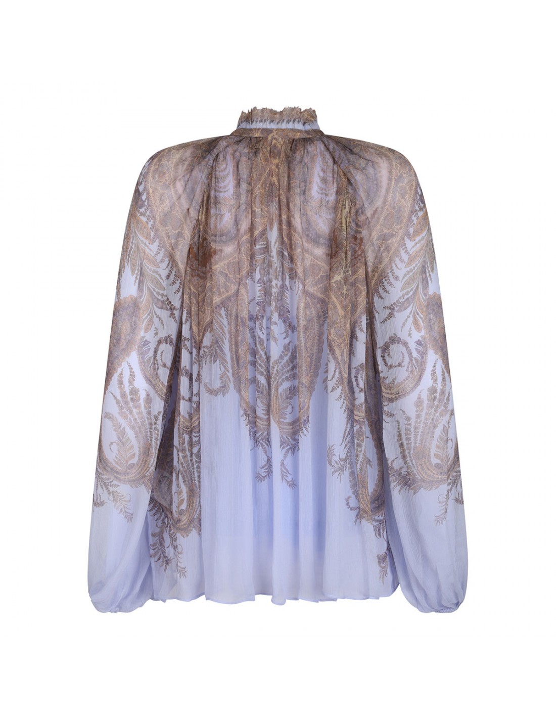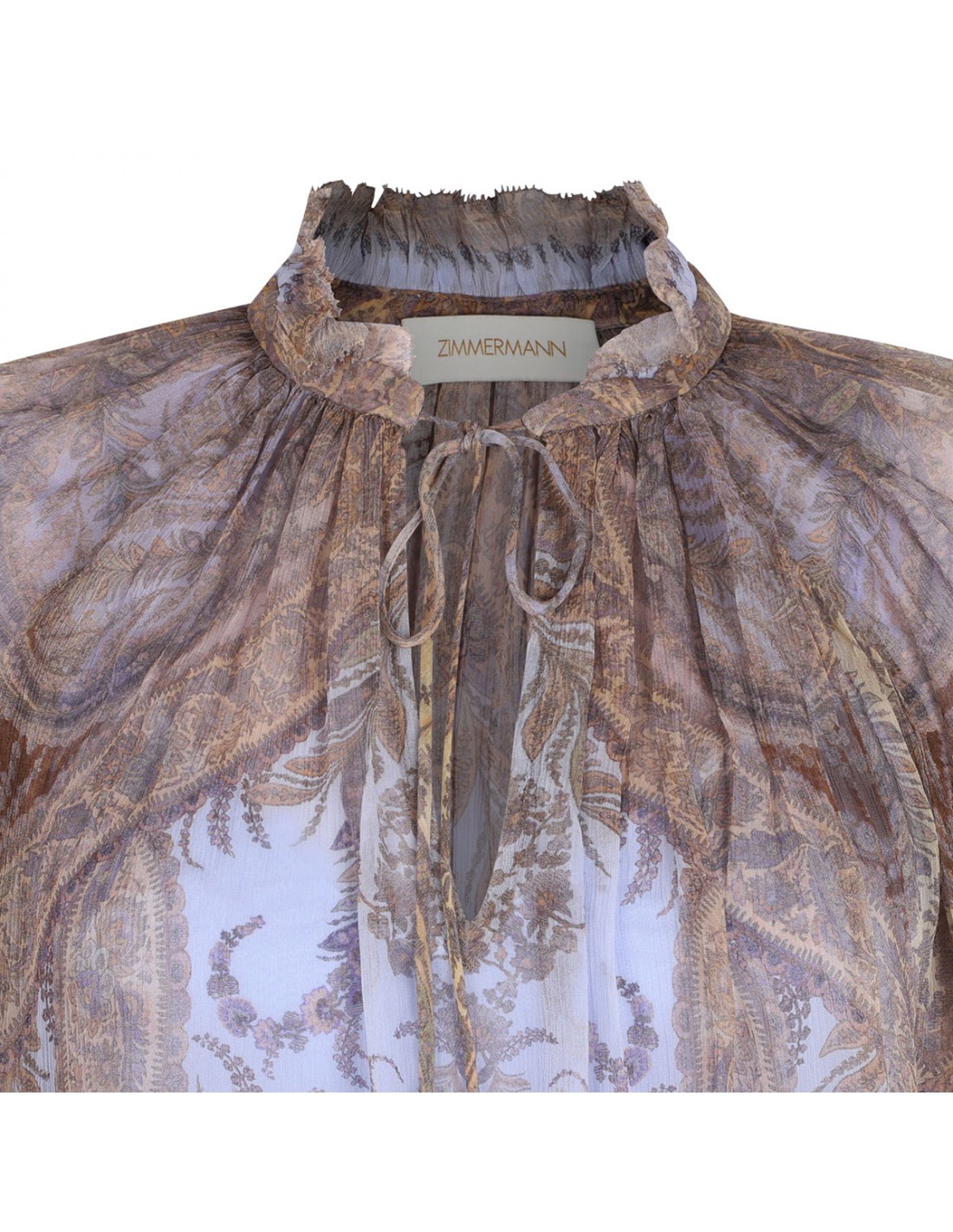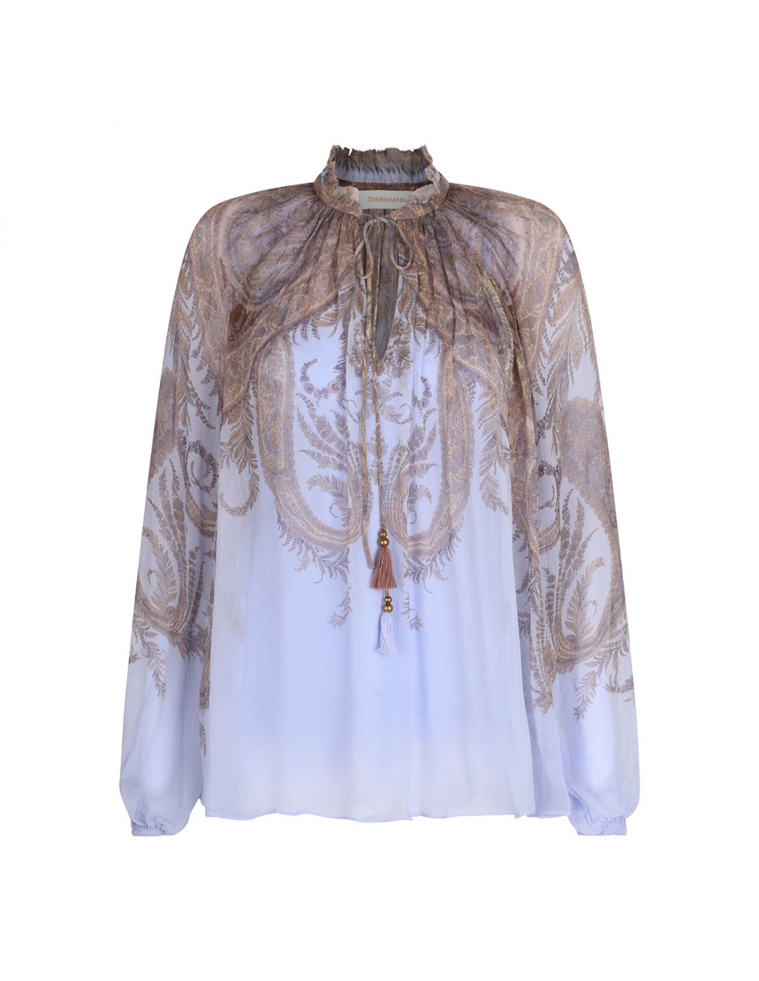 Lilac viscose Hypnotic Billow blouse from Zimmermann featuring paisley motif, long blouson sleeves with elastic cuffs, V-neckline with stand collar, gathering throughout, relaxed silhouette, self rouleau tie at neckline with frill collar, separate cami.