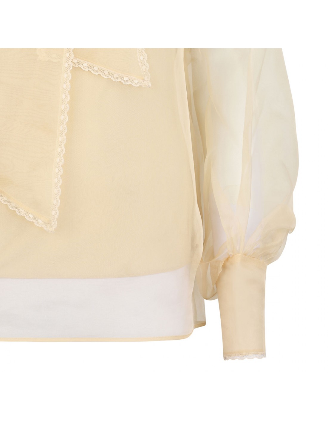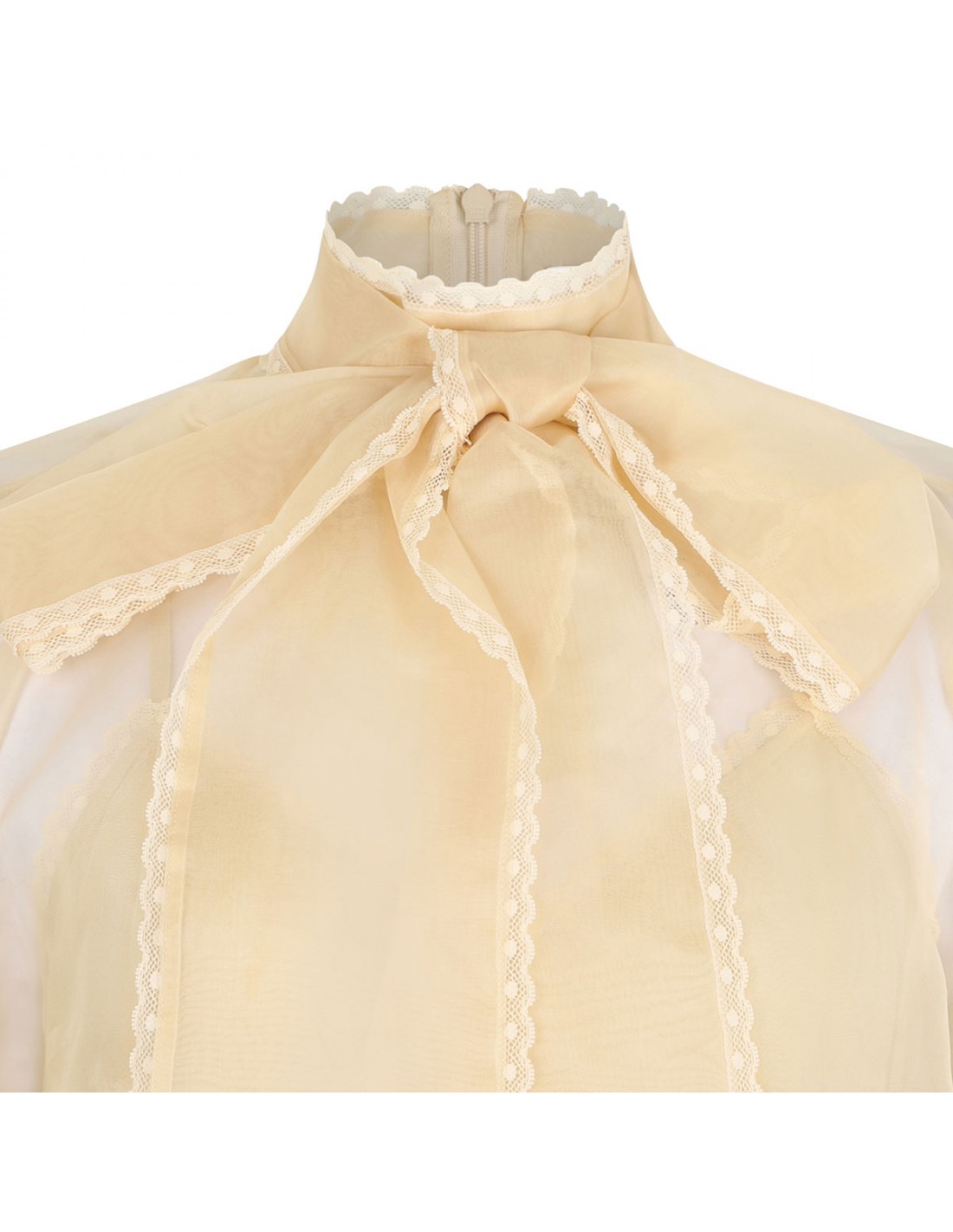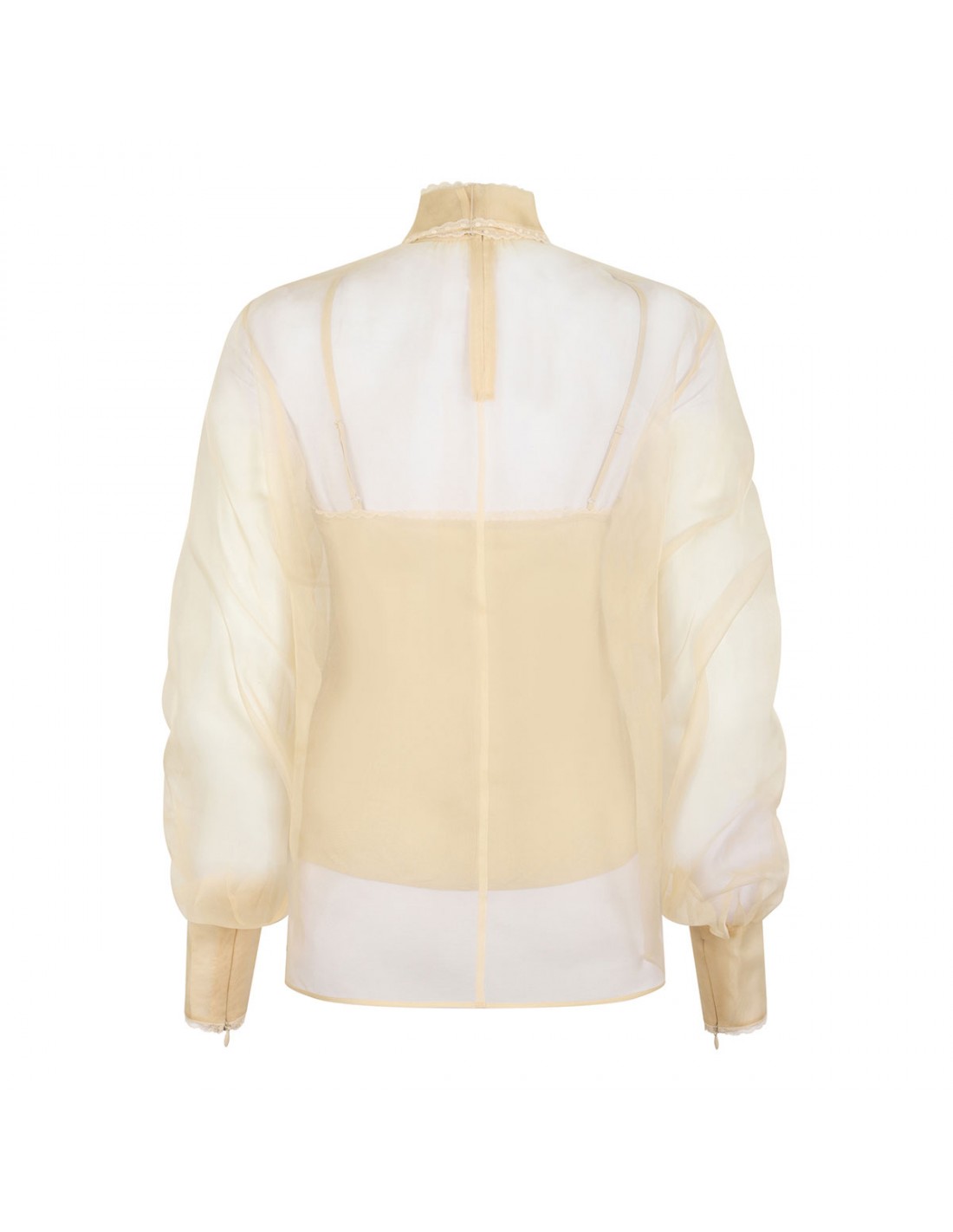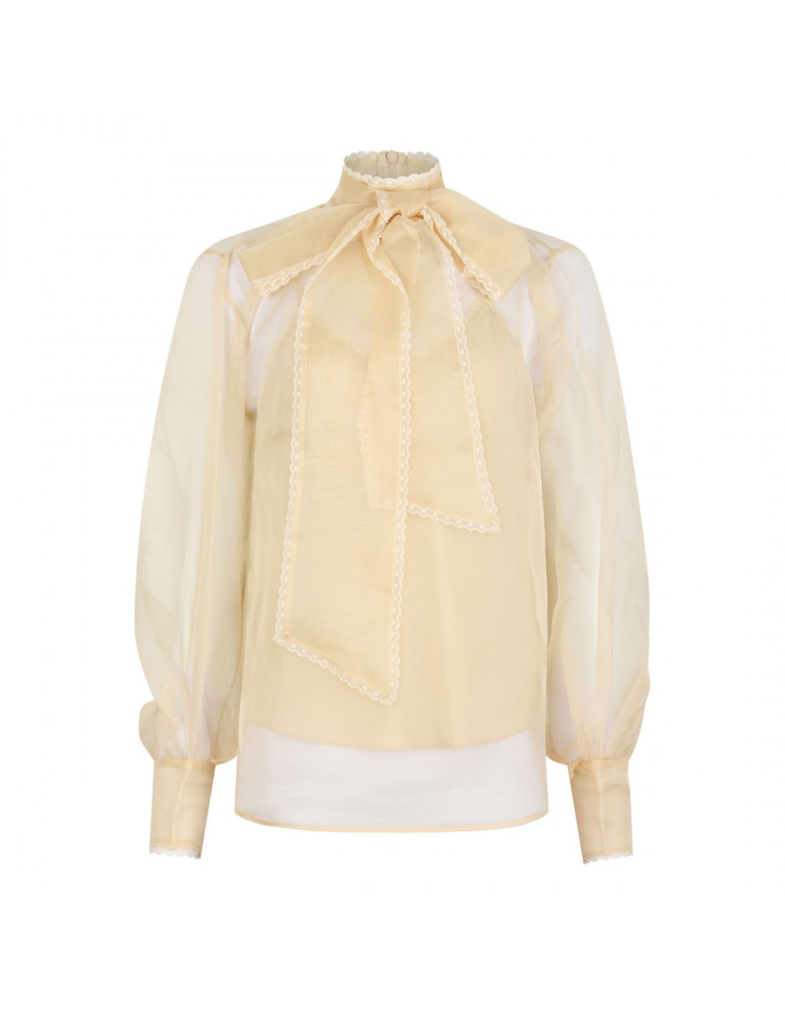 Sepia hue silk organza Memento blouse from Zimmermann featuring stand collar with pussybow necktie, long blouson sleeves, elongated cuffs with zip fastening and lace trims, concealed zip fastening at centre back, detachable cami.