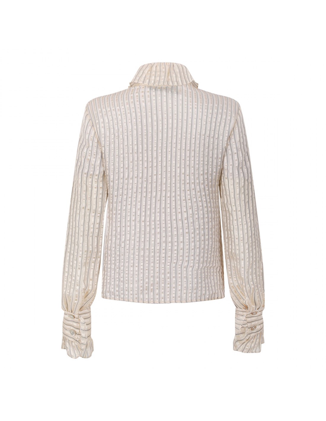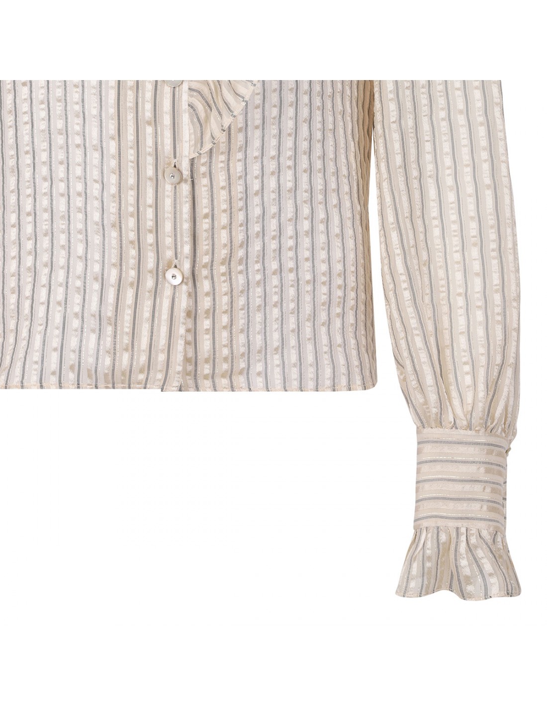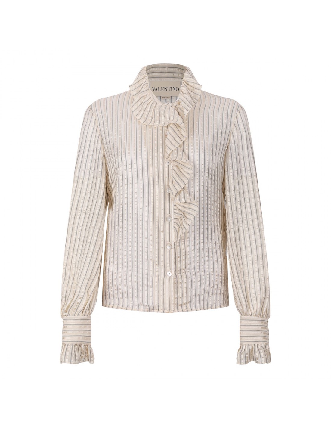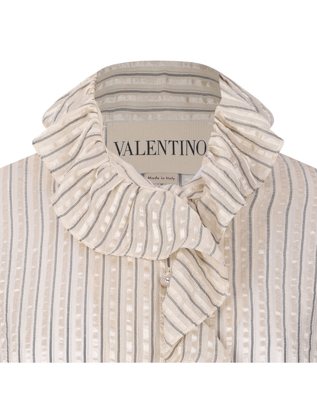 Ivory, gold and black silk lamé shirt from Valentino featuring striped motif, ruched collar and front, button closure on front, long sleeves with ruched cuffs.