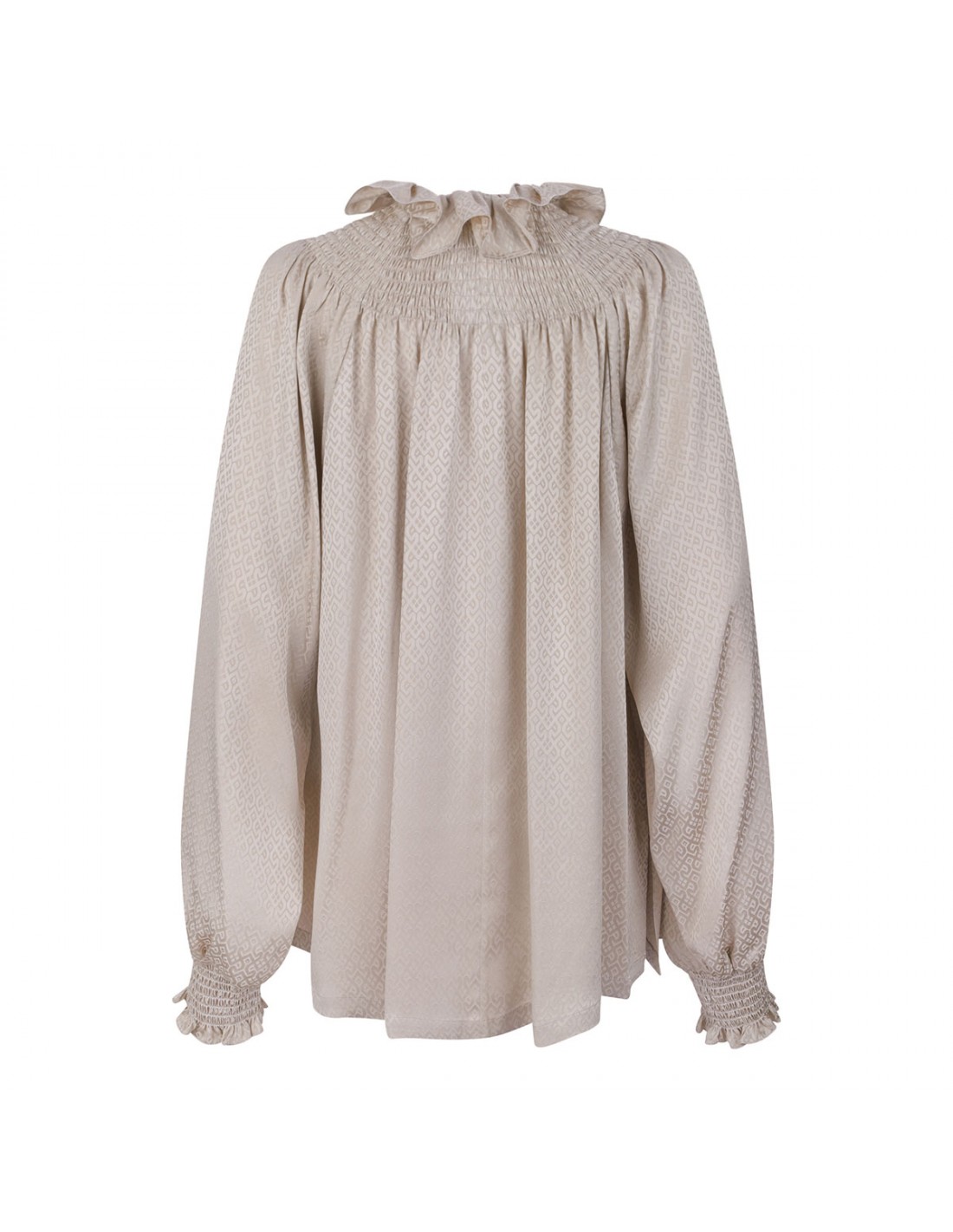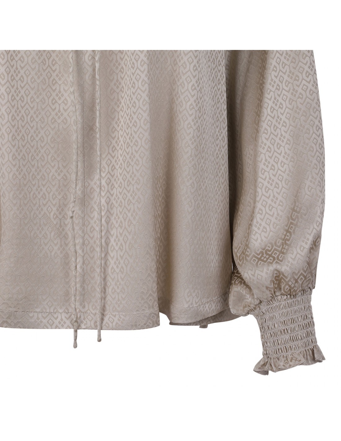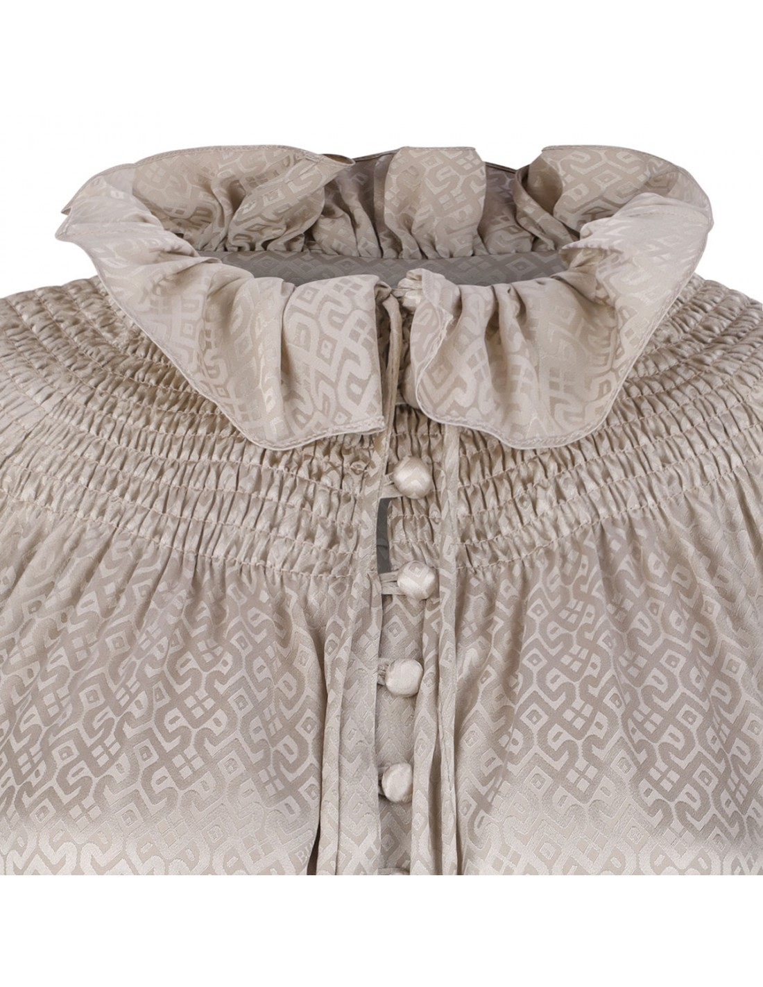 Taupe silk crepe de chine blouse from Burberry featuring geometric jacquard motif, relaxed fit, smocking and ruffles at neckline and cuffs, button fastening on front, self-tie collar, elastic cuffs and side splits.
