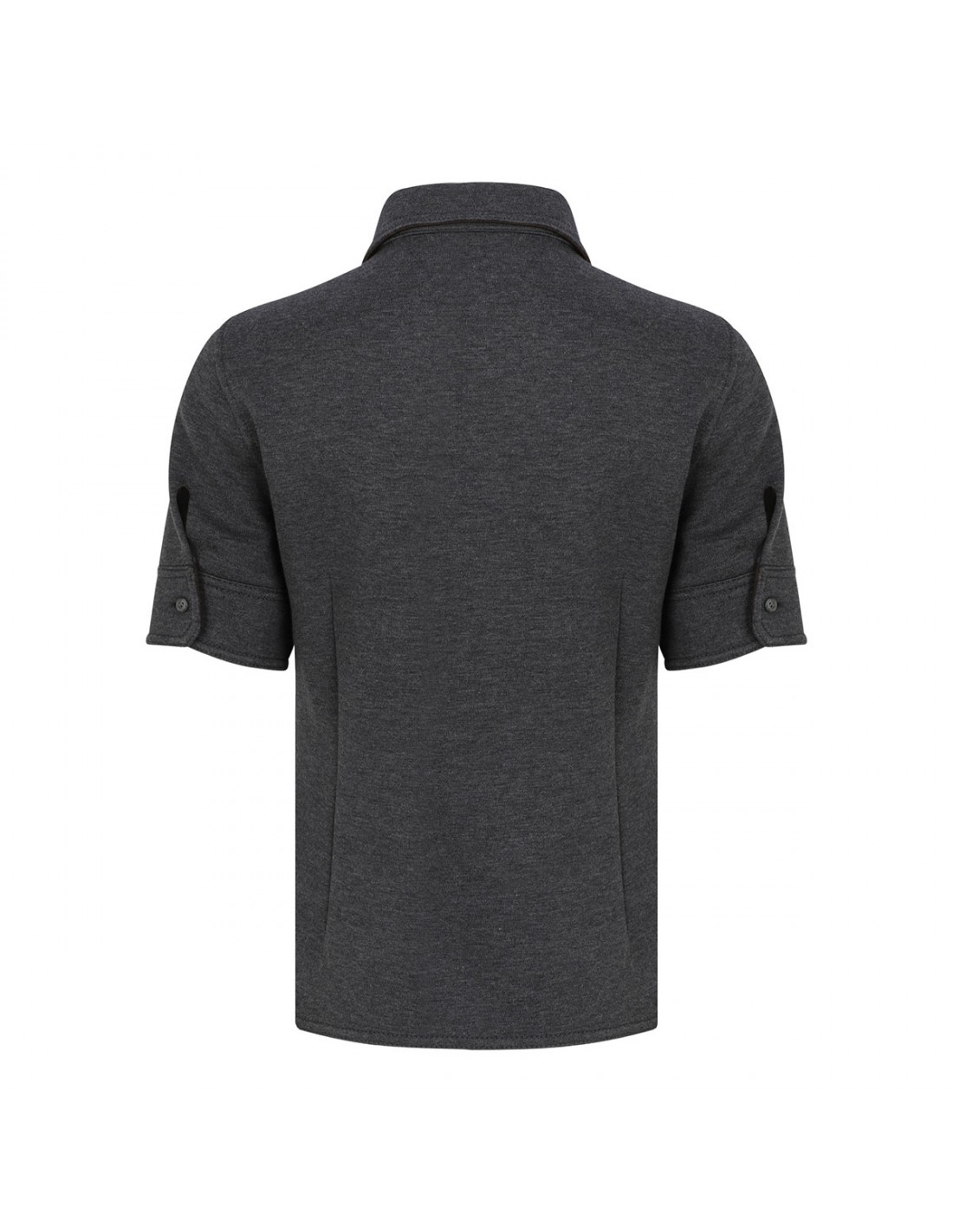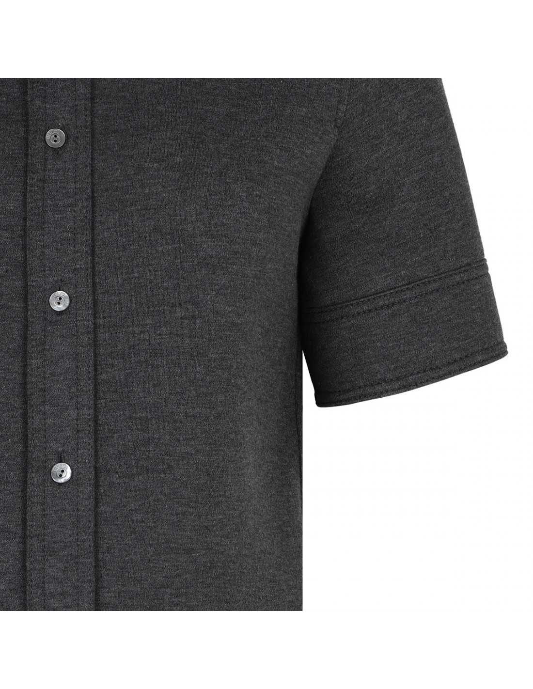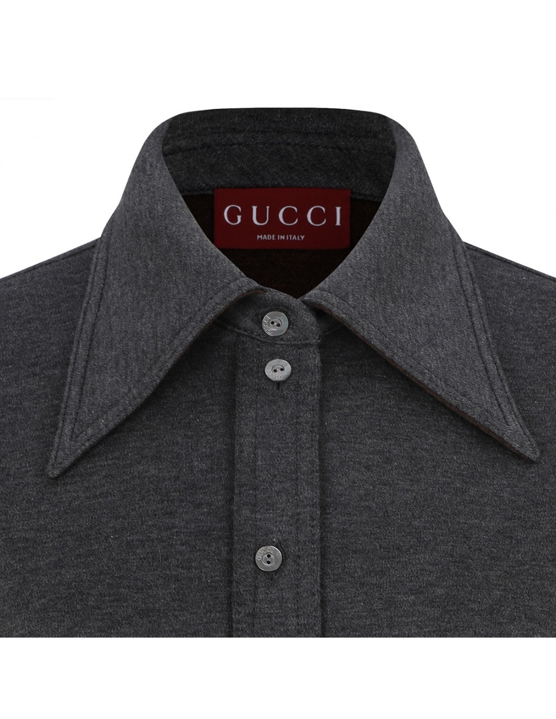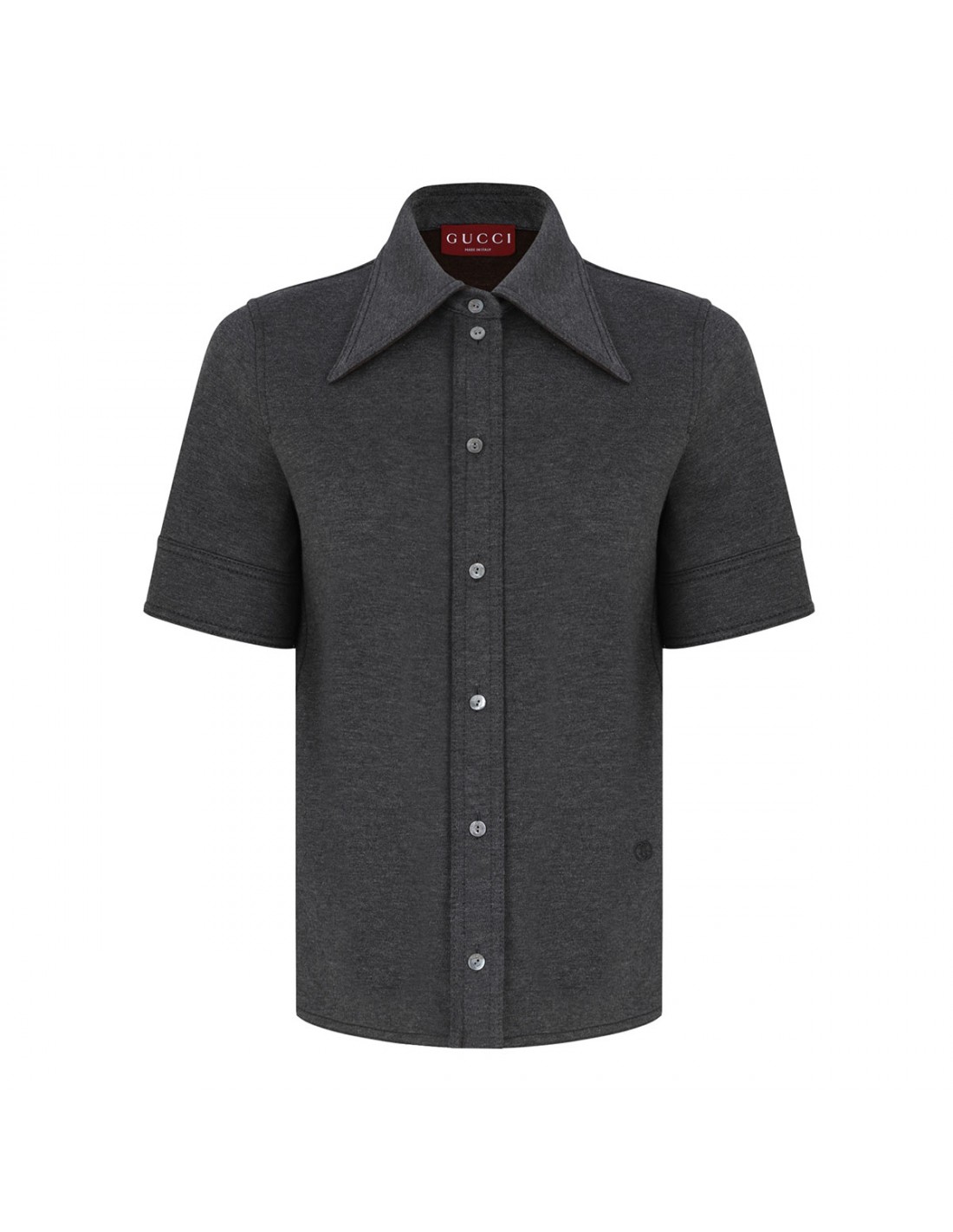 Stone gray double wool cotton jersey shirt from Gucci featuring logo and interlocking G embroidery, long pointed collar, short sleeves, button fastening on front.