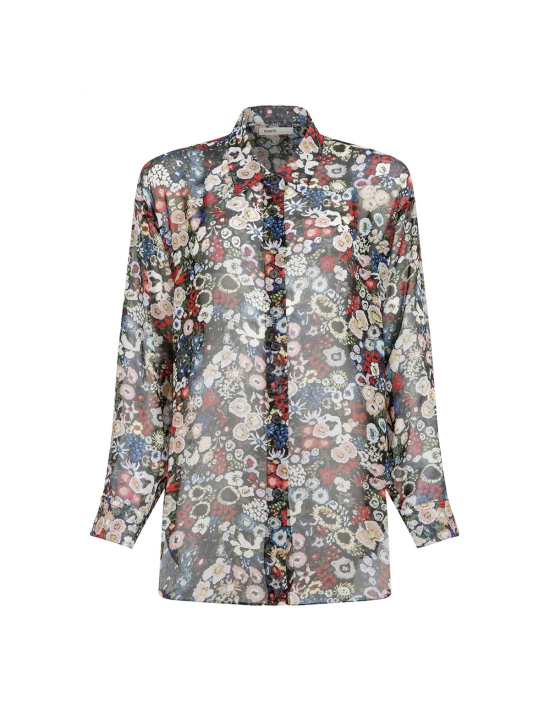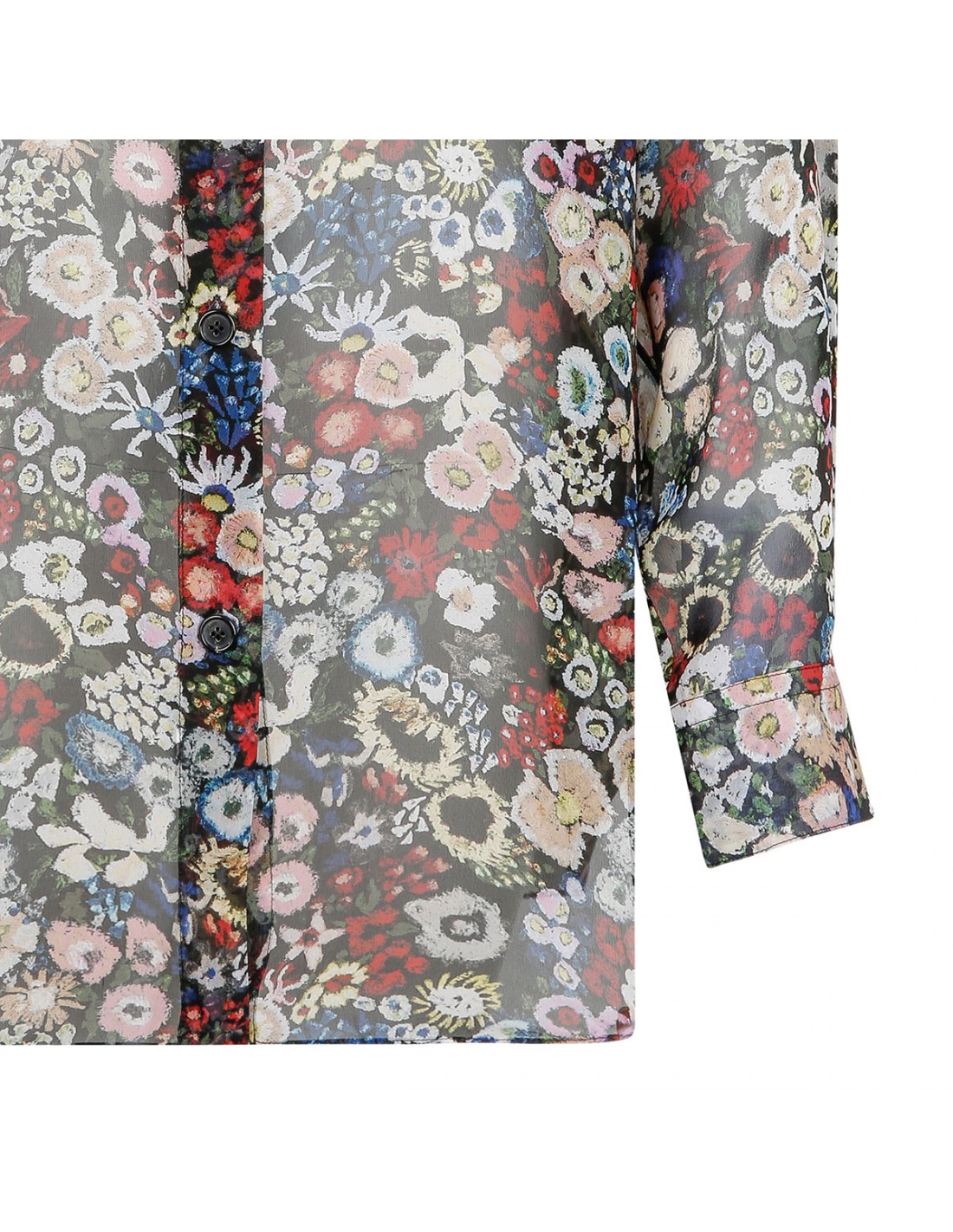 Black silk Goya shirt from Khaite featuring multicolor floral motif printed allover, relaxed silhouette, classic pointed collar, seamed at the sides, dropped shoulders, back yoke, long sleeves with buttoned cuffs.
