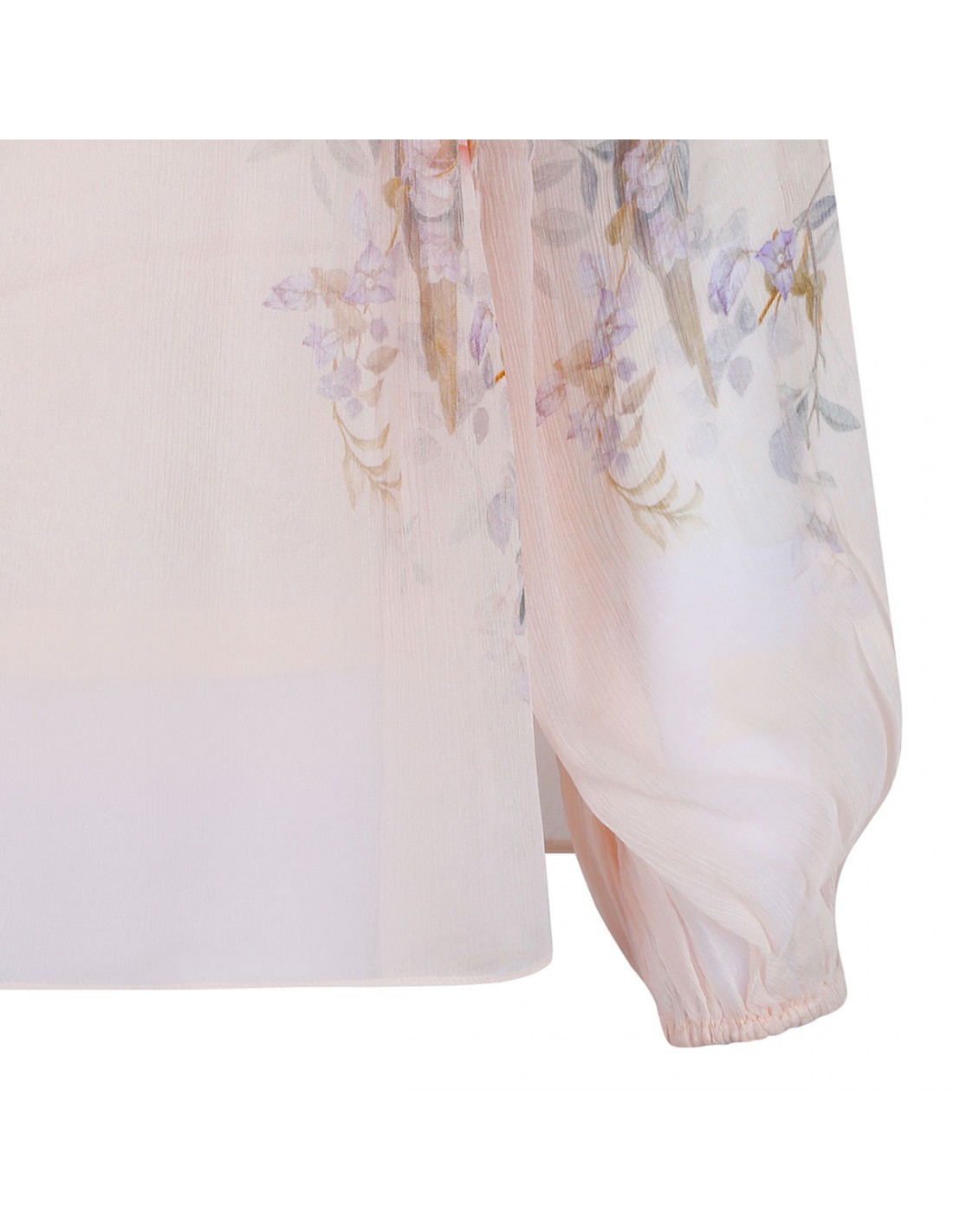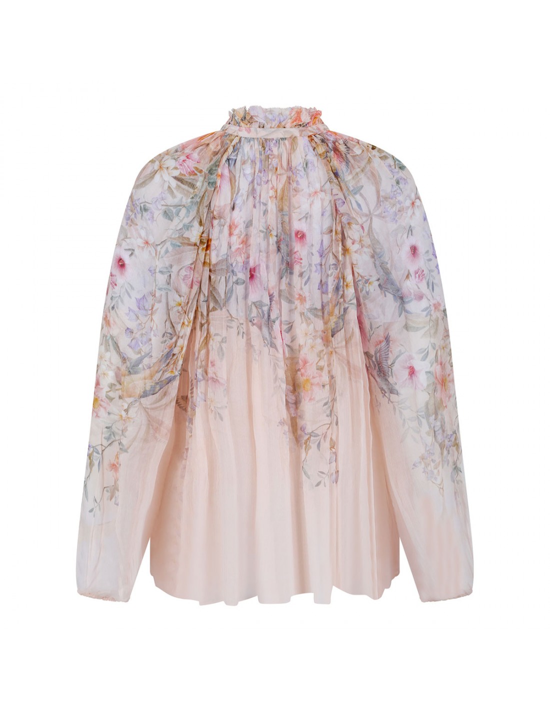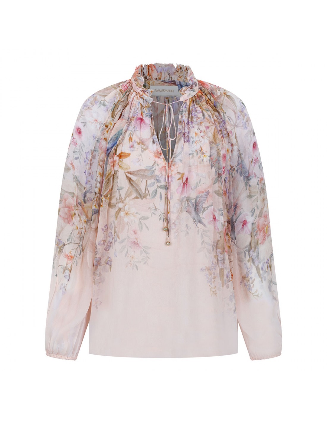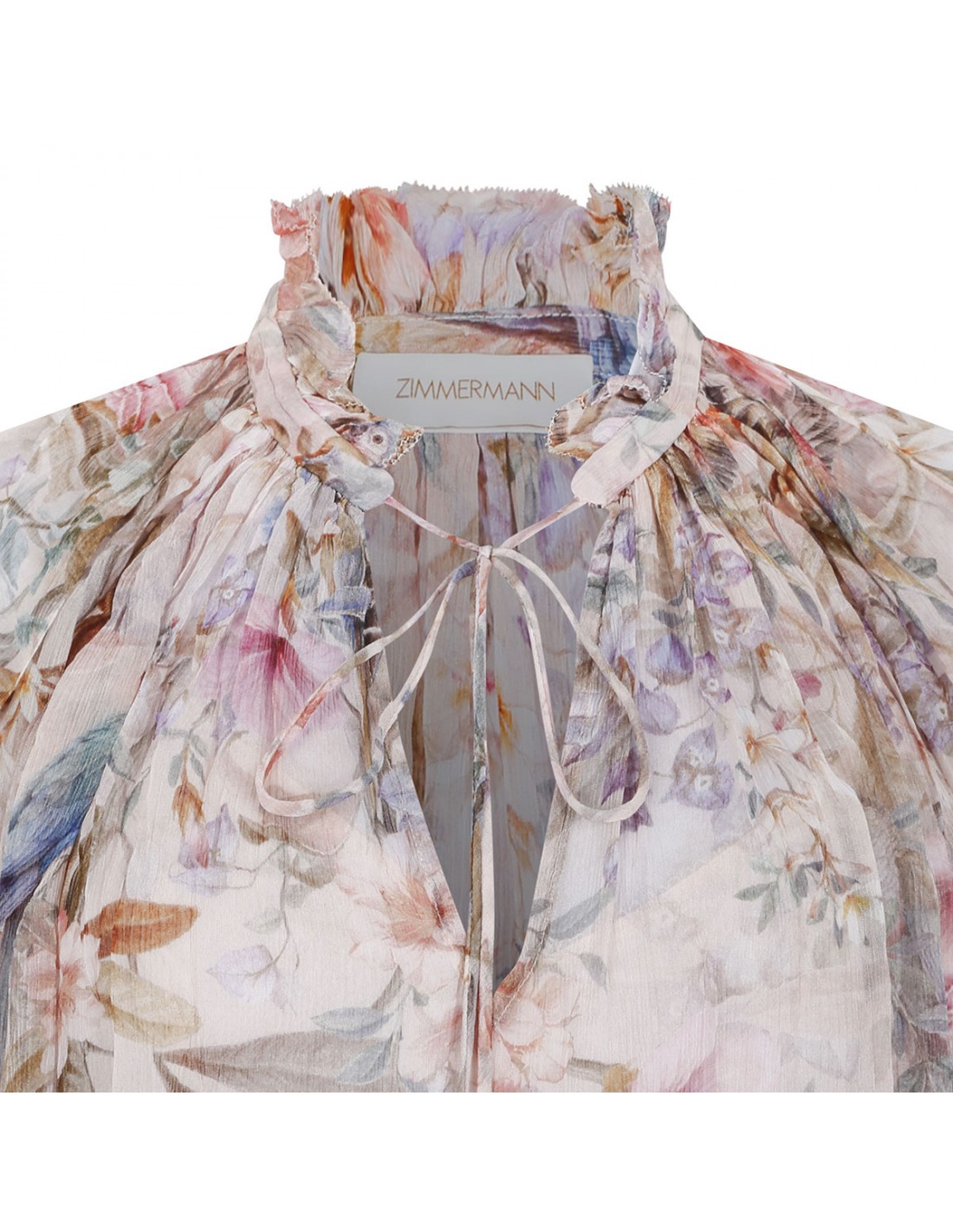 Cream hue viscose Rebellion billow blouse from Zimmermann featuring floral motif printed allover, long blouson sleeves, V-neckline with elastic cuffs, stand frill collar with self-tie, gathering throughout, relaxed silhouette, detachable cami.