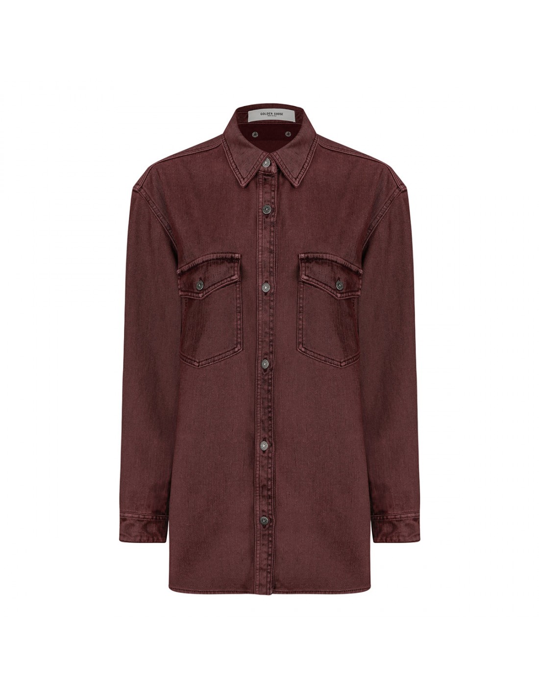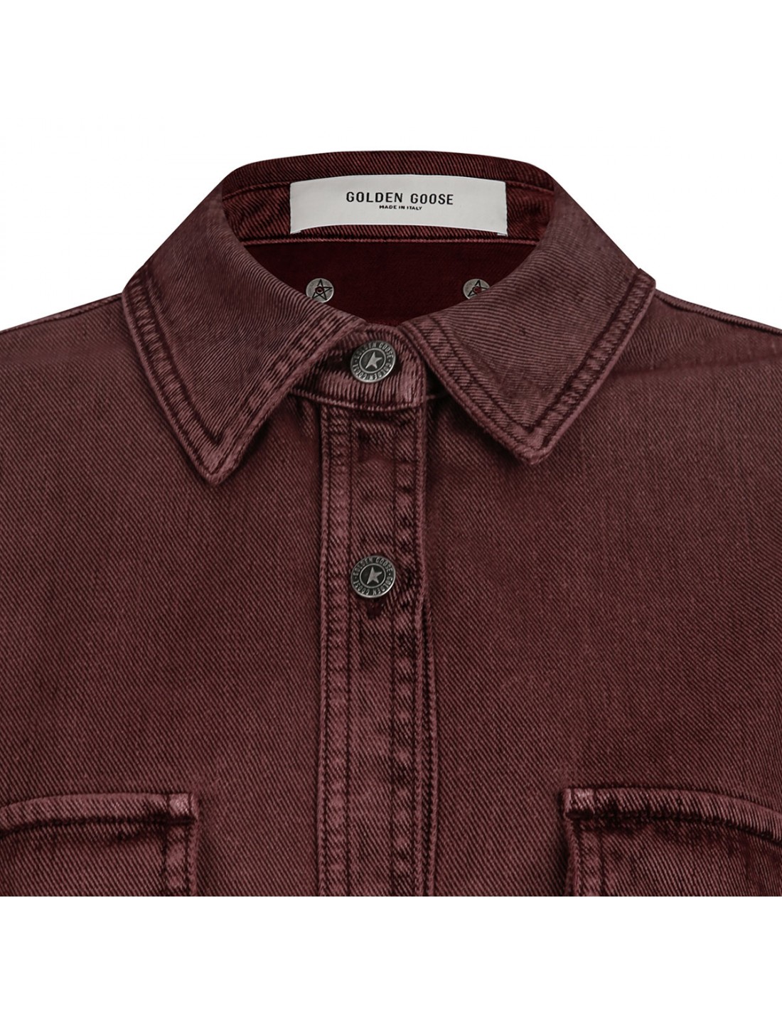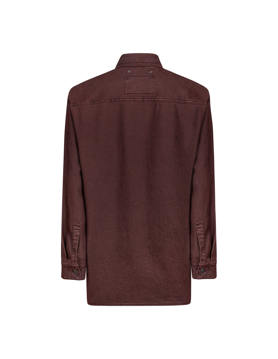 Burgundy cotton twill denim shirt from Golden Goose featuring flocked effect, overshirt-style, relaxed fit, pointed collar, buttoned flap pockets on the chest, double star on the back, long sleeves with buttoned cuffs.