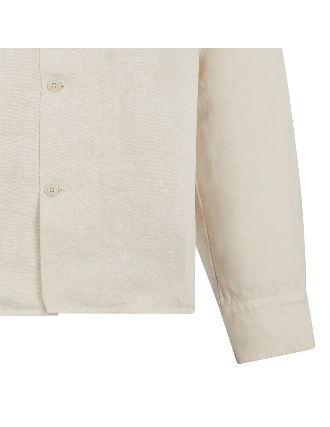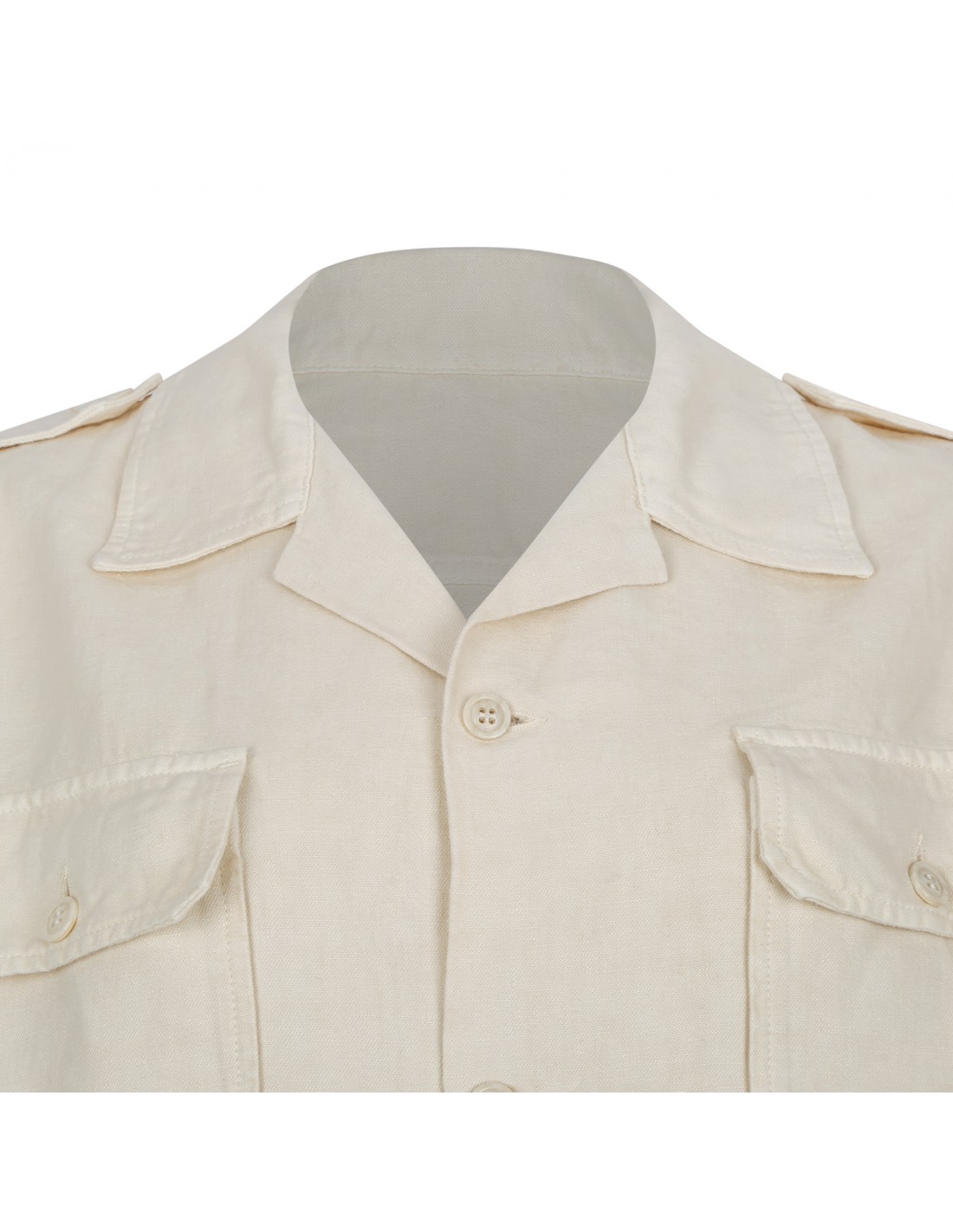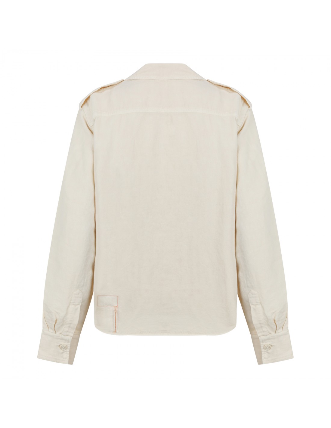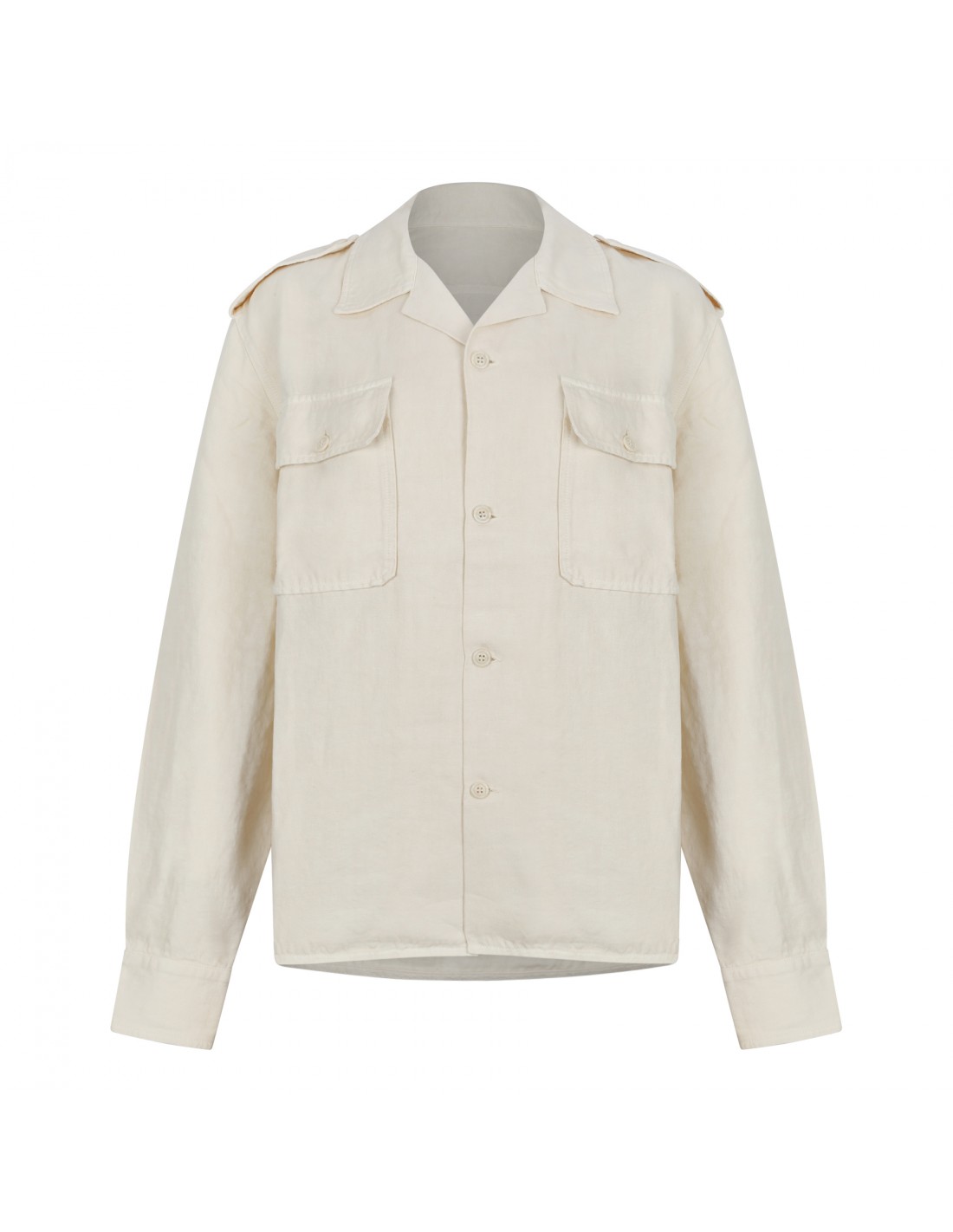 Milk hue linen Bia military shirt from Fortela featuring lapel collar, chest buttoned flap pockets, shoulder epaulettes, branded button fastening, long sleeves with buttoned cuffs, back yoke.