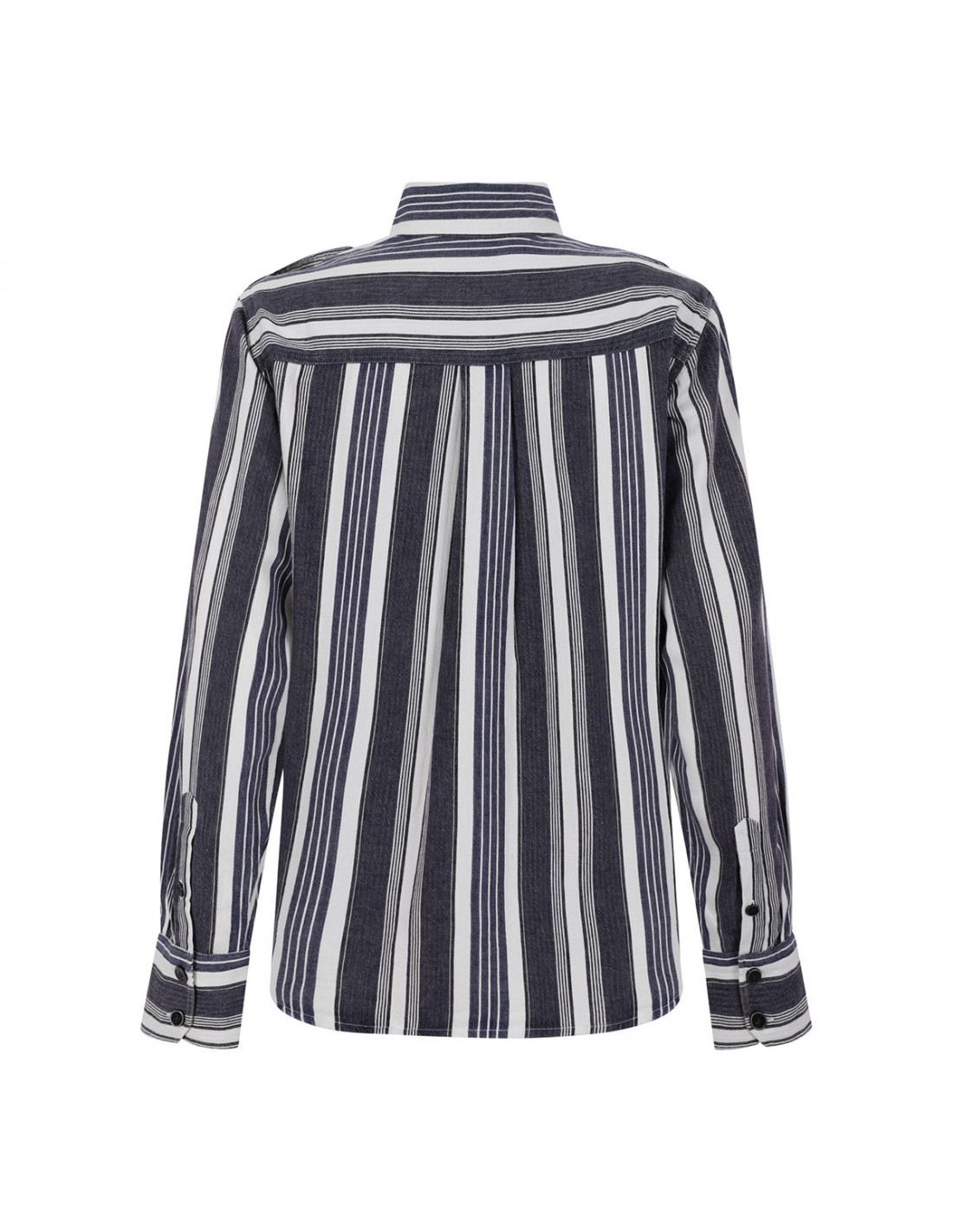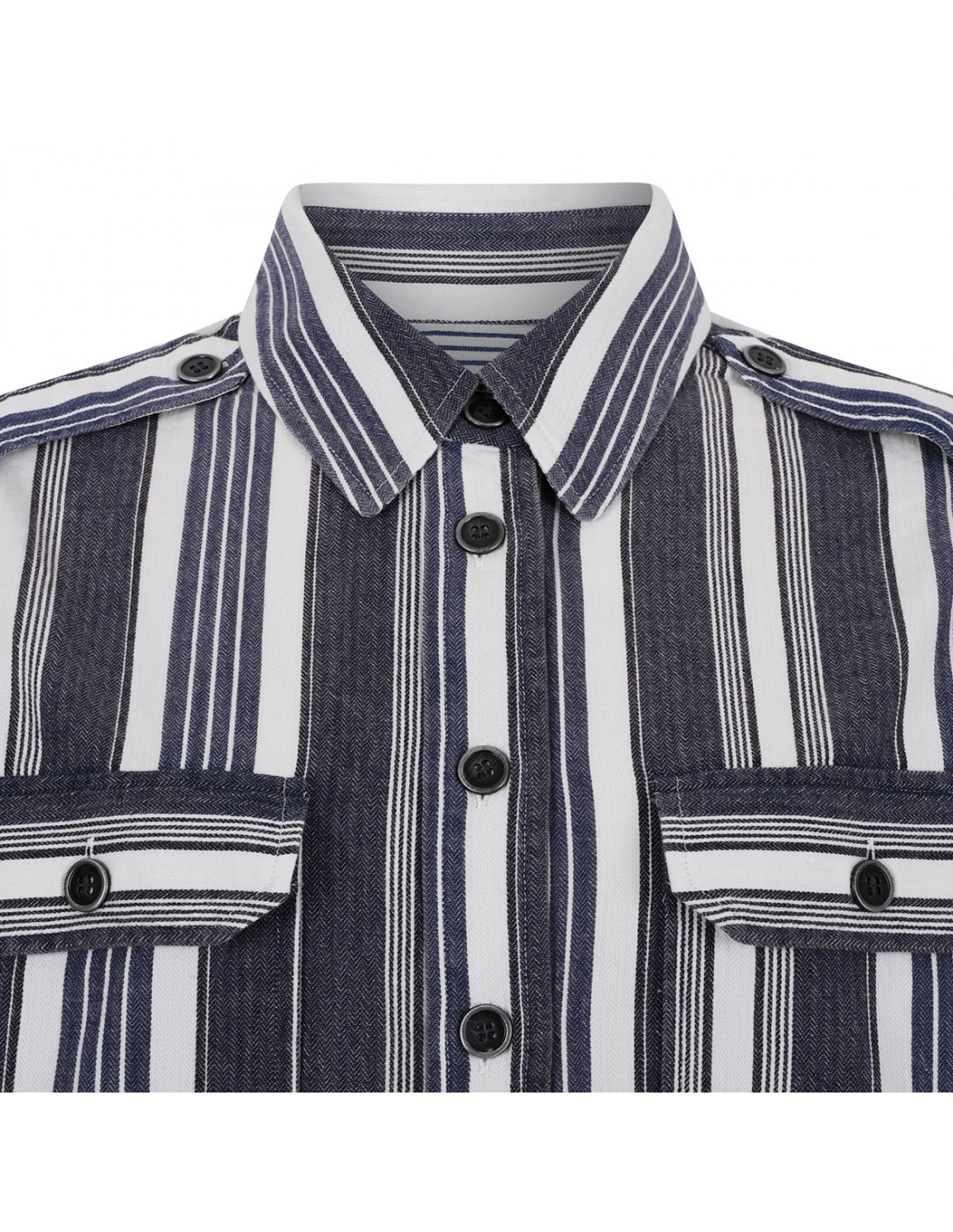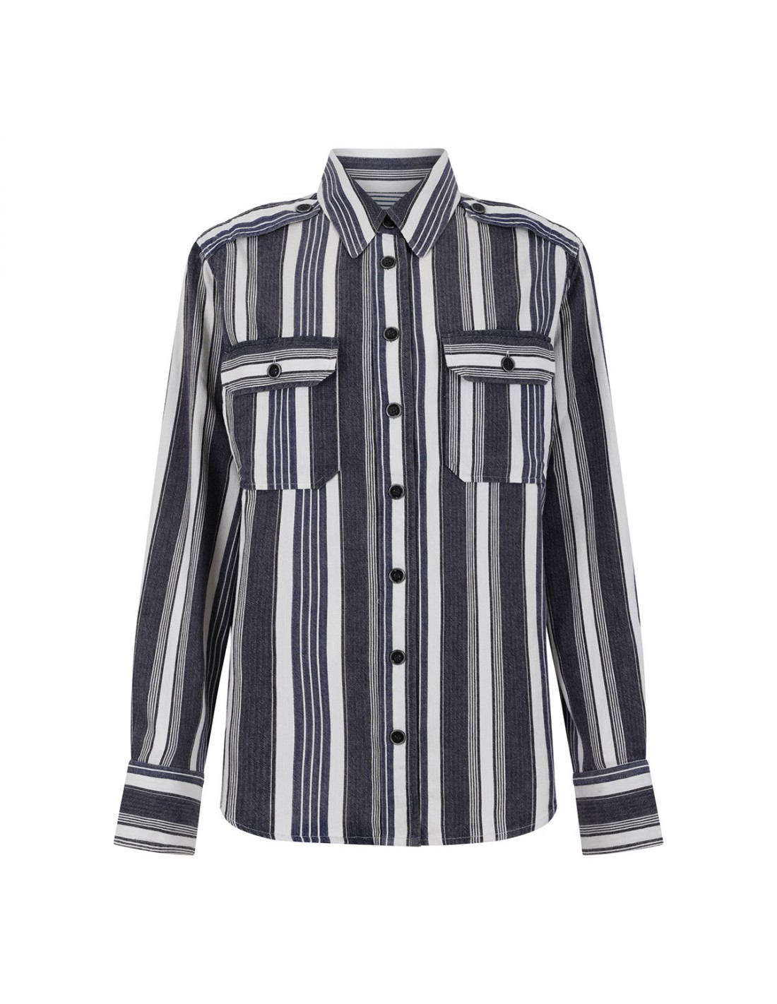 Ecru and blue pure cotton Gerva Top from Isabel Marant Etoile featuring all-over striped pattern, pointed collar, decorative shoulder epaulettes, buttoned flap pockets on chest, button fastening at front, long sleeves with buttoned cuffs.