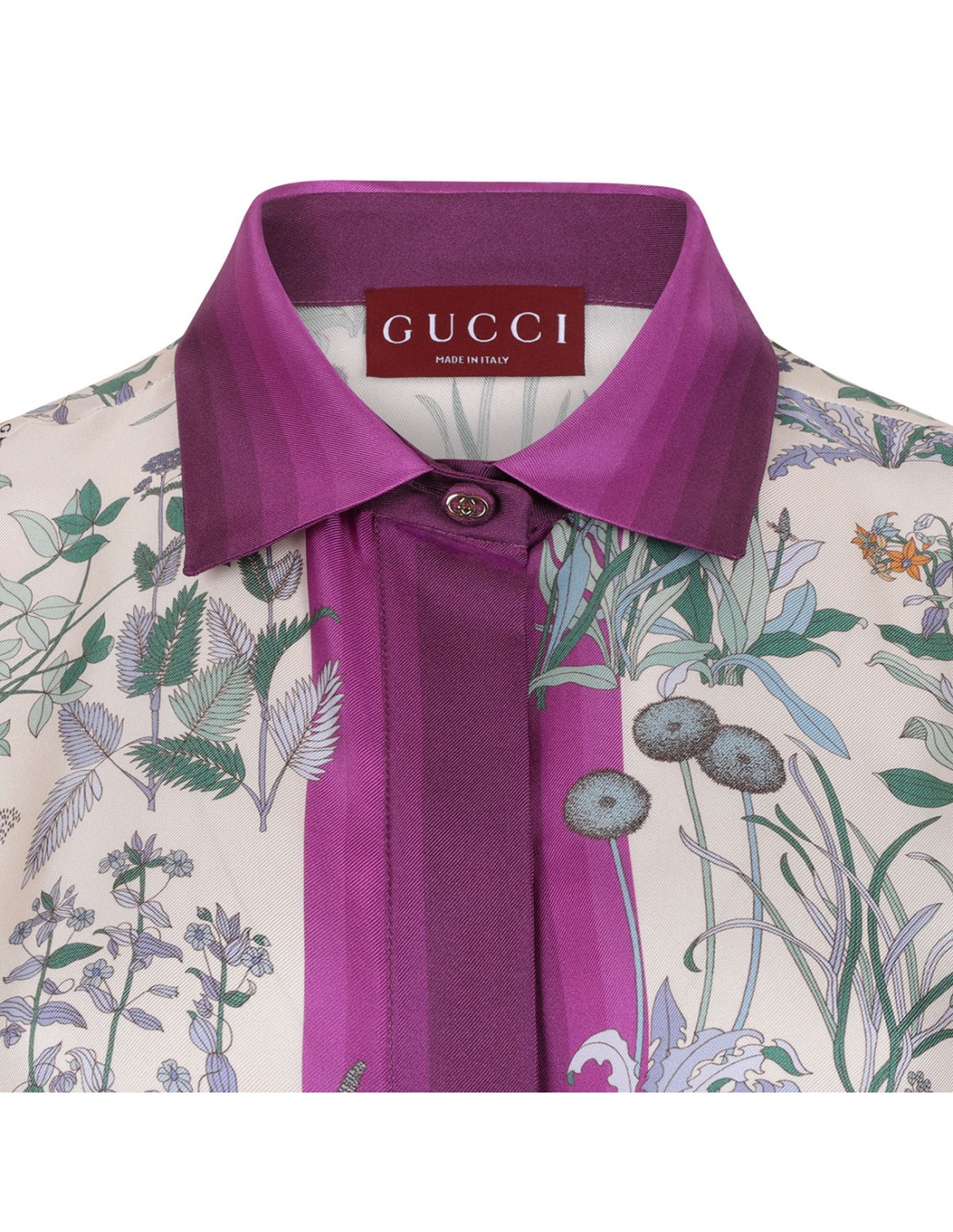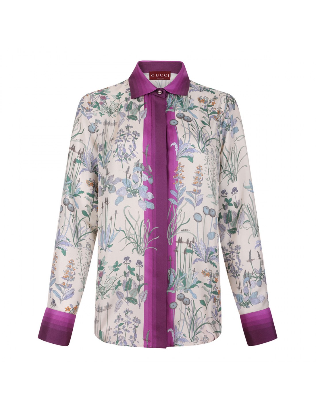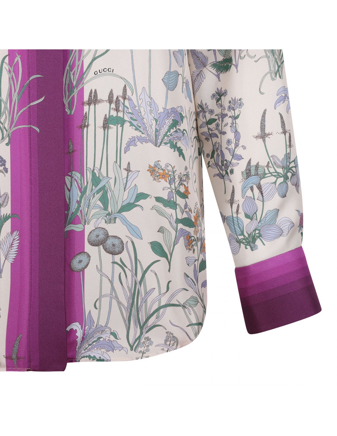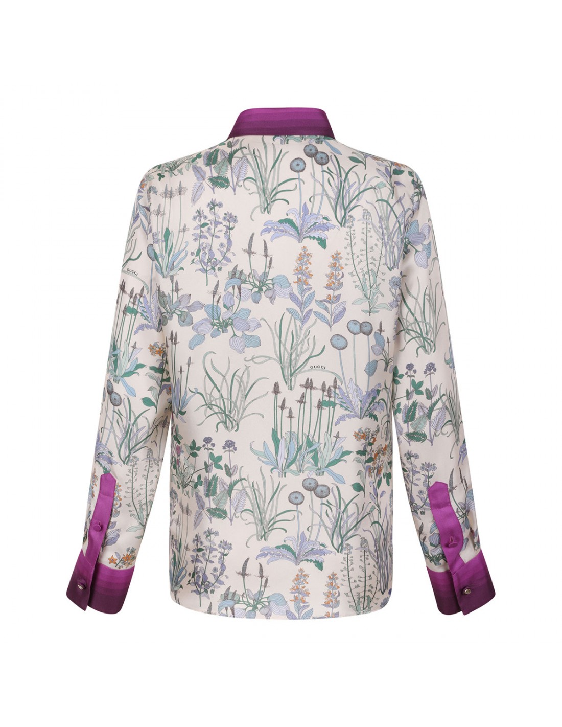 Ivory and purple silk twill shirt from Gucci featuring allover floral print, pointed collar, long sleeves with buttoned cuffs, concealed button closure at front.