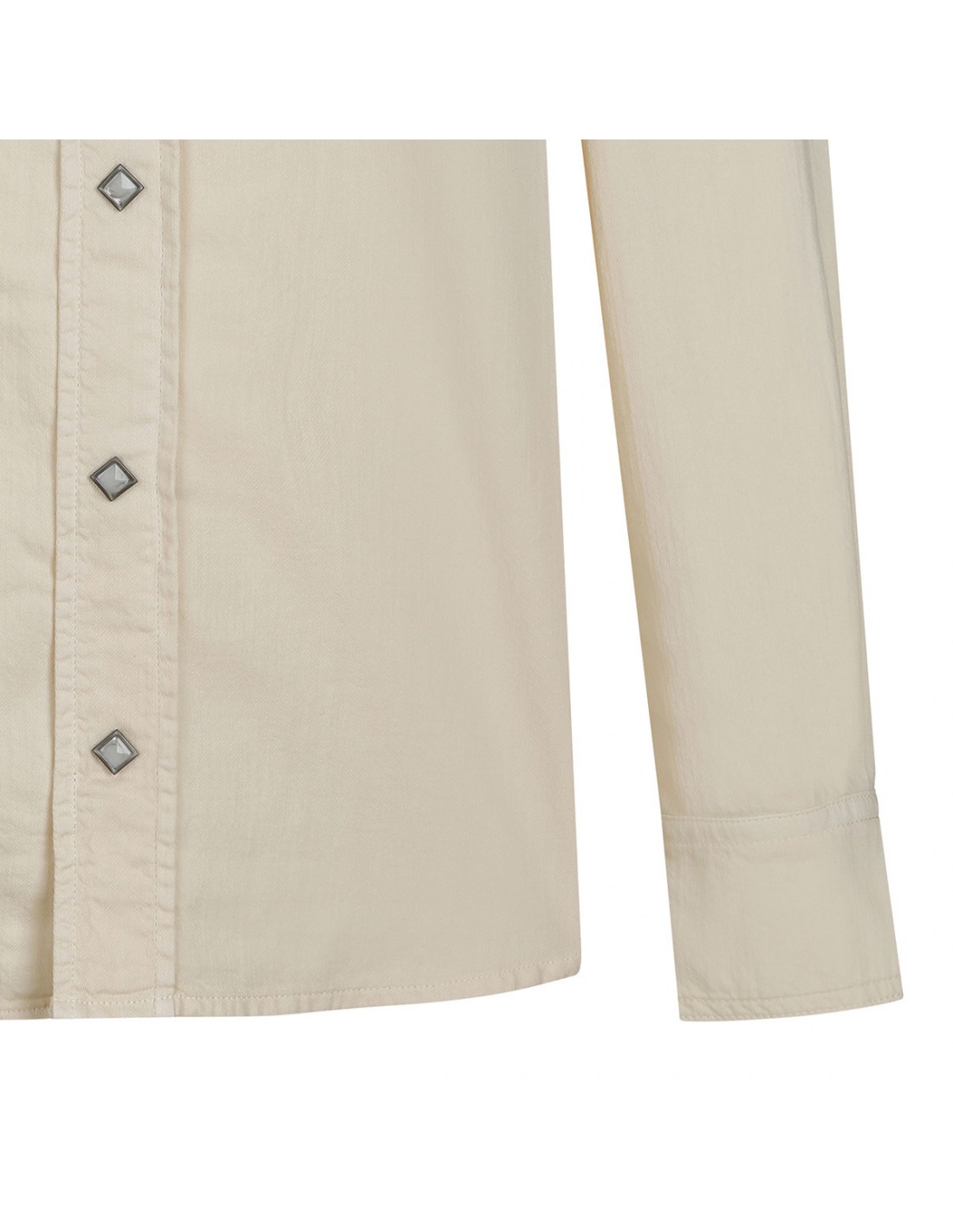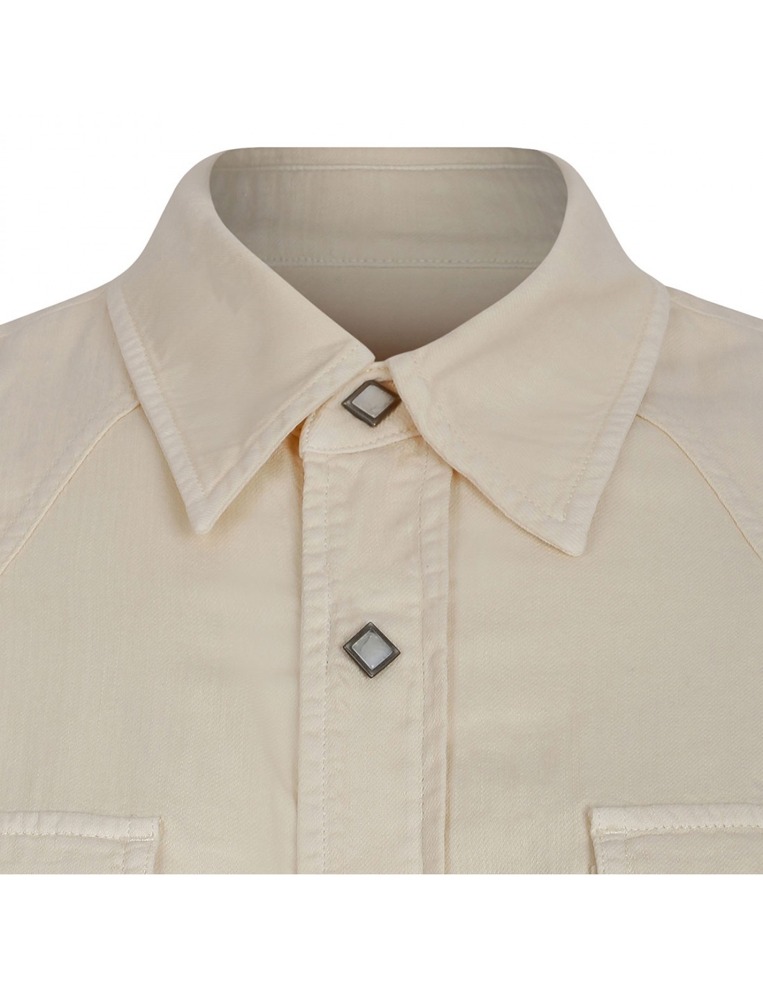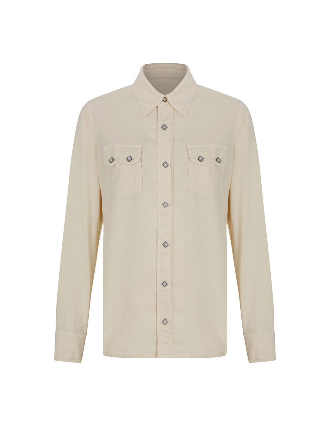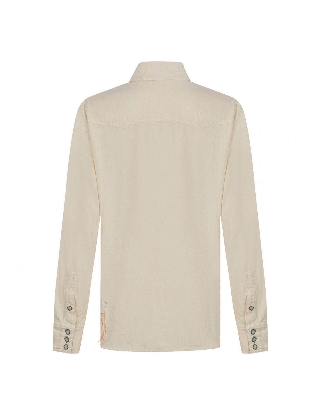 Milk hue cotton Toledo Texan shirt from Fortela featuring oversize silhouette, applied double-pointed flap pockets at chest, long sleeves with buttoned cuffs, pointed collar, snap button fastening, front and back yoke.
