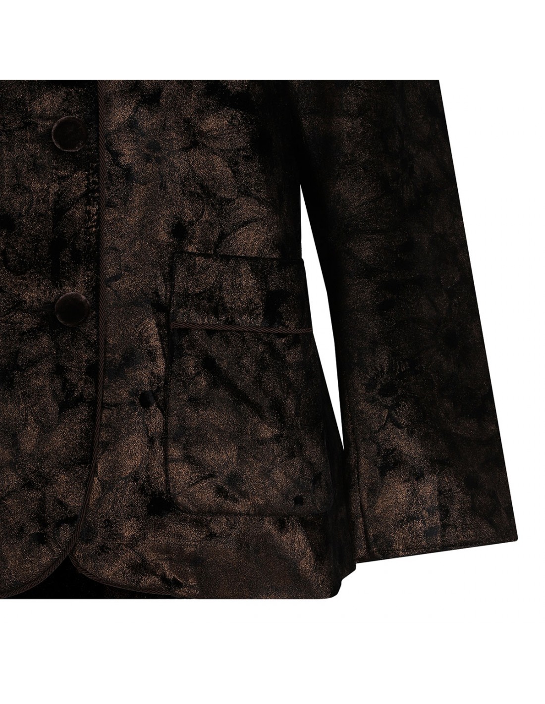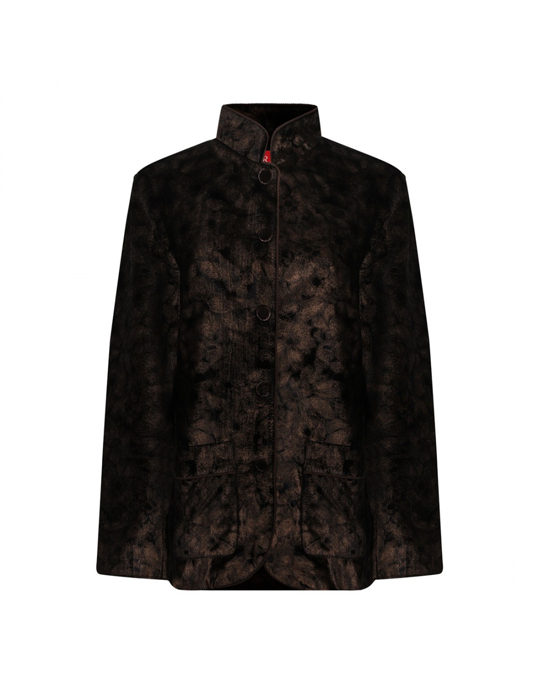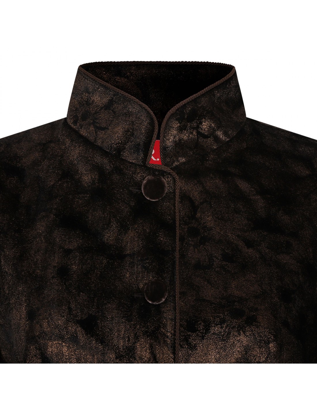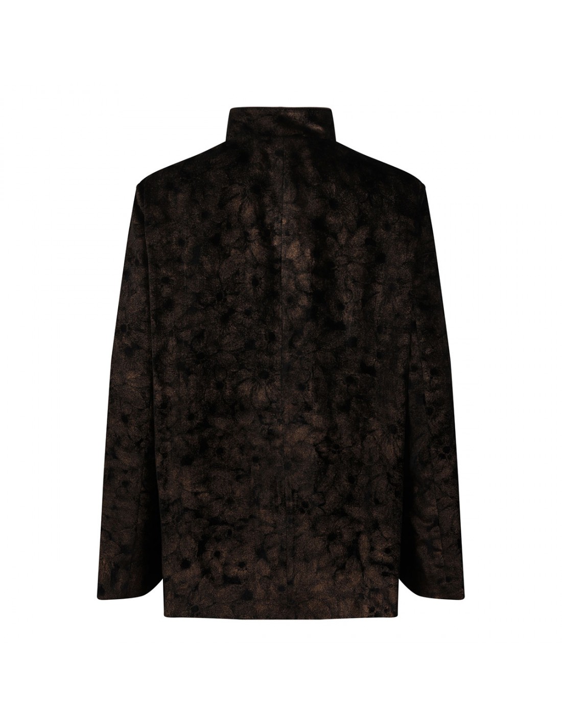 Black laminated velvet Damasene pajama shirt from FRSS featuring golden floral motif, hic Korean collar, two front pockets, cord piping, button closure, long sleeves.