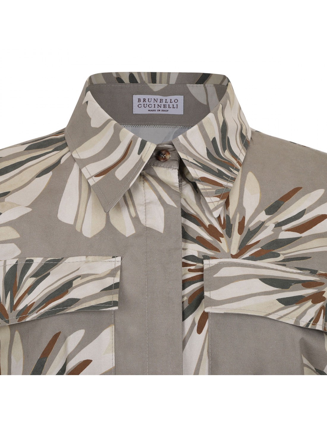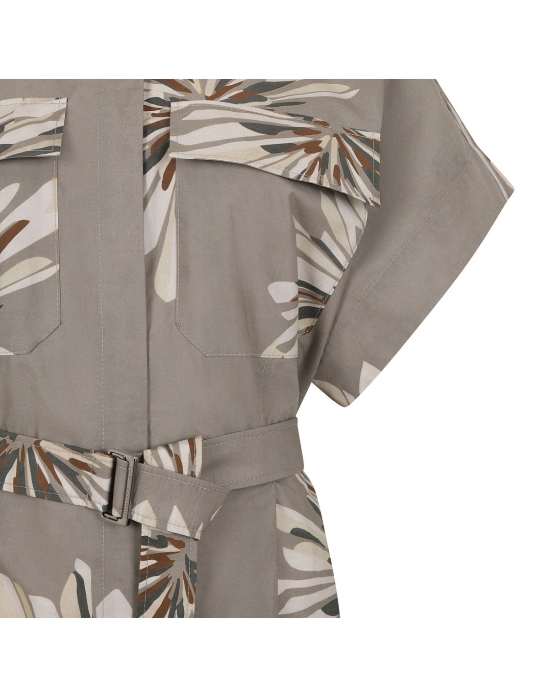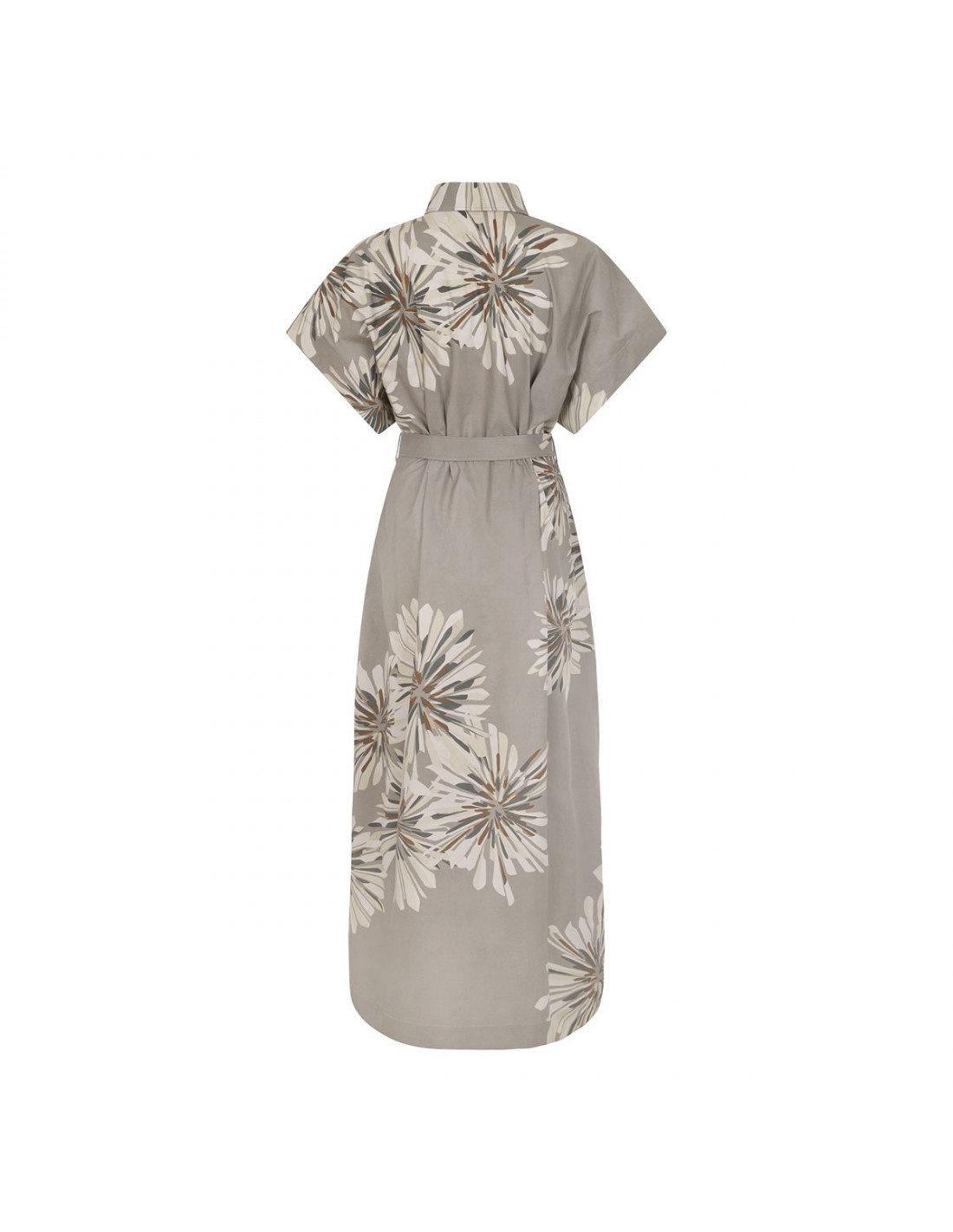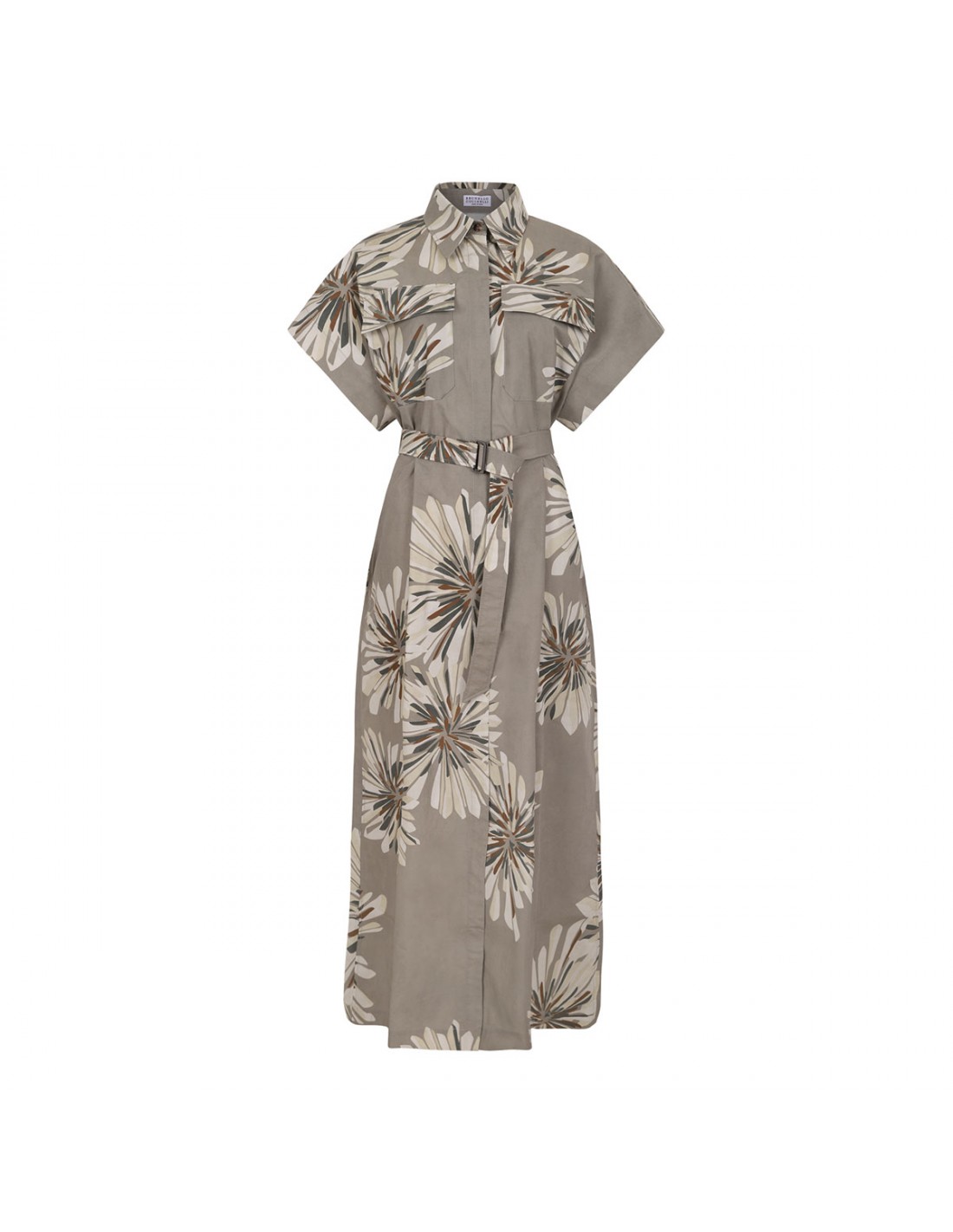 Khaki cotton poplin long shirt dress from Brunello Cucinelli featuring floral motif printed allover, front and back pinces, hidden button closure, front split, flap chest pockets, short sleeves, detachable belt.