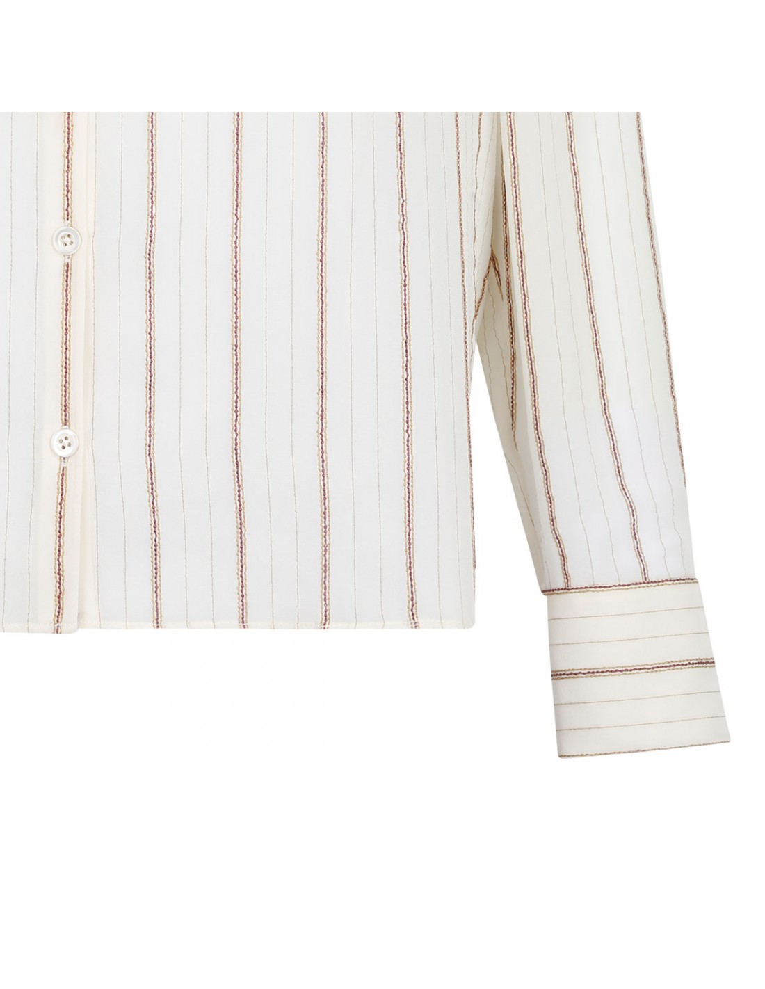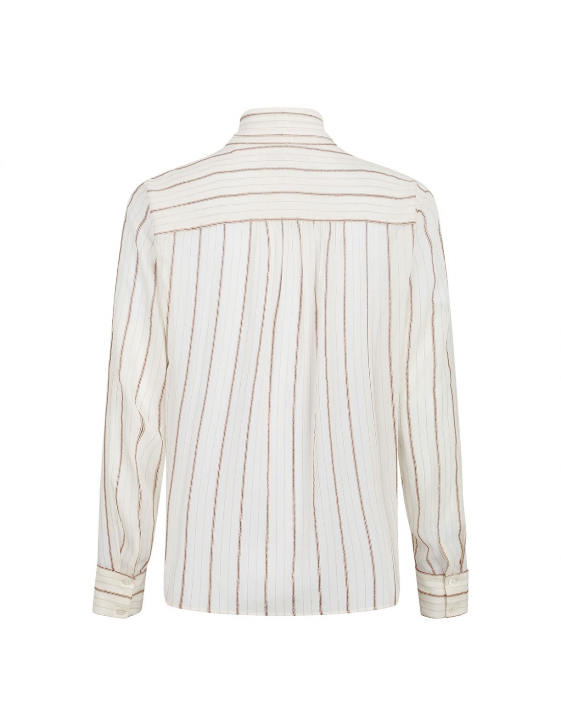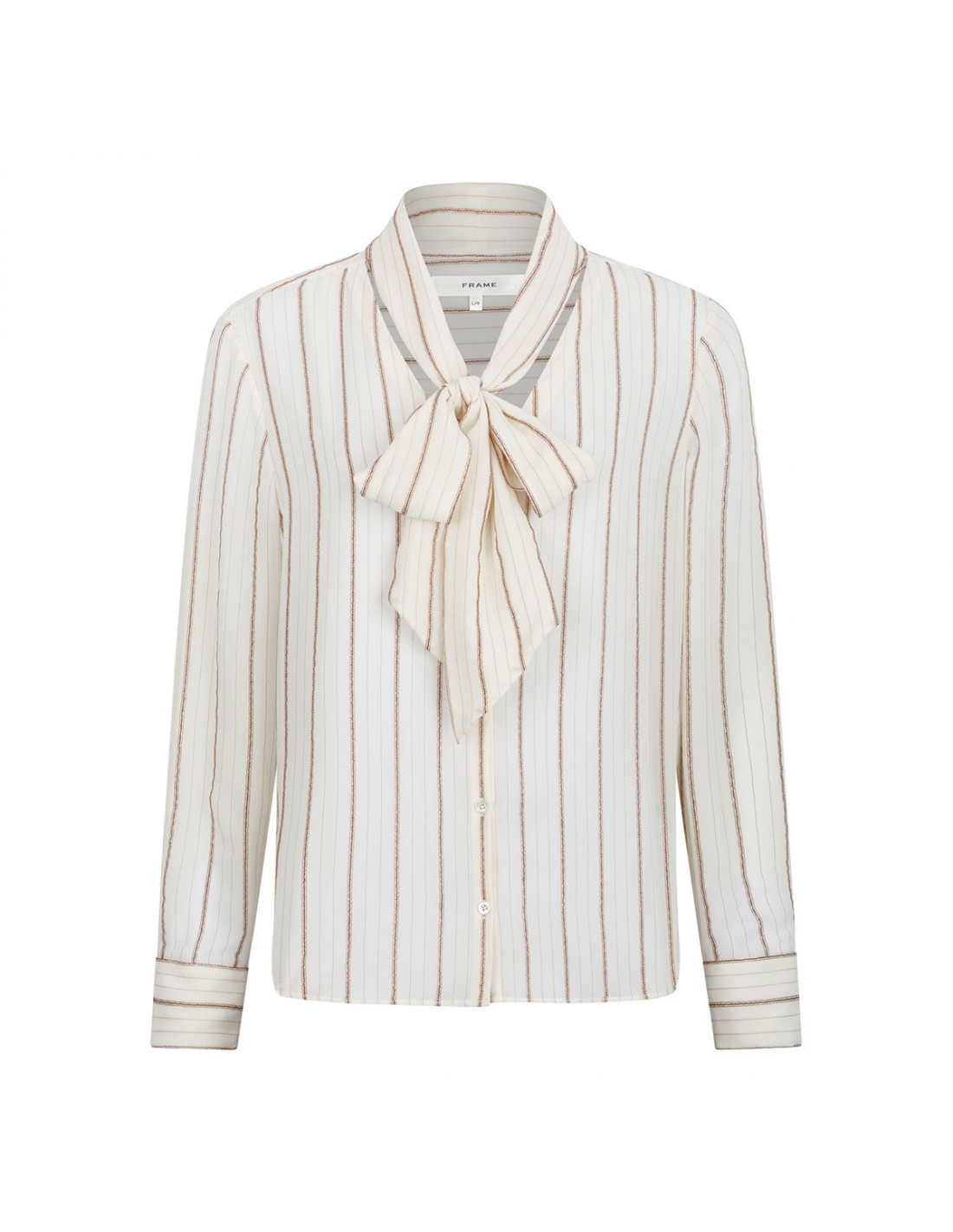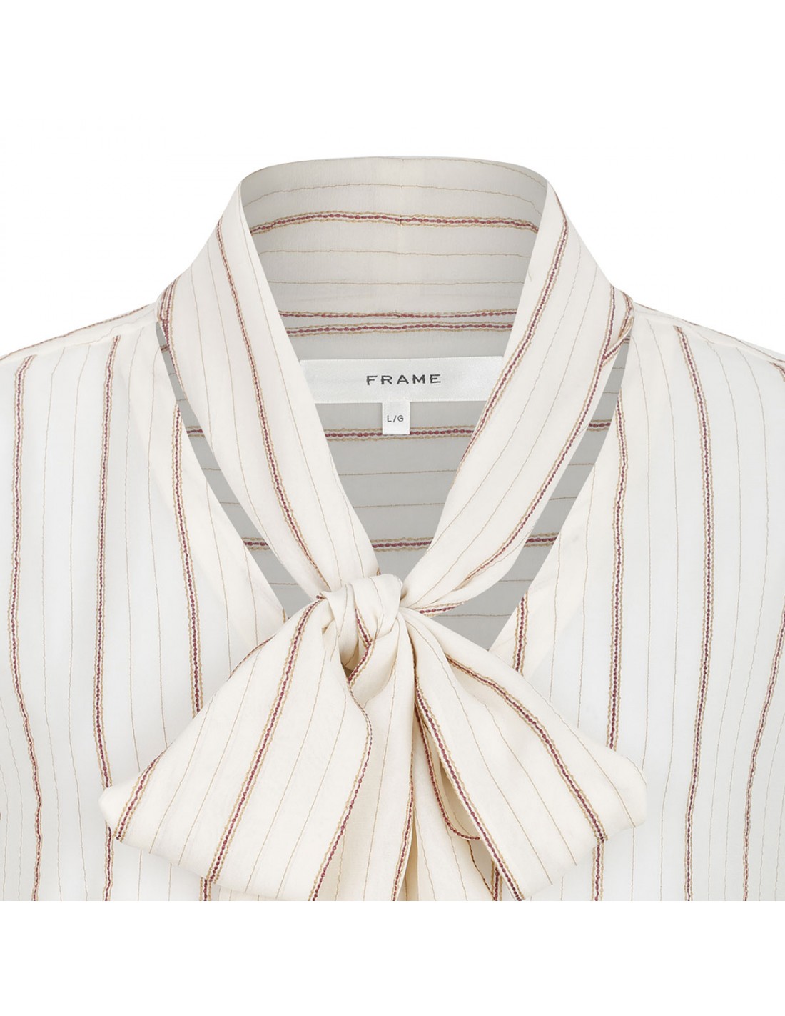 Cream and light brown textured silk blend The Striped blouse from Frame featuring striped motif allover, tie collar, fluid drape, long sleeves with buttoned cuffs.