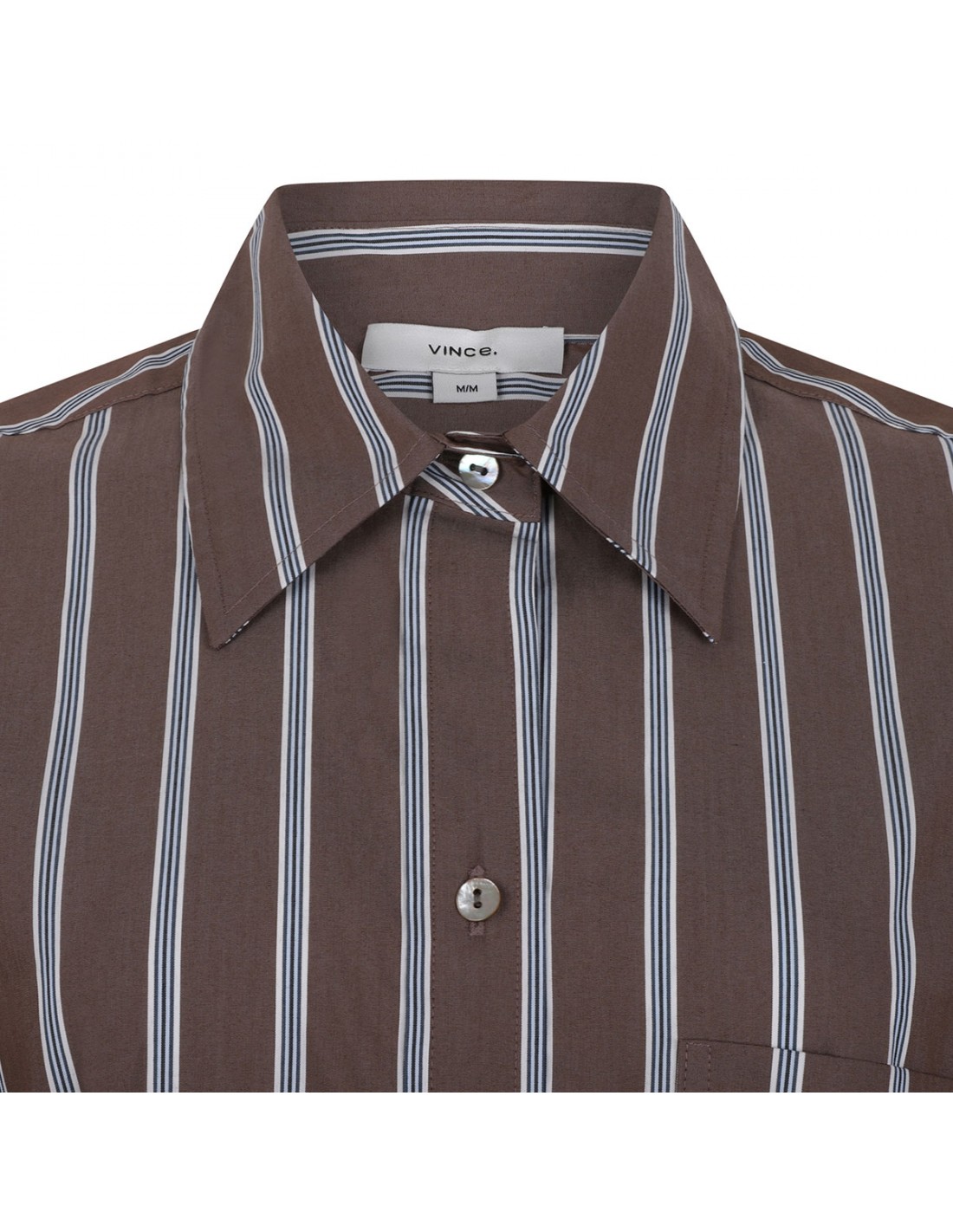 Taupe, blue and white stretch cotton blend shirt from Vince featuring striped pattern, mother-of-pearl button fastening, pointed collar, long sleeves with buttoned cuffs.