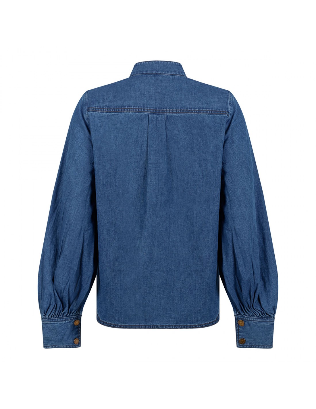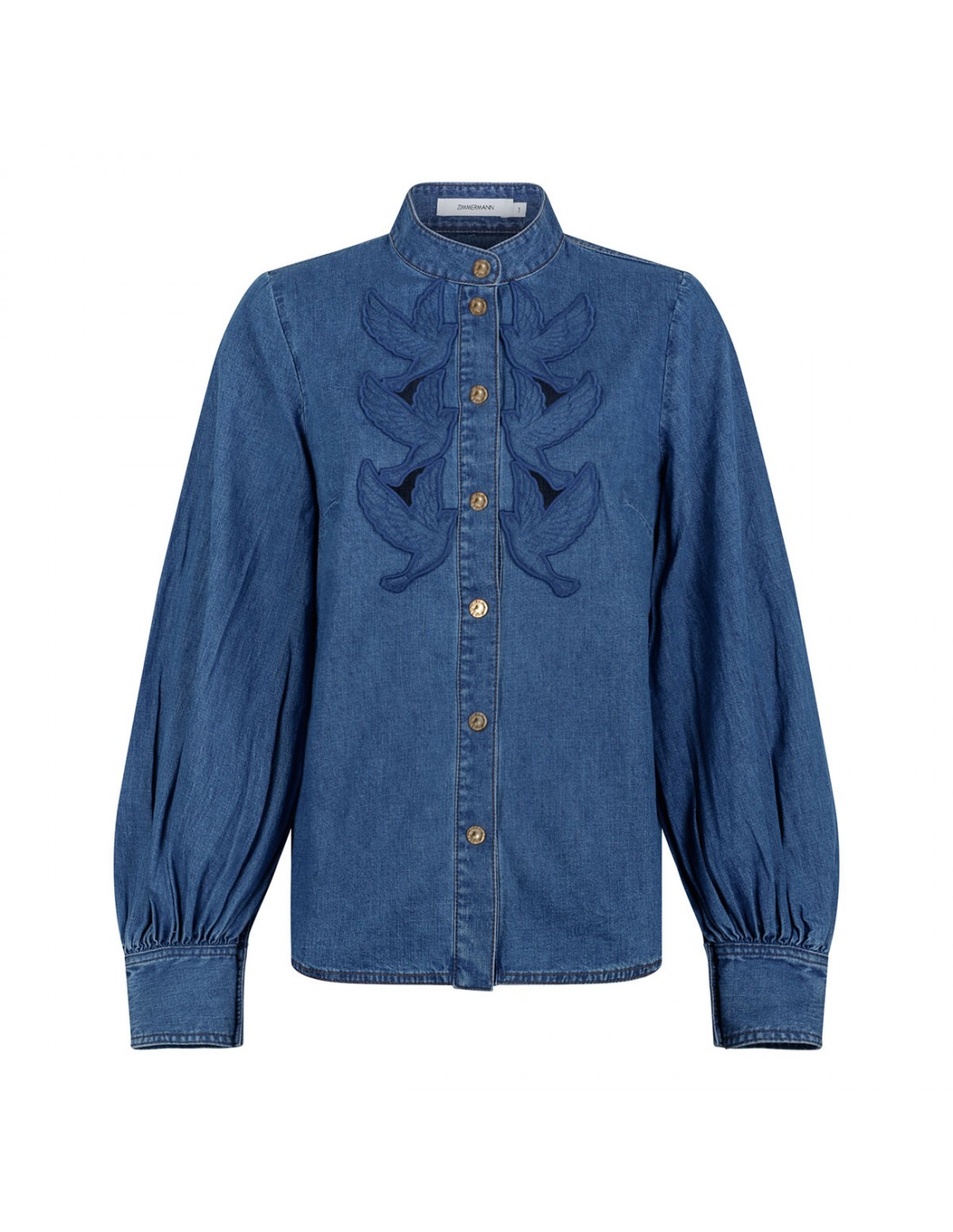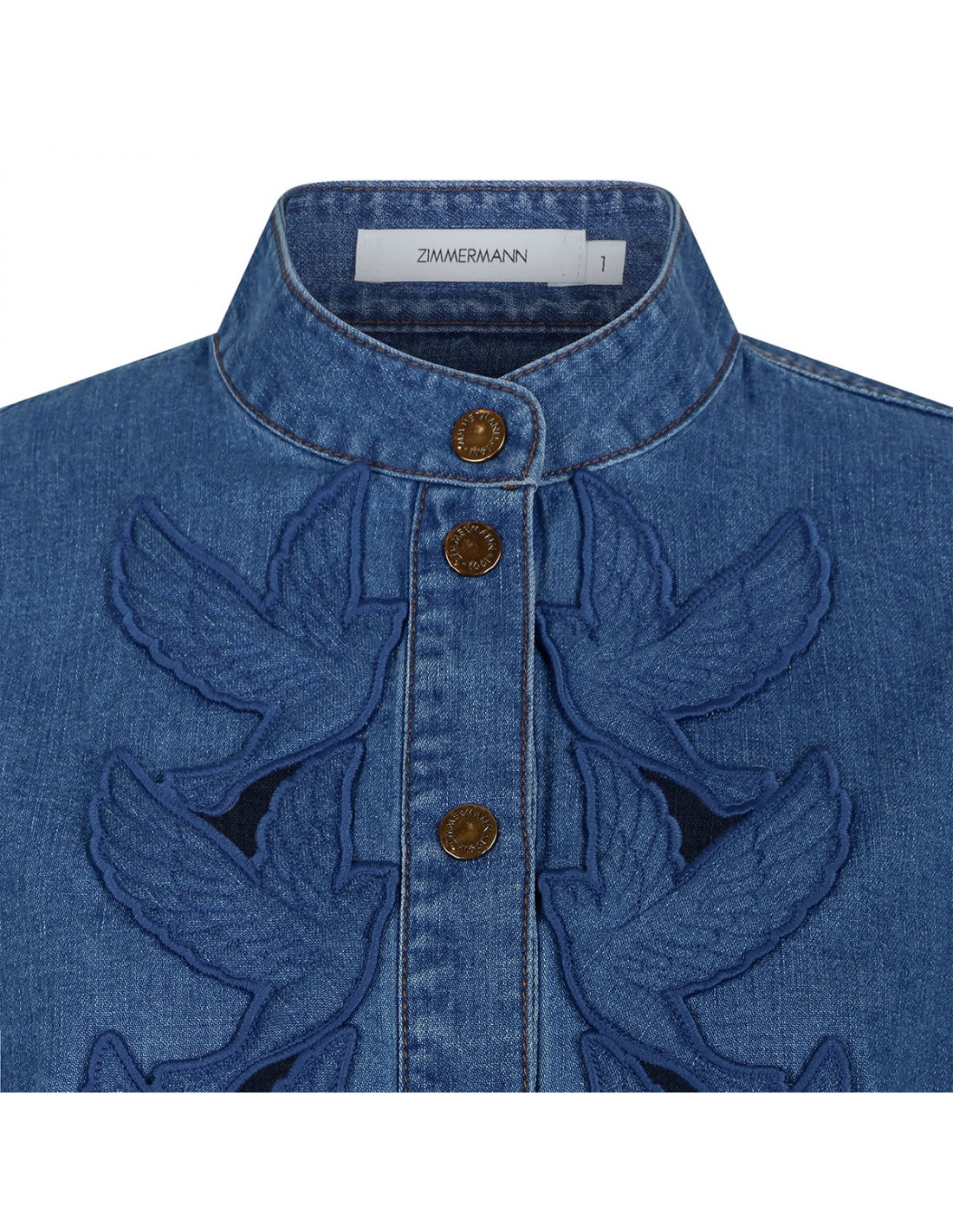 Blue denim cotton applique blouse from Zimmermann featuring embroidered bird cut-outs at front and cuffs, stand collar, long blouson sleeves with buttoned cuffs, concealed button fastening at front, partial side splits, asymmetric hem and nude lining.