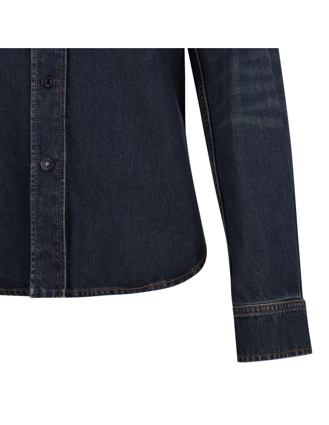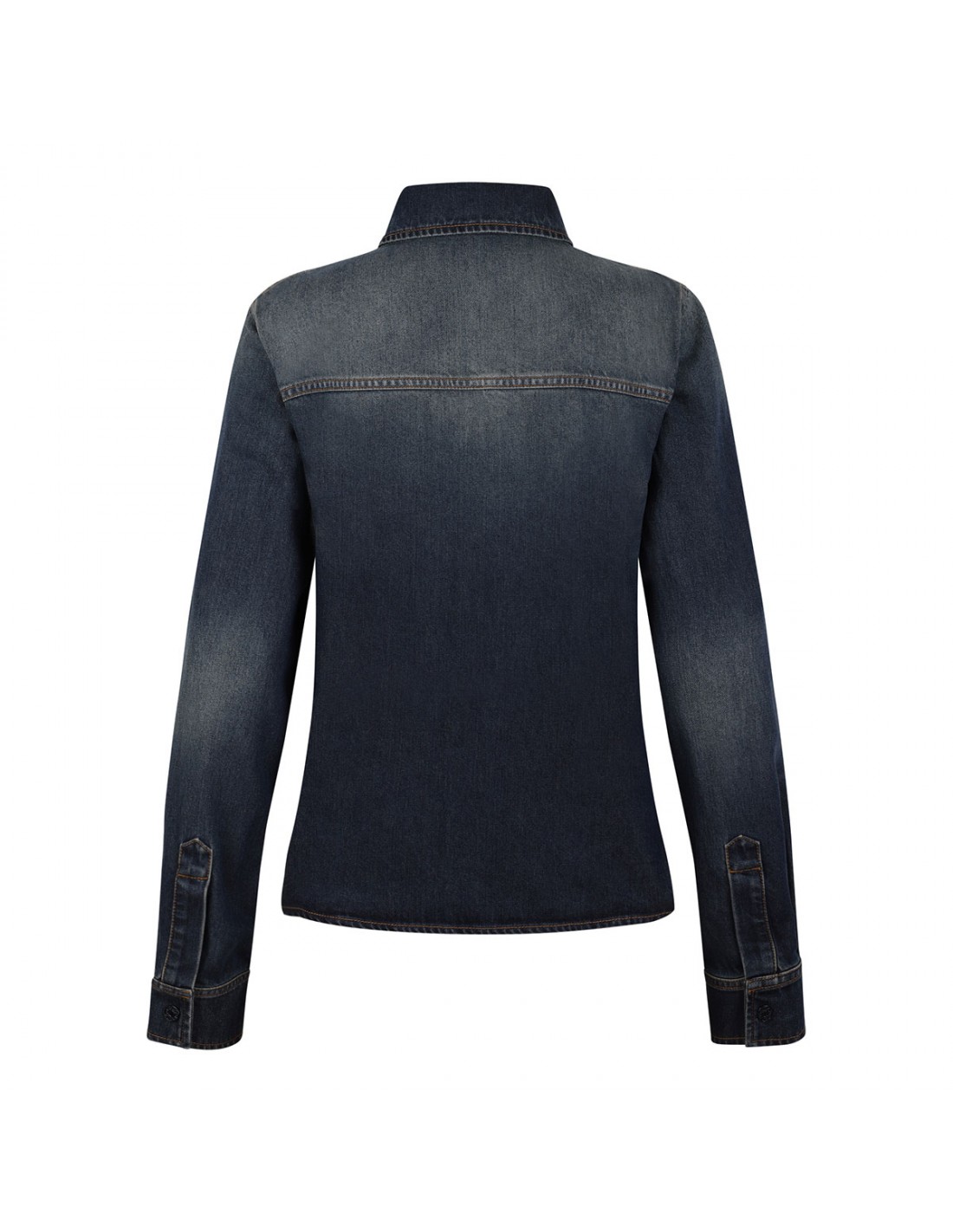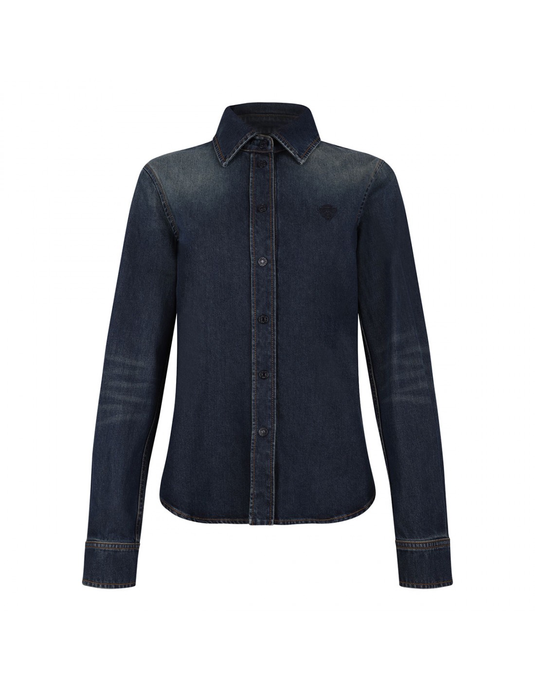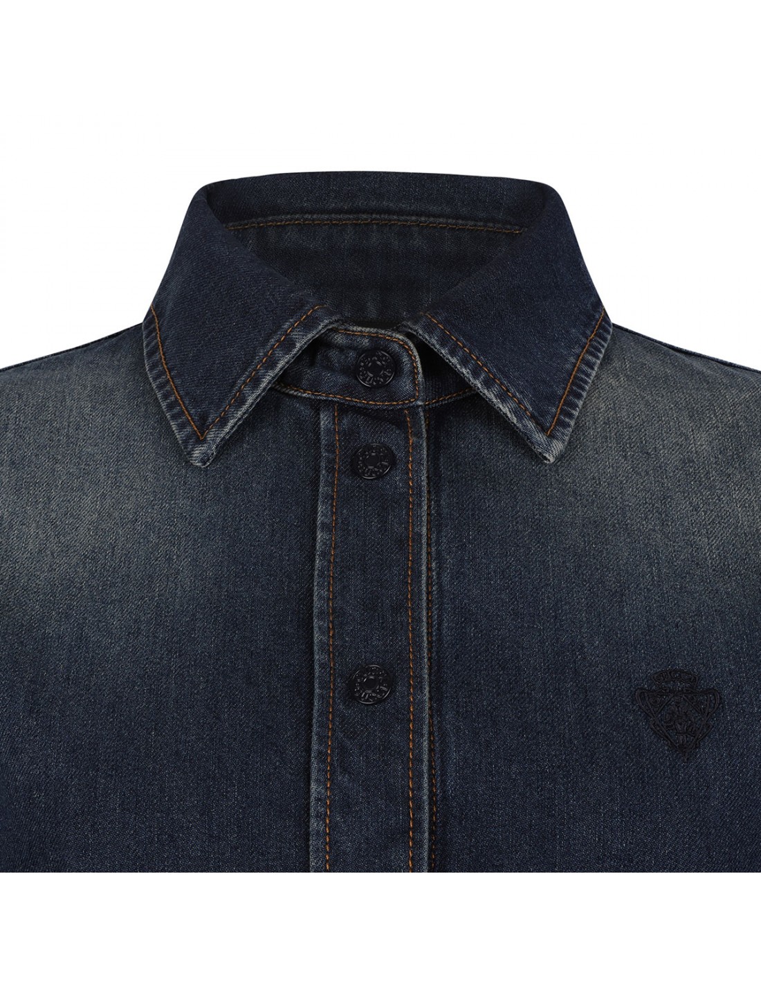 Blue washed bleached certified cotton denim shirt from Gucci featuring Gucci crest embroidery at chest, pointed collar, long sleeves with buttoned cuffs, button closure at front.