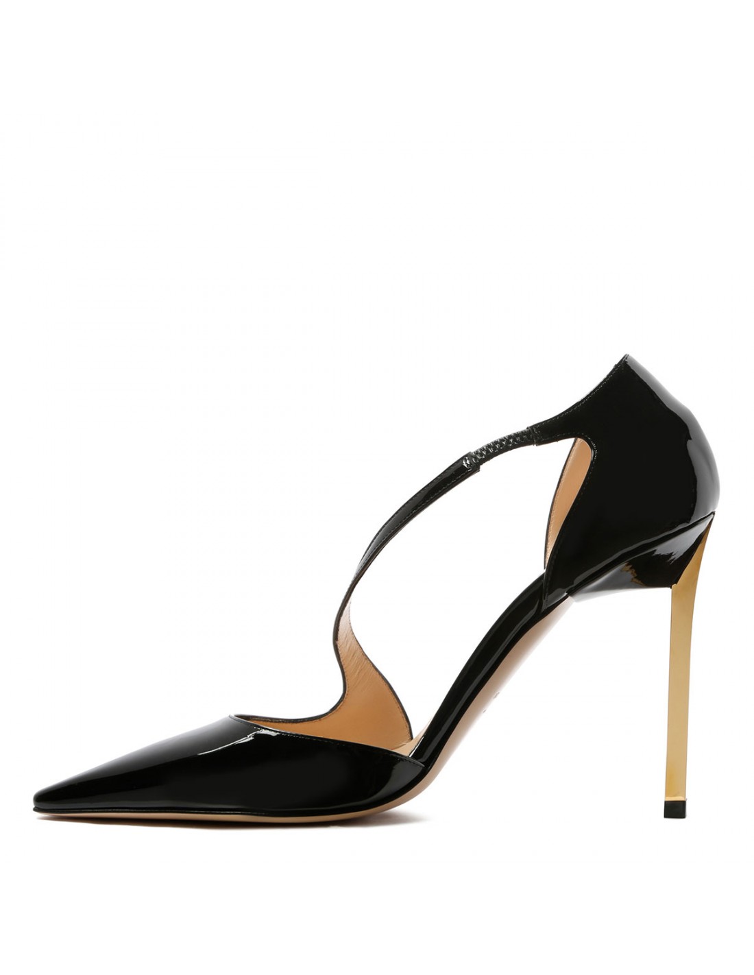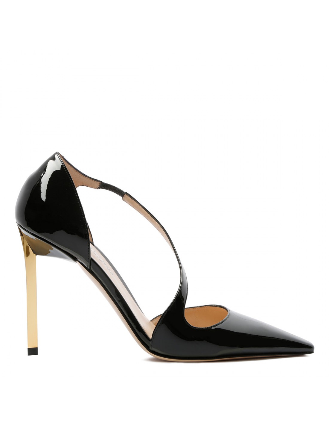 Black patent leather Newton pumps from Tom Ford featuring pointed toe silhouette, front strap with elastic insert, stainless steel 105 stiletto heel, nude leather lining, matching insole stamped with black logo, leather outsole.