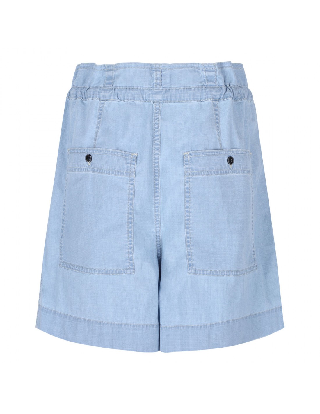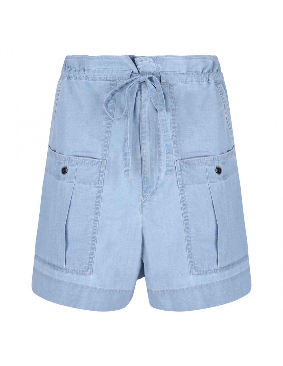 Light blue cotton-chambray Valdina shorts from Isabel Marant Etoile featuring roomy legs, pleated buttoned pockets at the thighs, high paperbag waist with drawstring, back buttoned patch pockets.