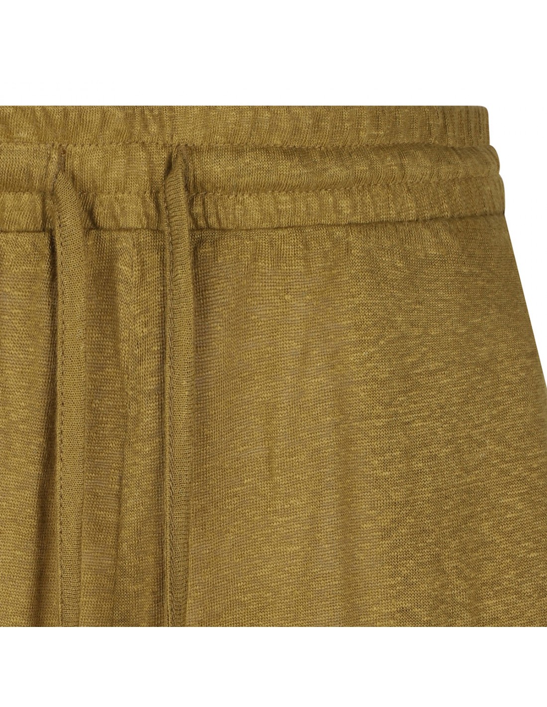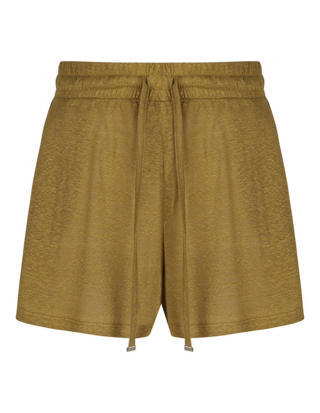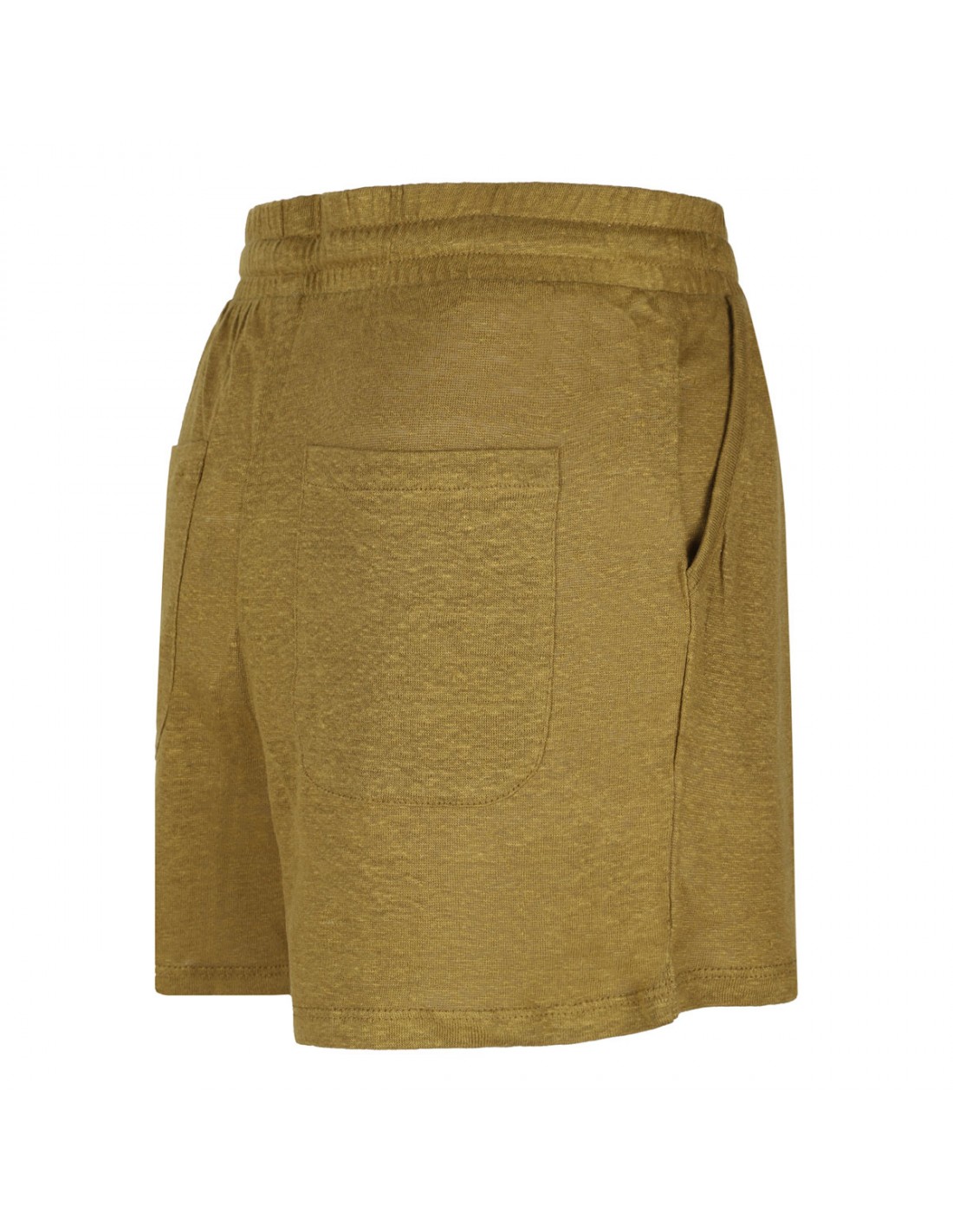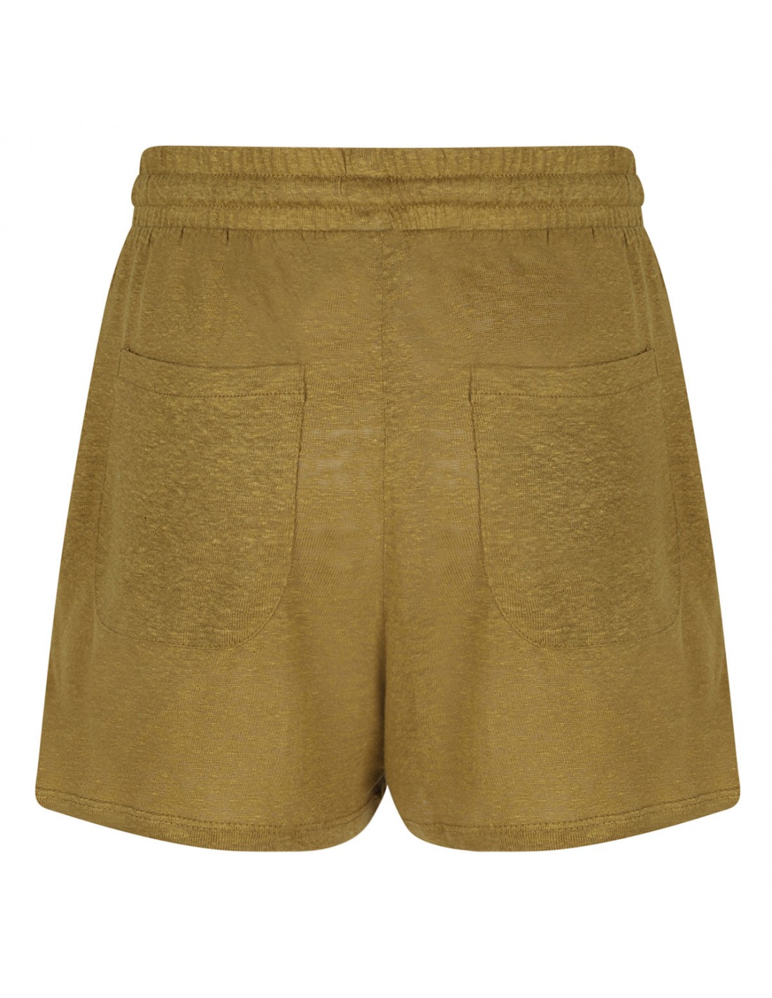 Military green linen Anthony shorts from Le Noir featuring elasticated waistband with drawstring, side pockets and back patch pockets.