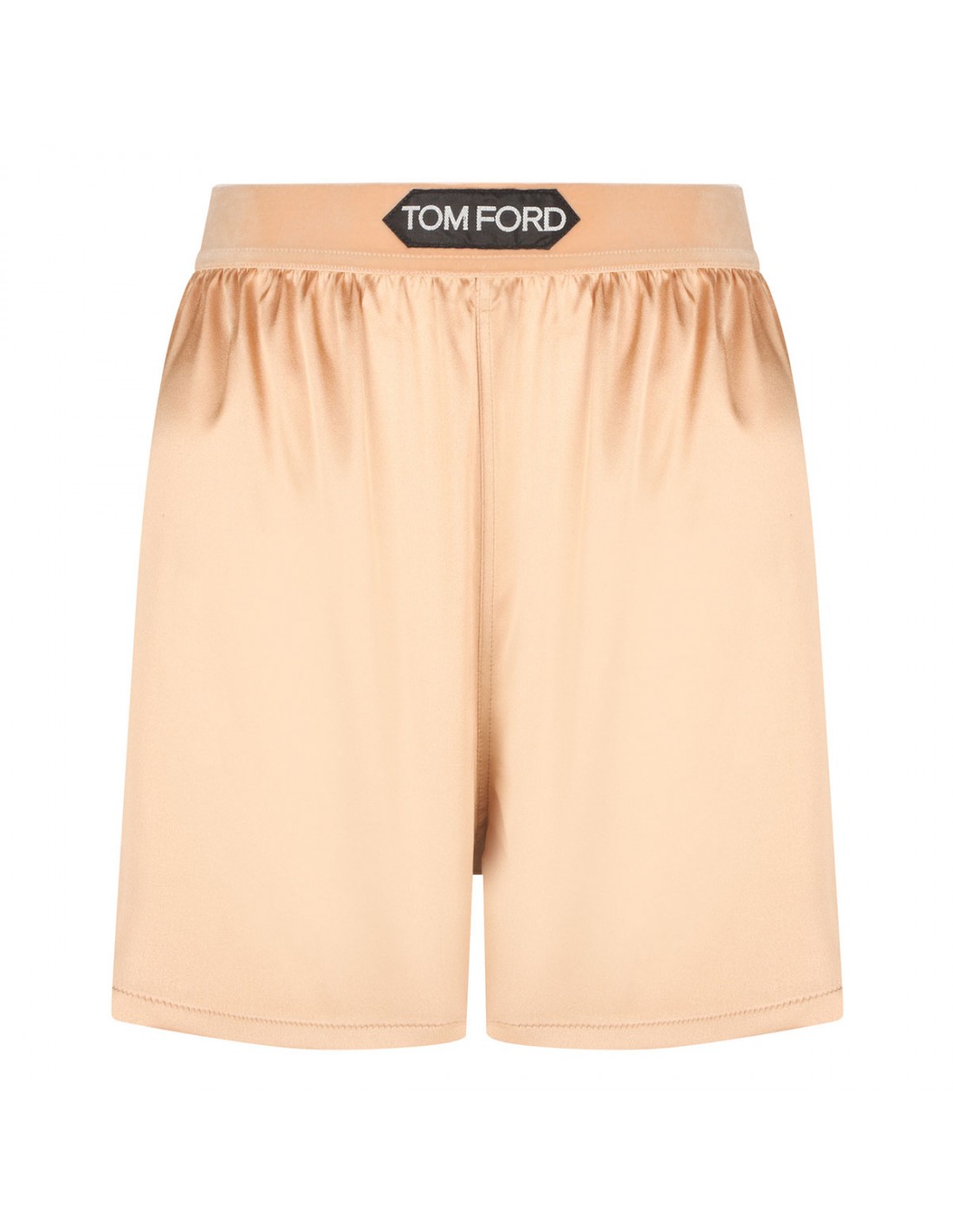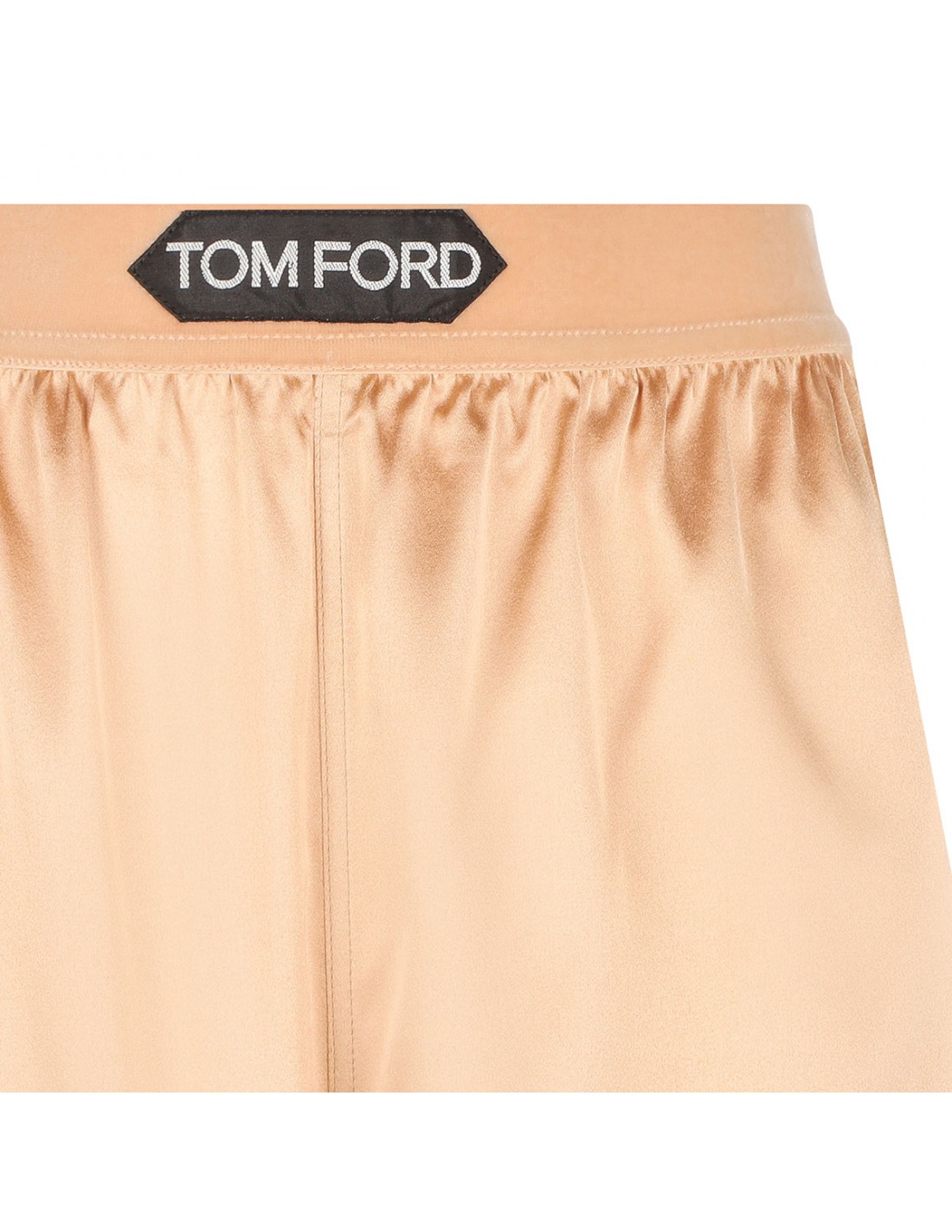 Pale beige stretch silk satin boxer shorts from Tom Ford featuring velvet elastic waistband with contrasting white logo patch.