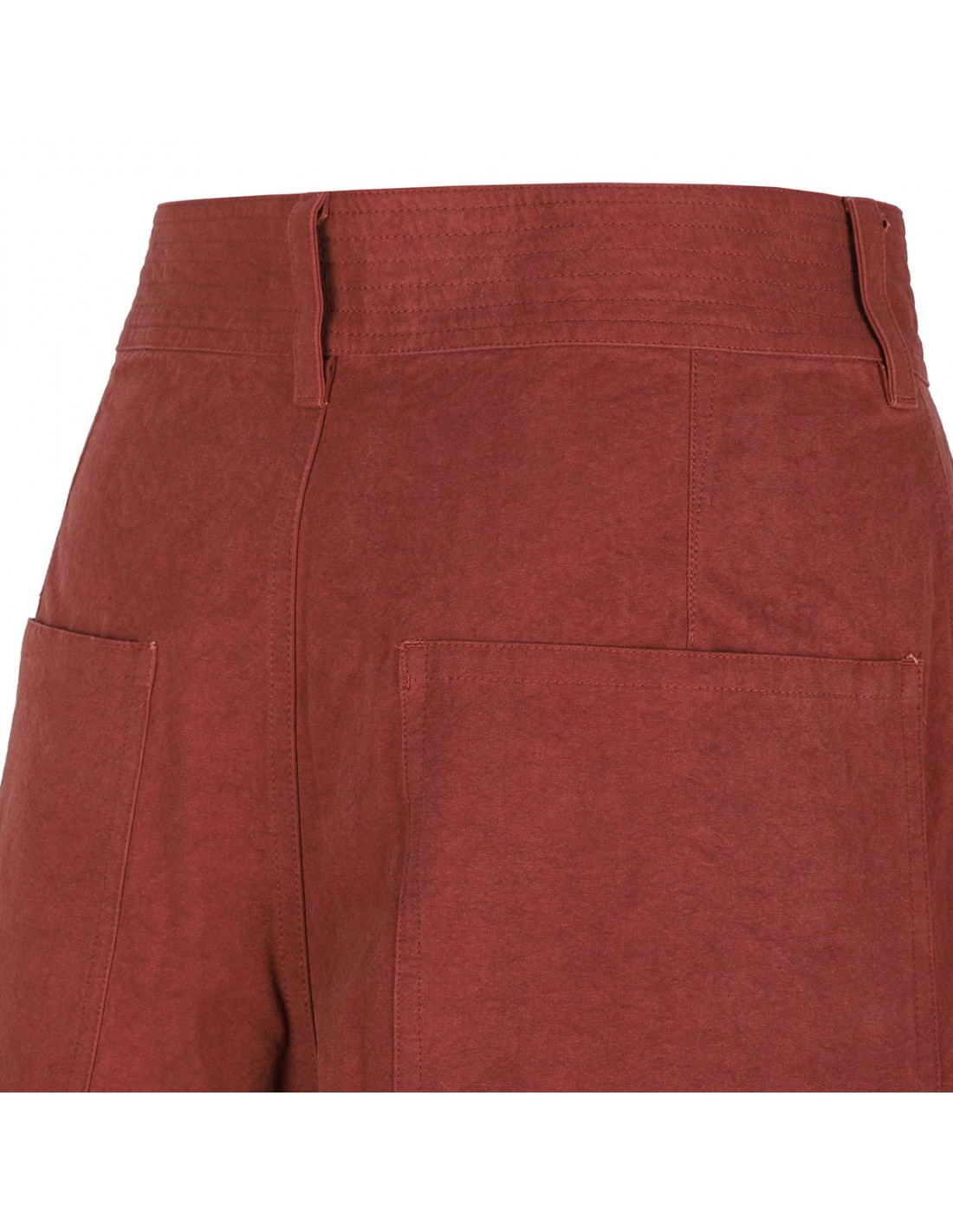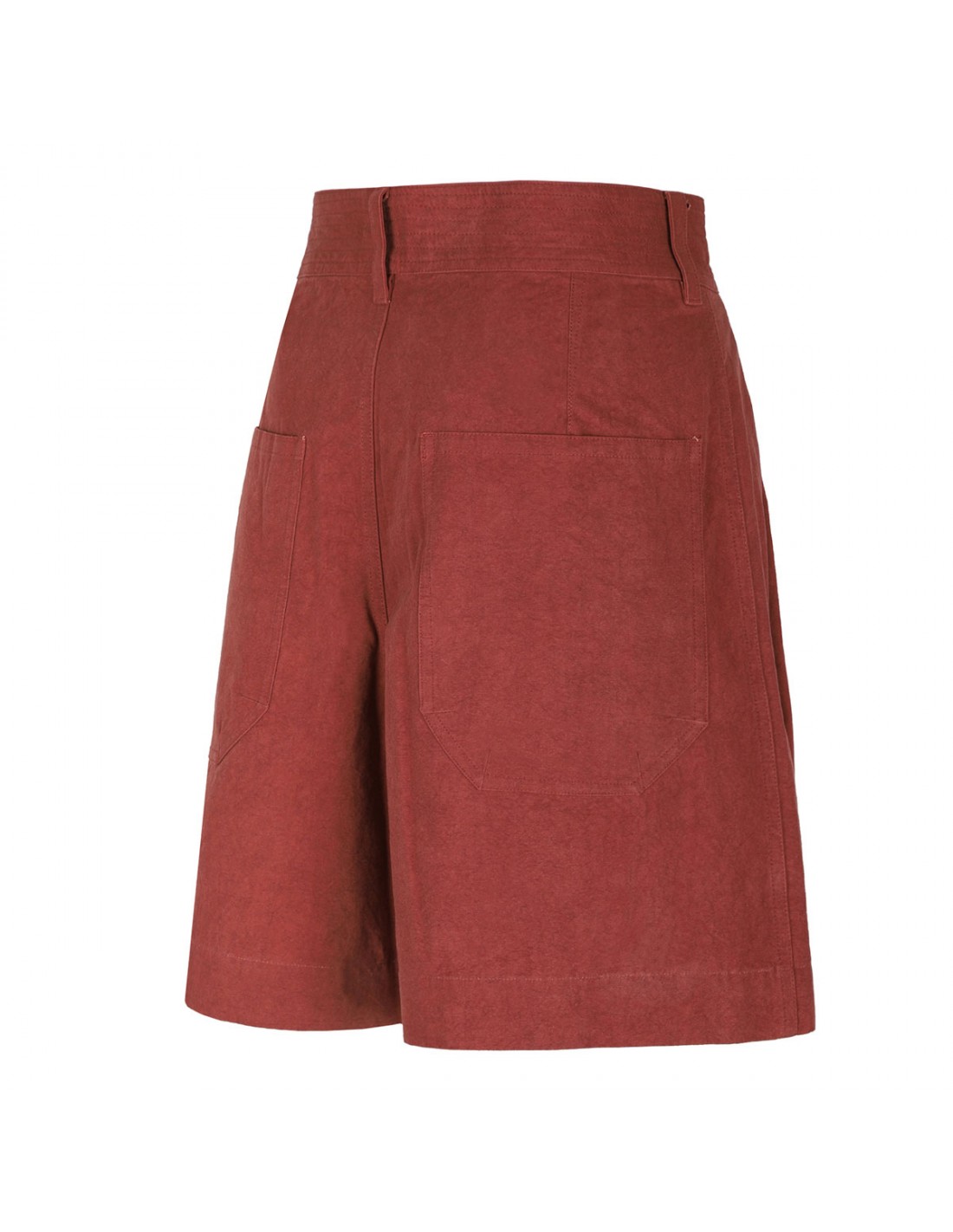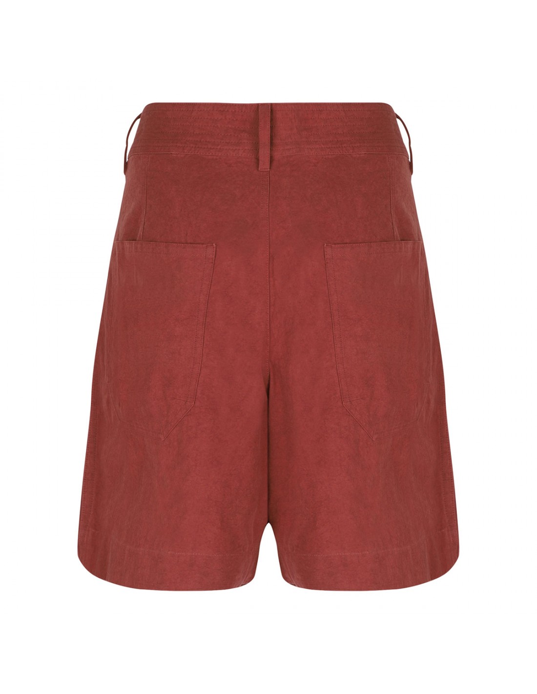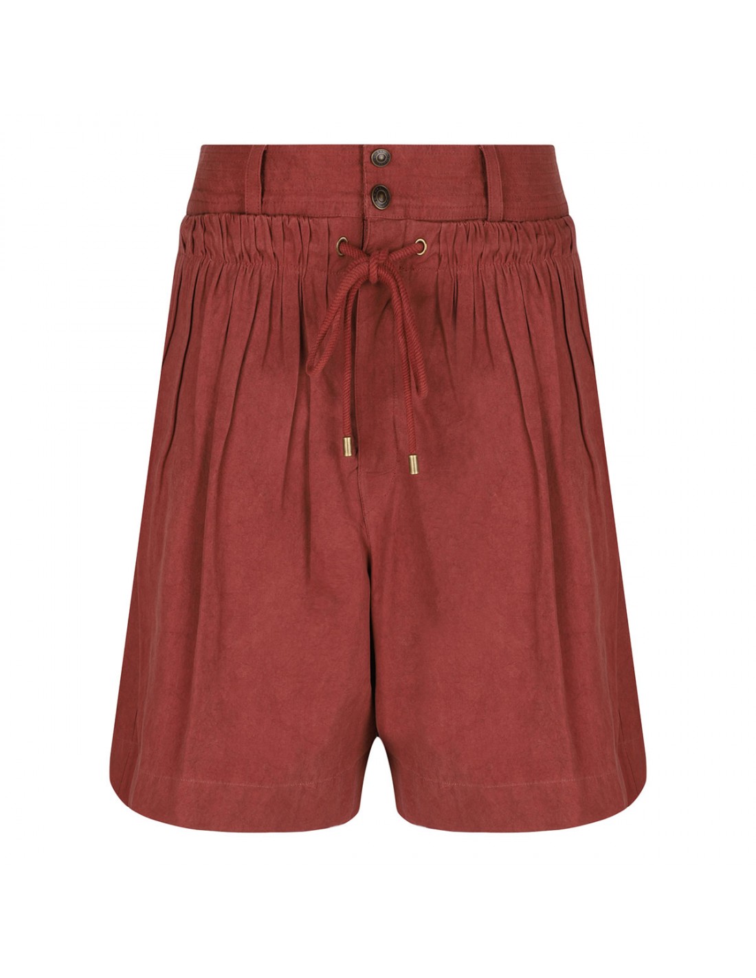 Burnt red lightweight cotton-chambray Ingrid shorts from Isabel Marant featuring drawstring under the high waist, side pockets, relaxed legs, back patch pockets, belt loops on the waistband, button closure.