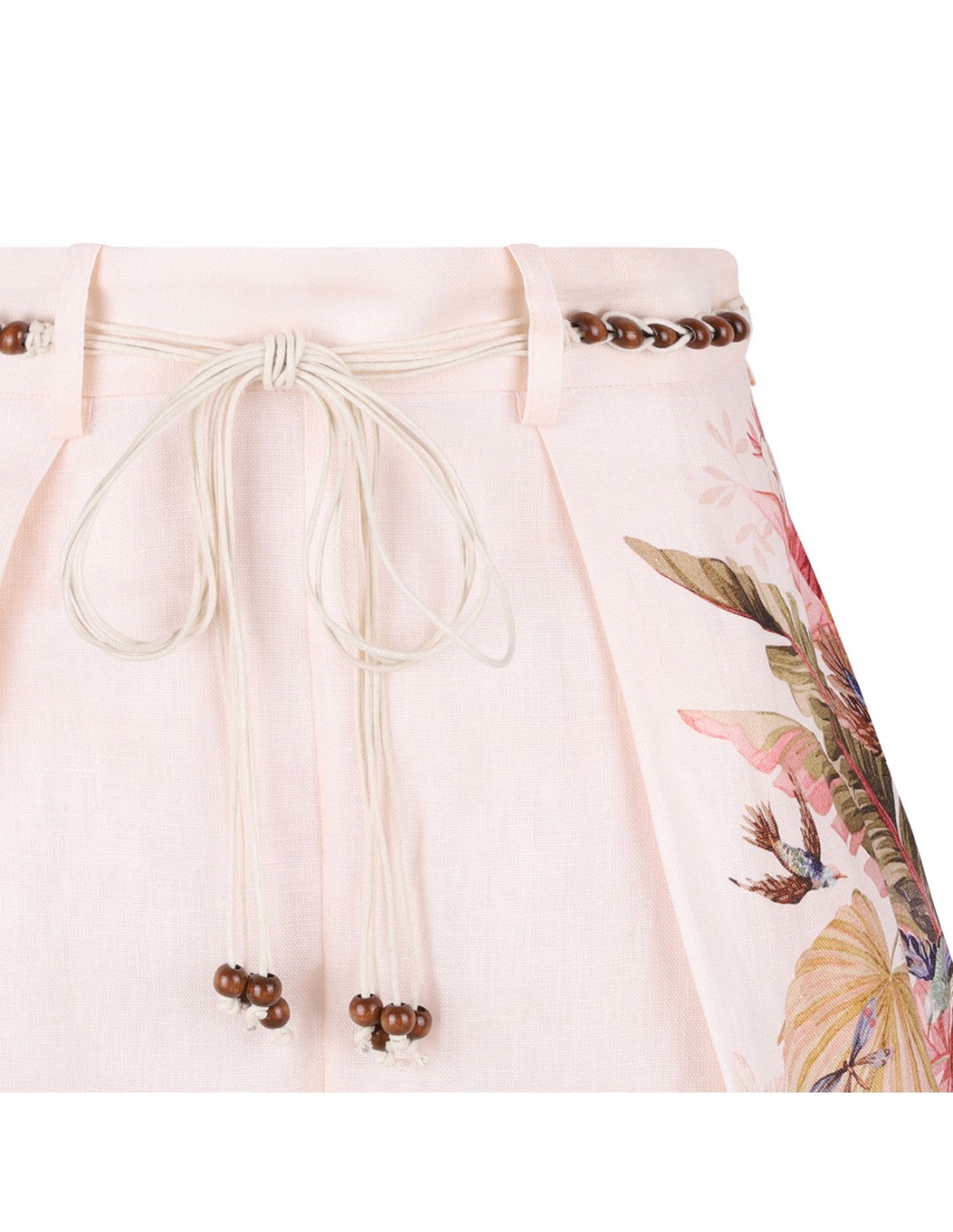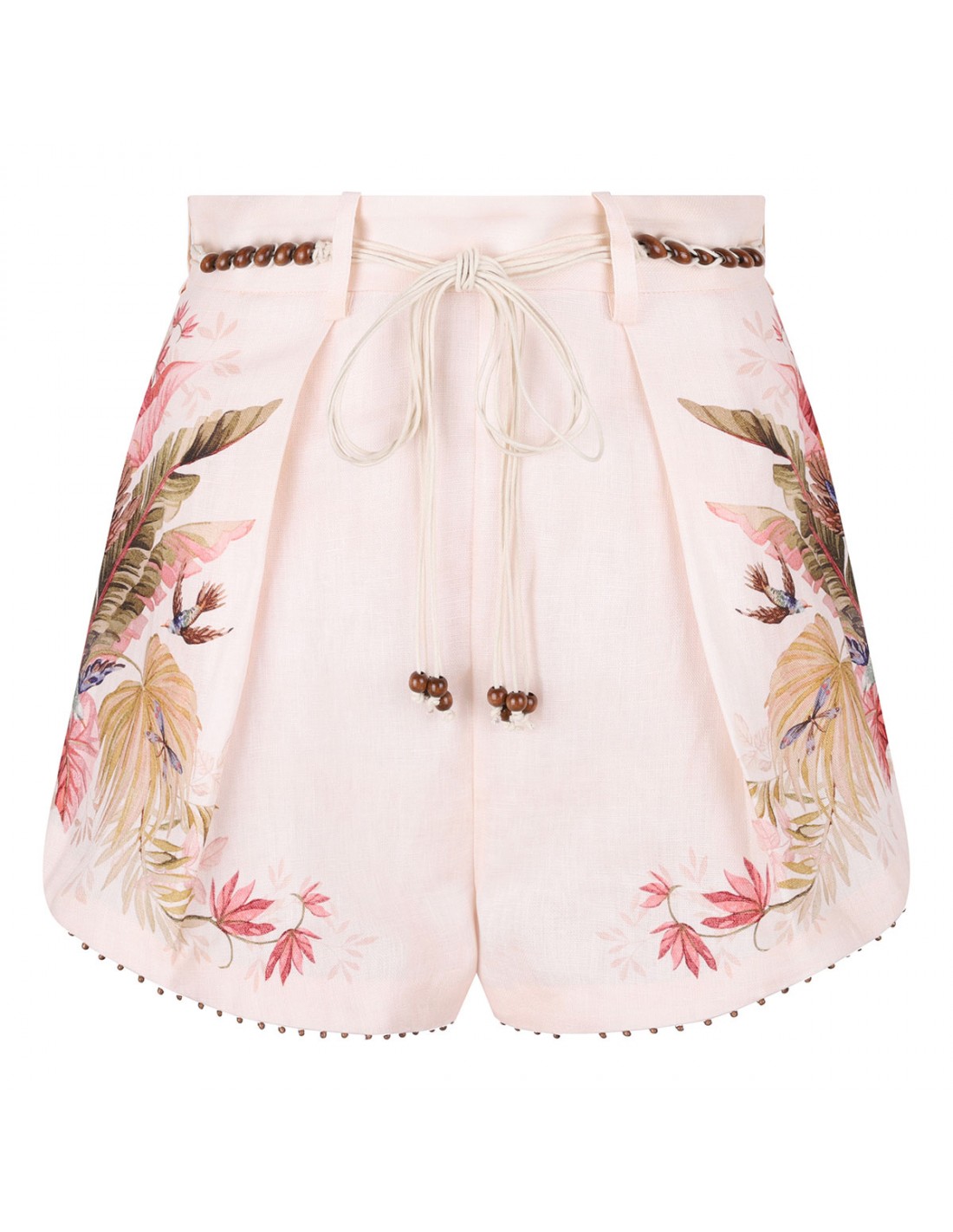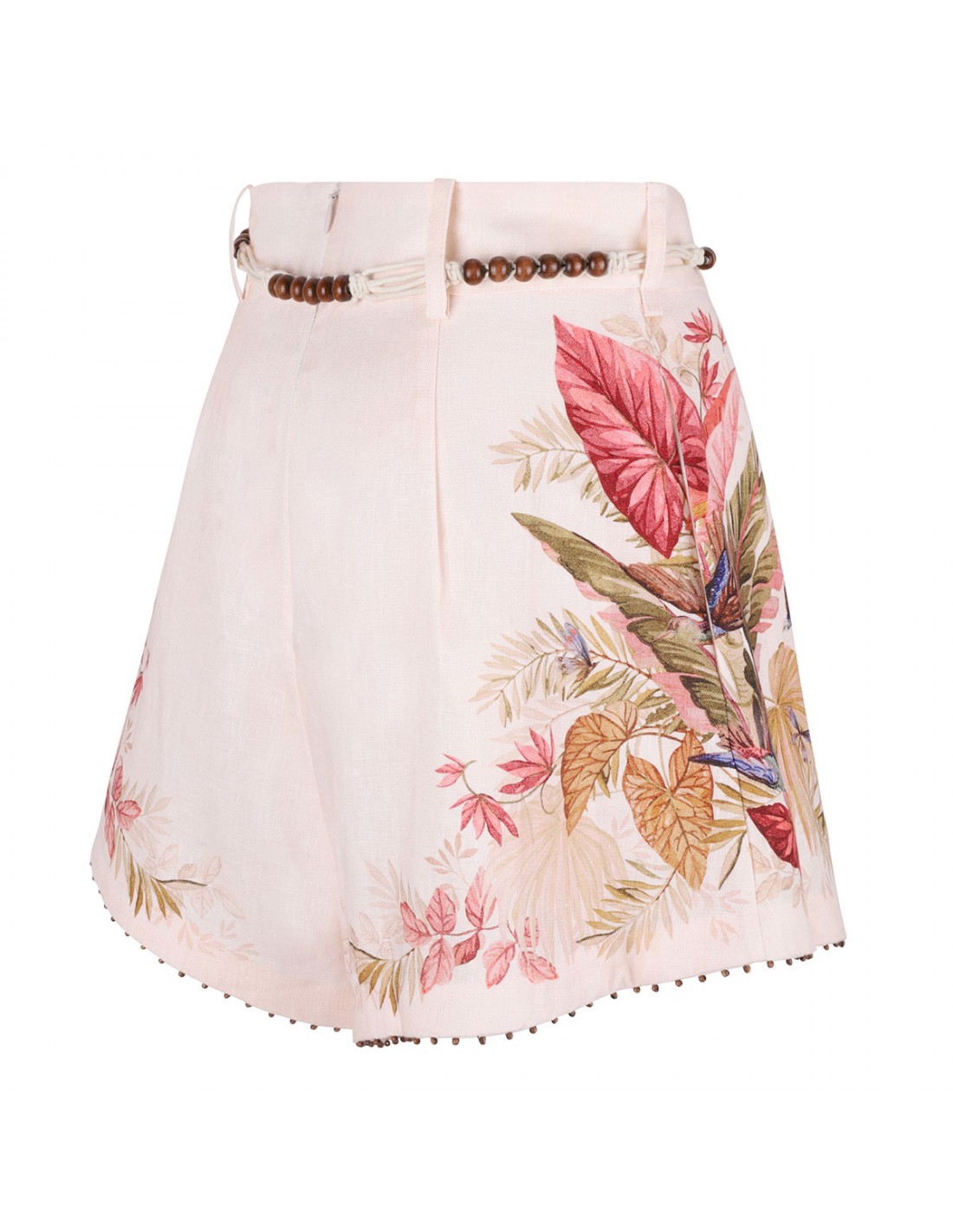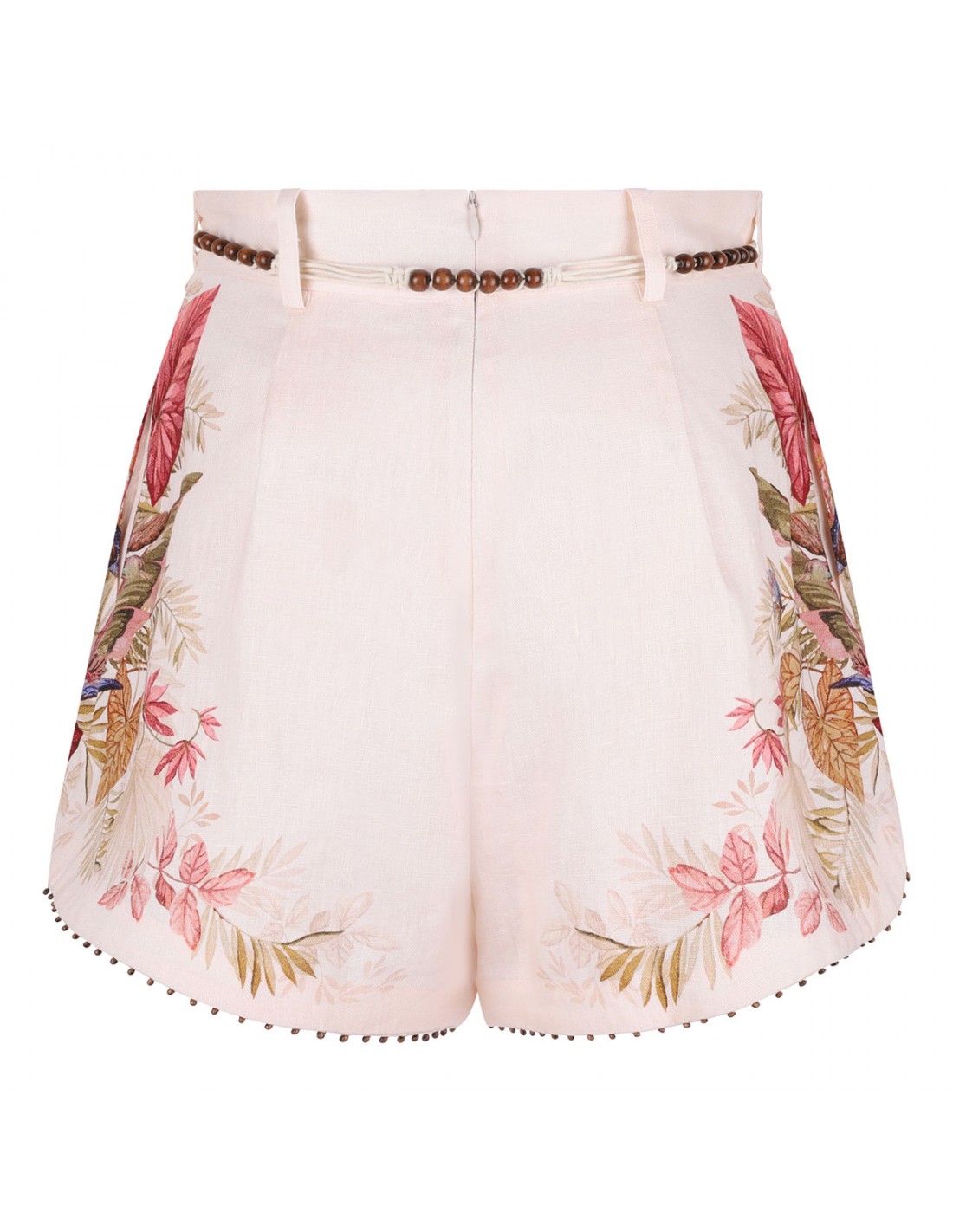 Cream linen Ascension tuck shorts from Zimmermann featuring palm floral motif, high waist, wood beaded tie belt, side pockets, belt loops at waist, wooded bead trim detail at hem, concealed zip fastening at back, centre back zip closure. Lined.