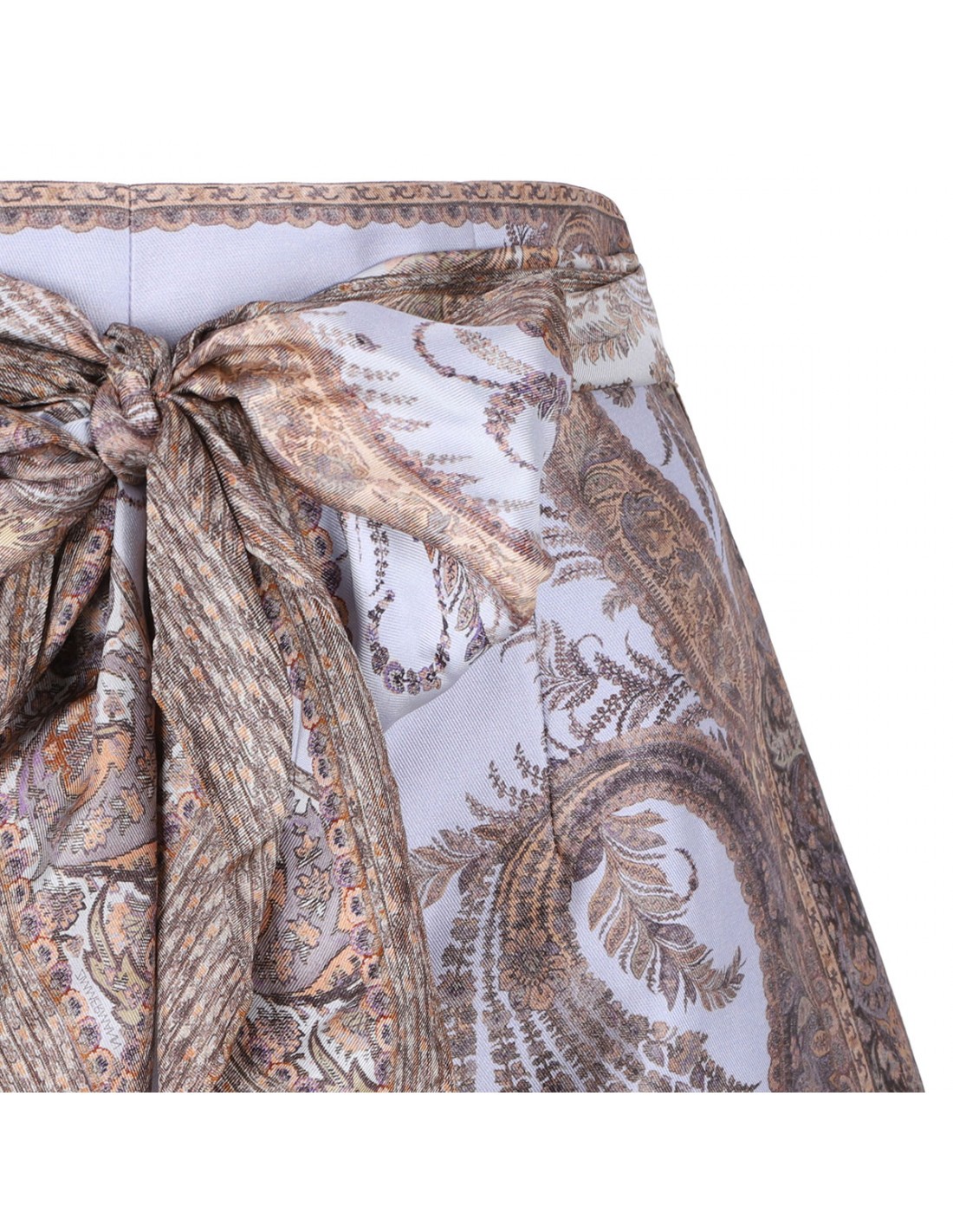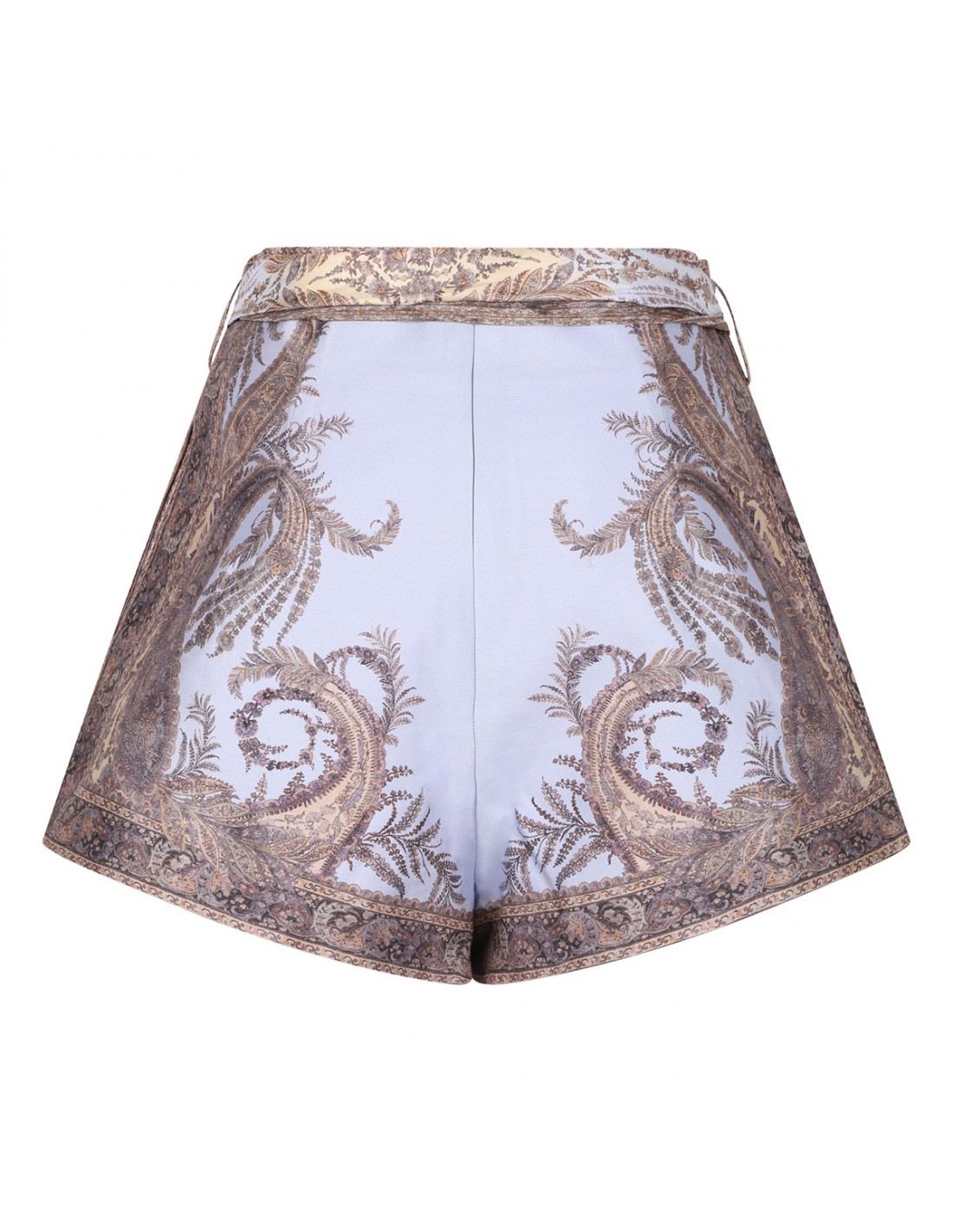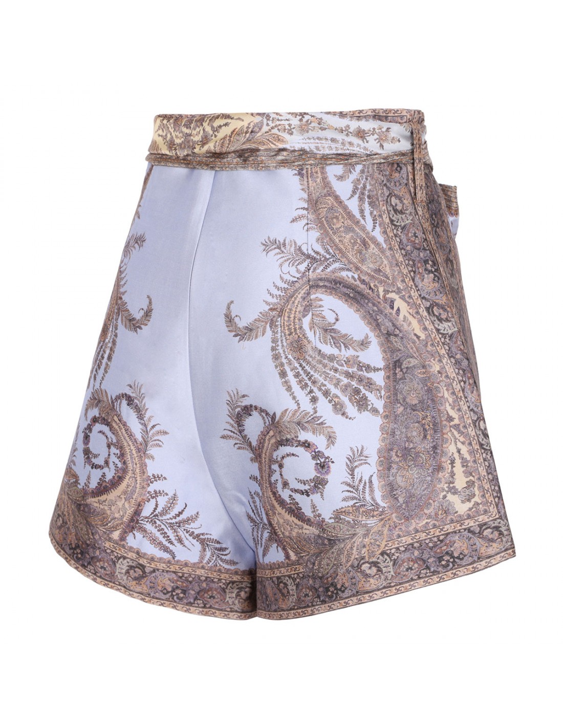 Lilac silk blend Hypnotic flat front shorts from Zimmermann featuring paisley motif, high waist, detachable self-tie belt, concealed zip fastening at centre back, belt loops at waist, side pockets.