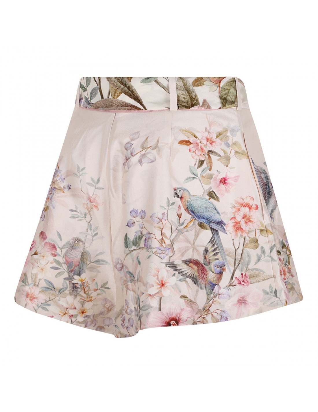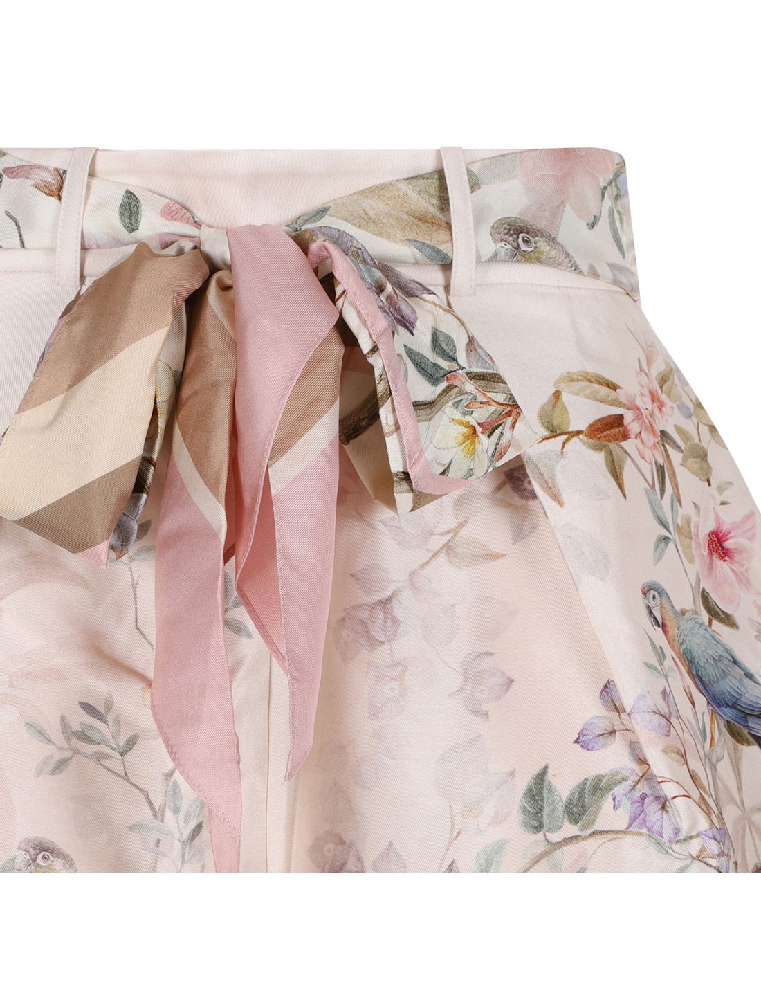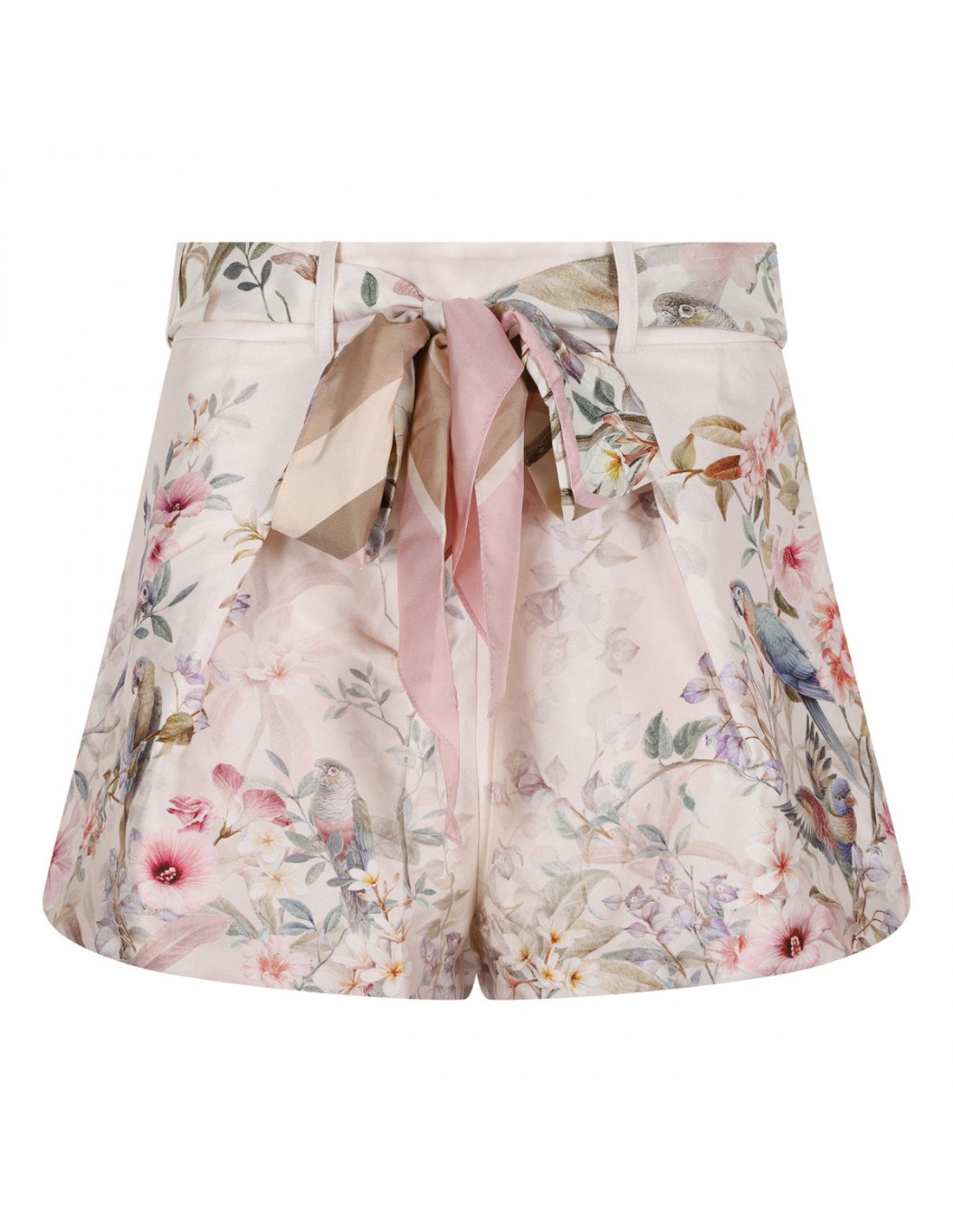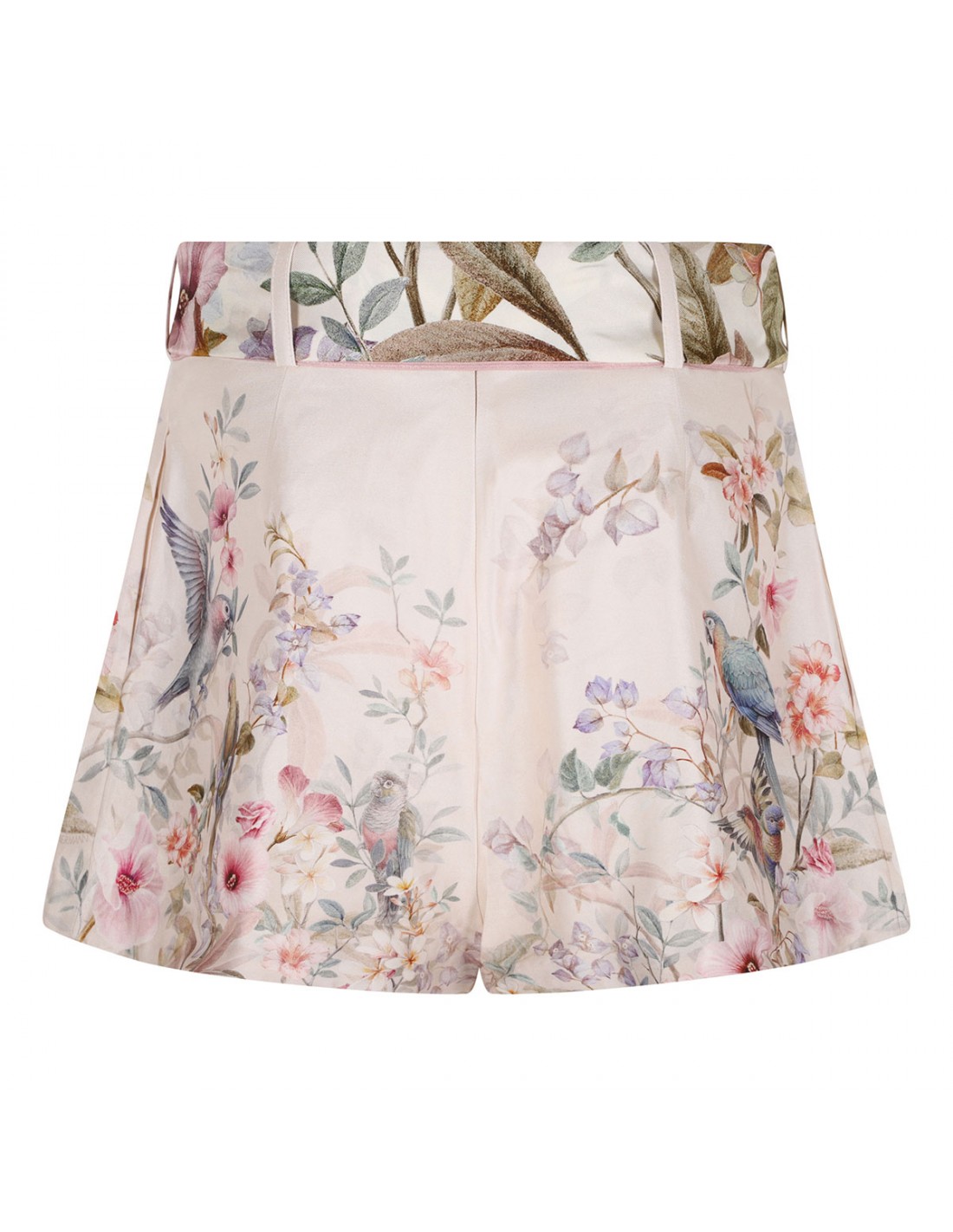 Cream silk-cotton blend Rebellion tuck shorts from Zimmermann featuring mid-rise, detachable self-tie belt scarf, floral motif printed allover, deep tucks at centre front, side pockets, concealed zip fastening at back, belt loops at waistband.