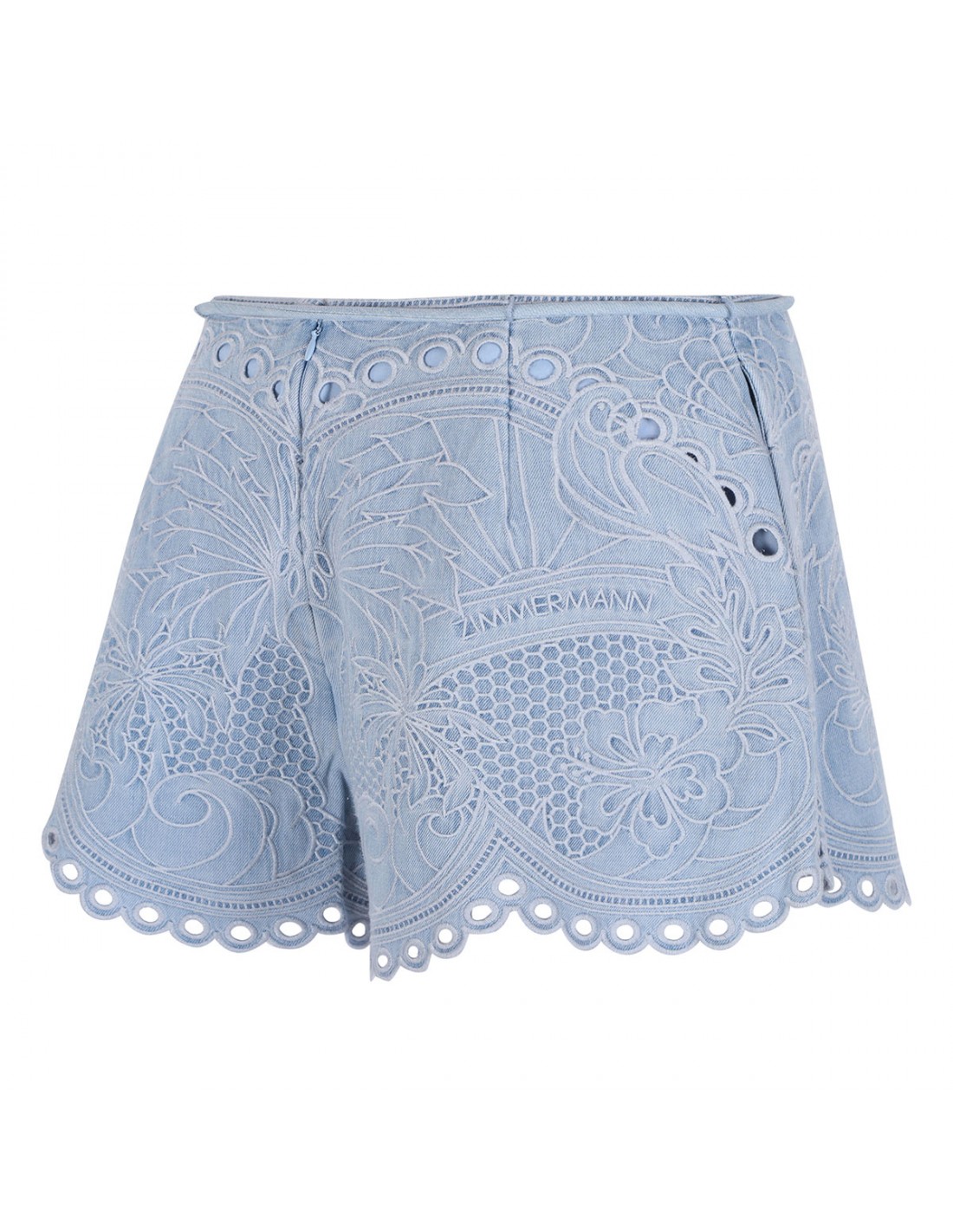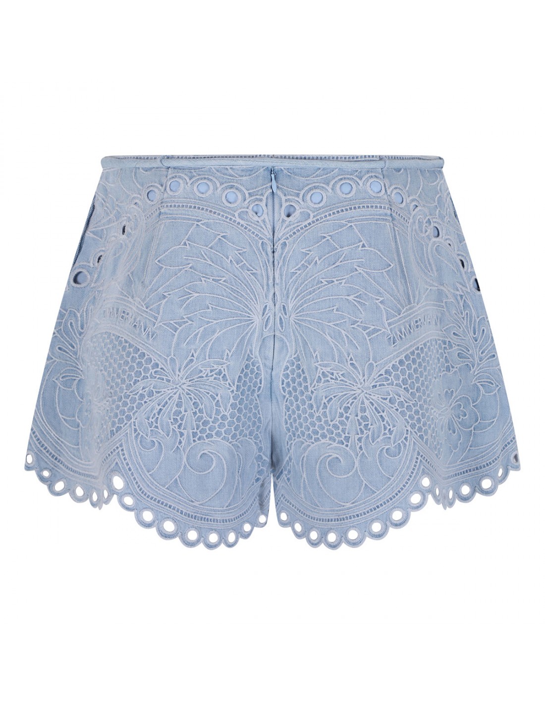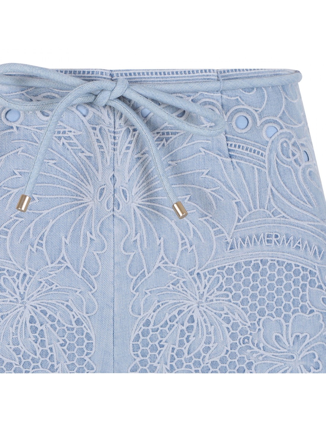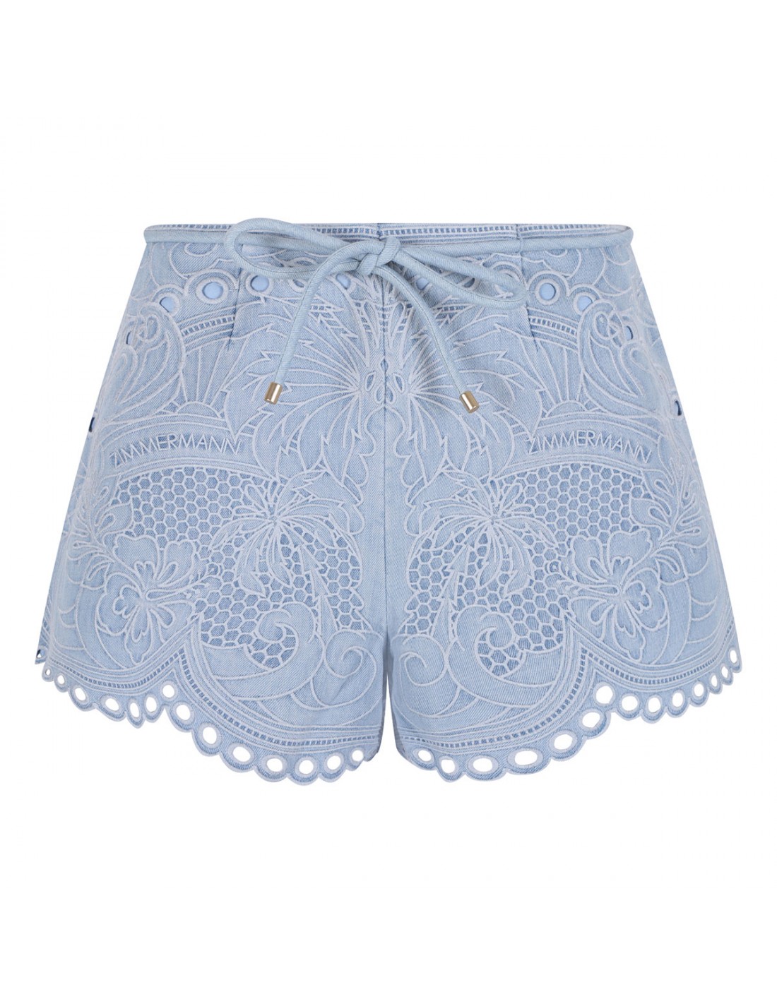 Ice blue denim Daylight shorts from Zimmermann featuring scalloped trims, embroidery throughout, mid-rise, drawstring waistband with toggle ends, side pockets, chain stitch belt loops at side seams, concealed zip fastening at back.