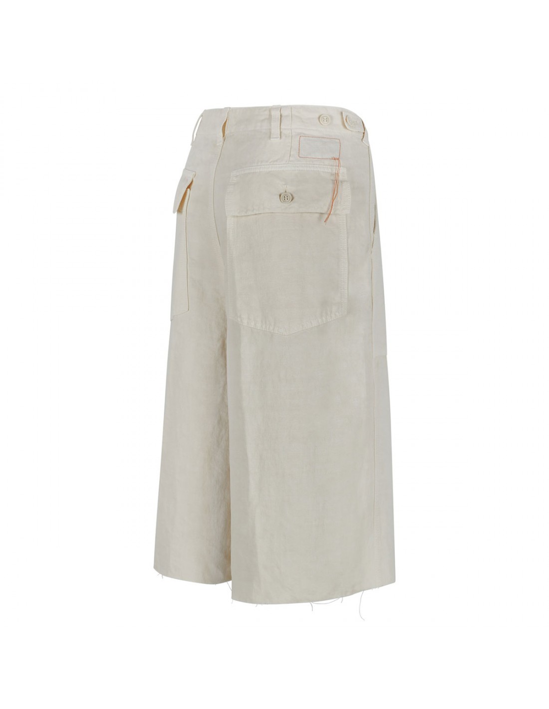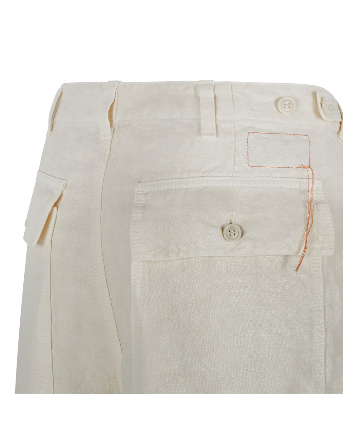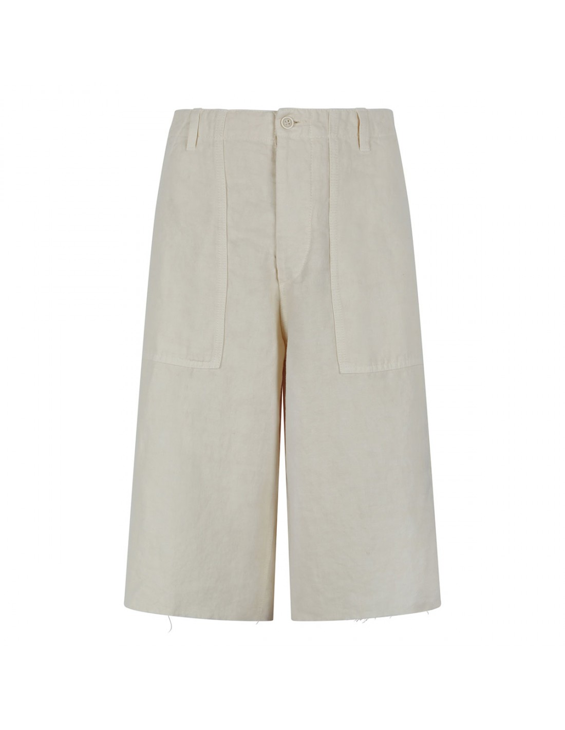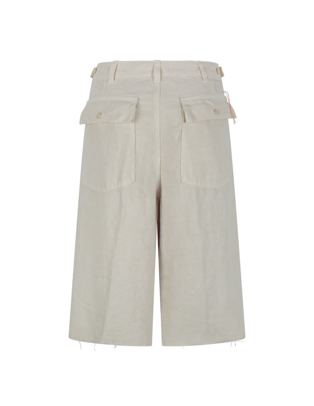 Milk hue linen Simone fatigue shorts from Fortela featuring side pockets, regular fit, button closure and zip fly, belt loops on the waistband, back patch pockets with flap and button closure.