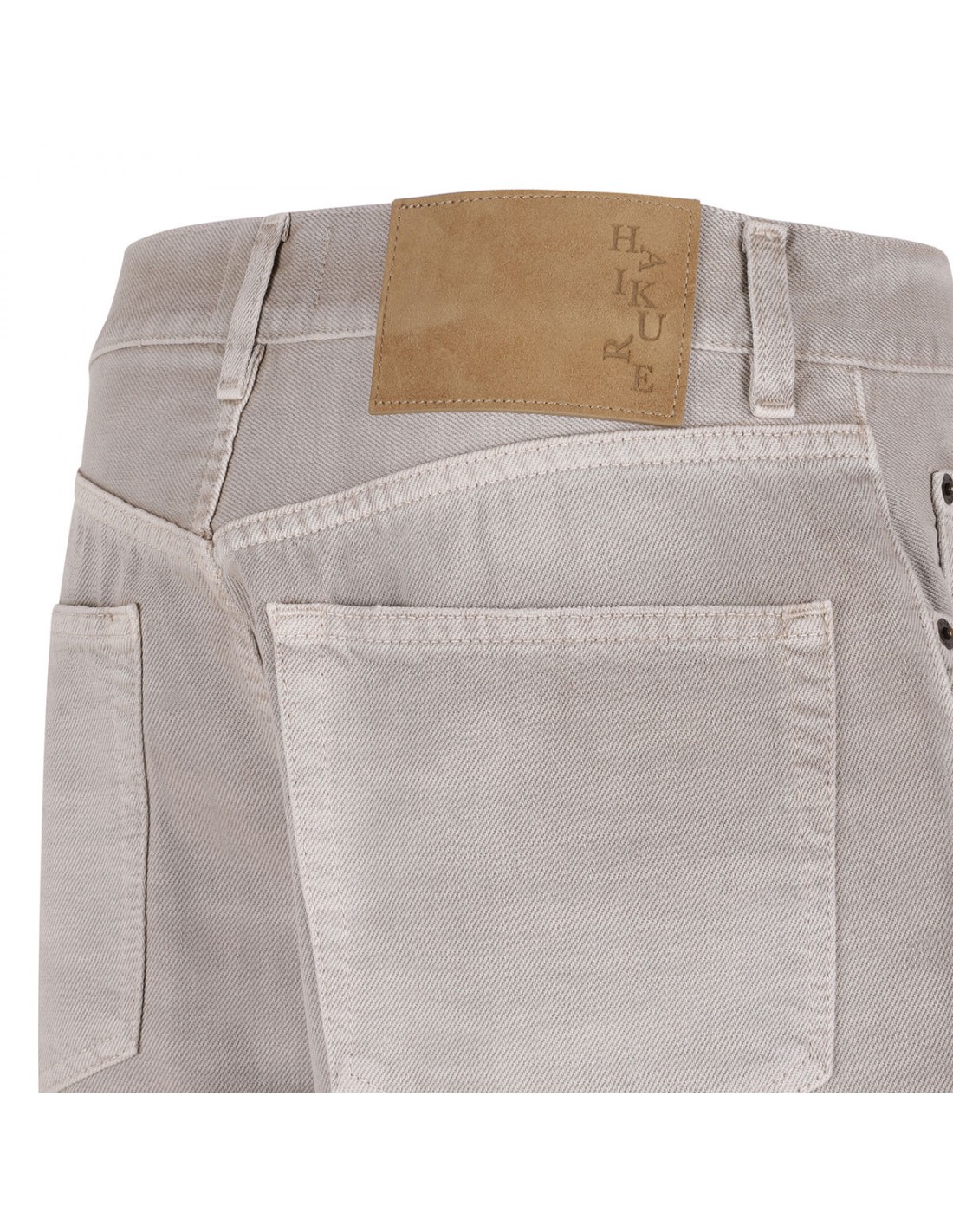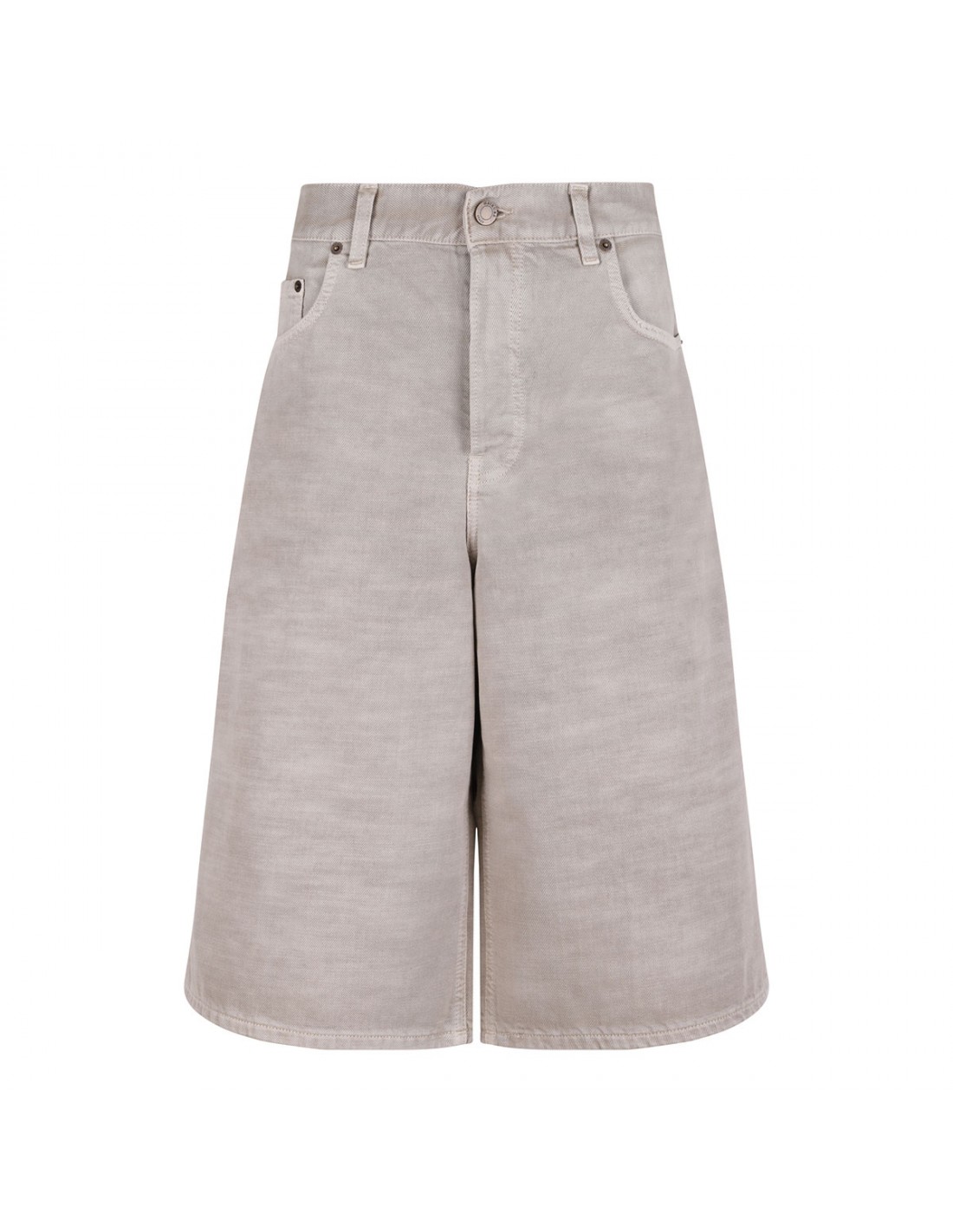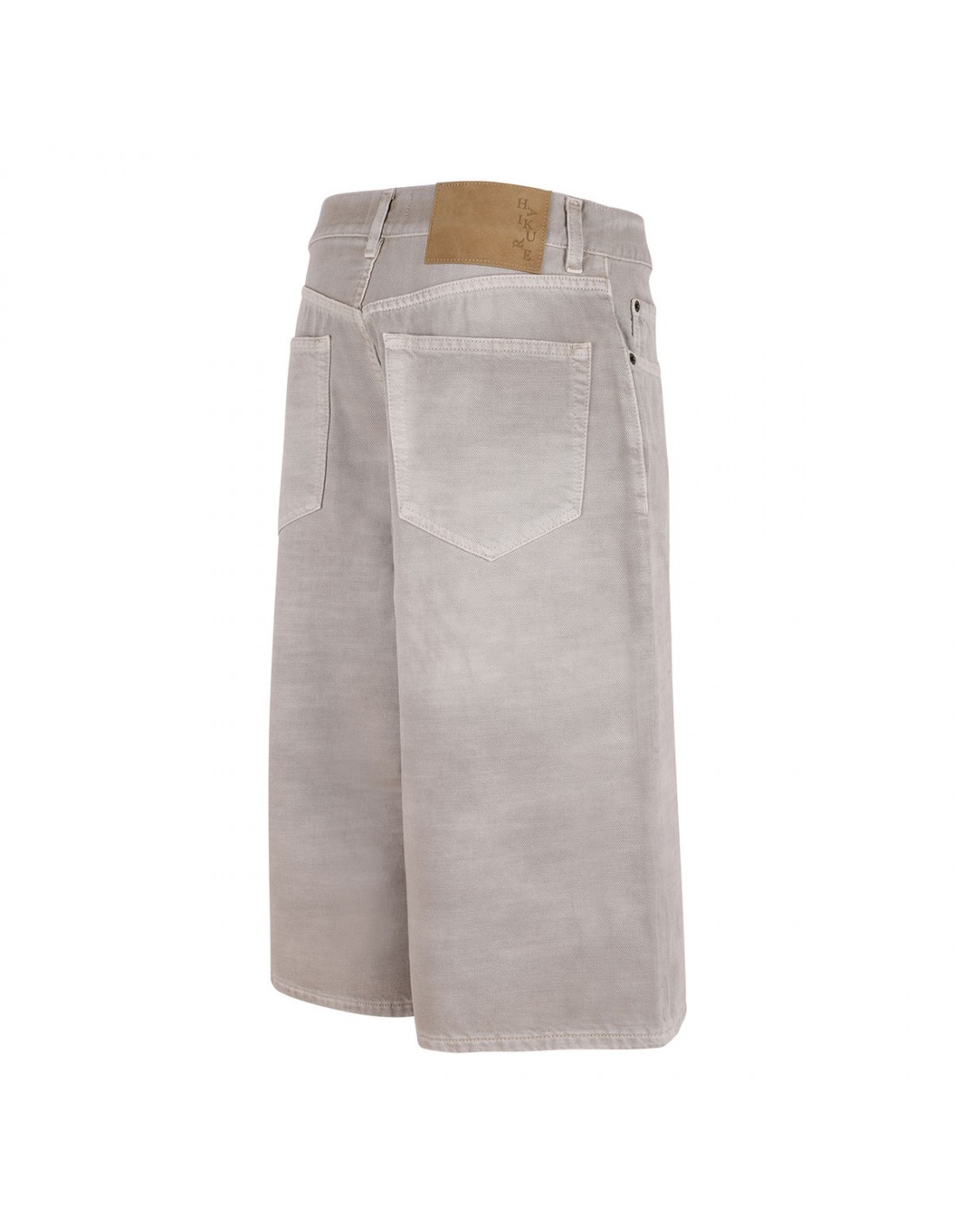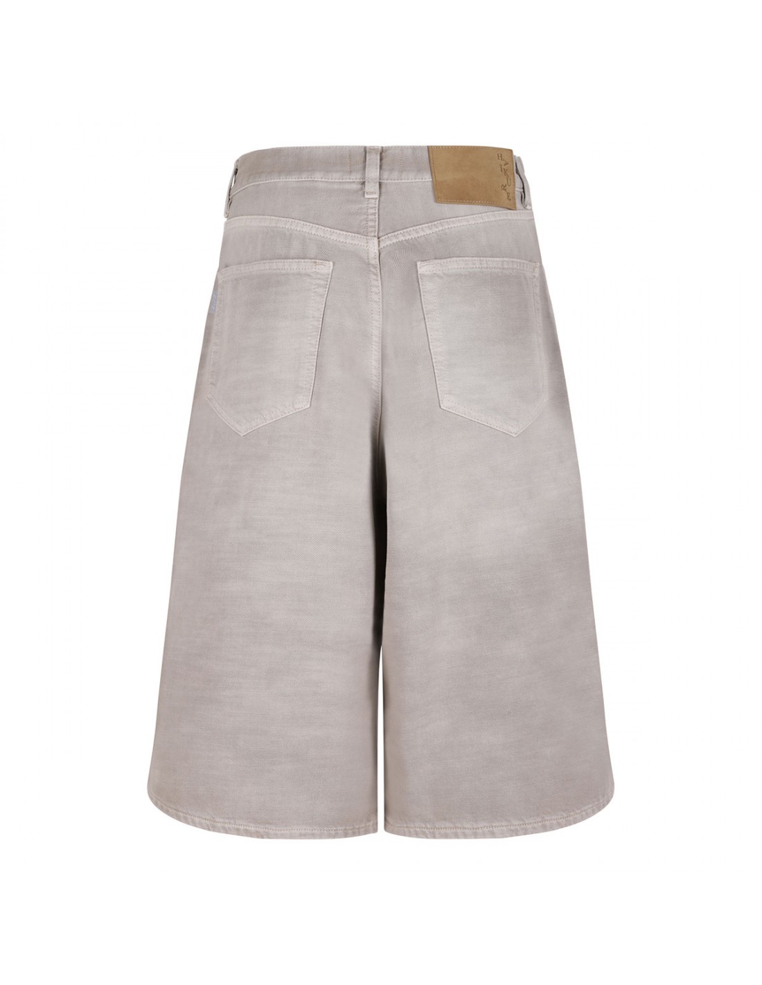 Doeskin hue denim New Becky Bull 45 bermuda shorts from Haikure featuring mid-rise waist, wide leg, button closure and zip fly, classic five-pocket style, belt loops on the waistband, leather logo tag on back-waist.