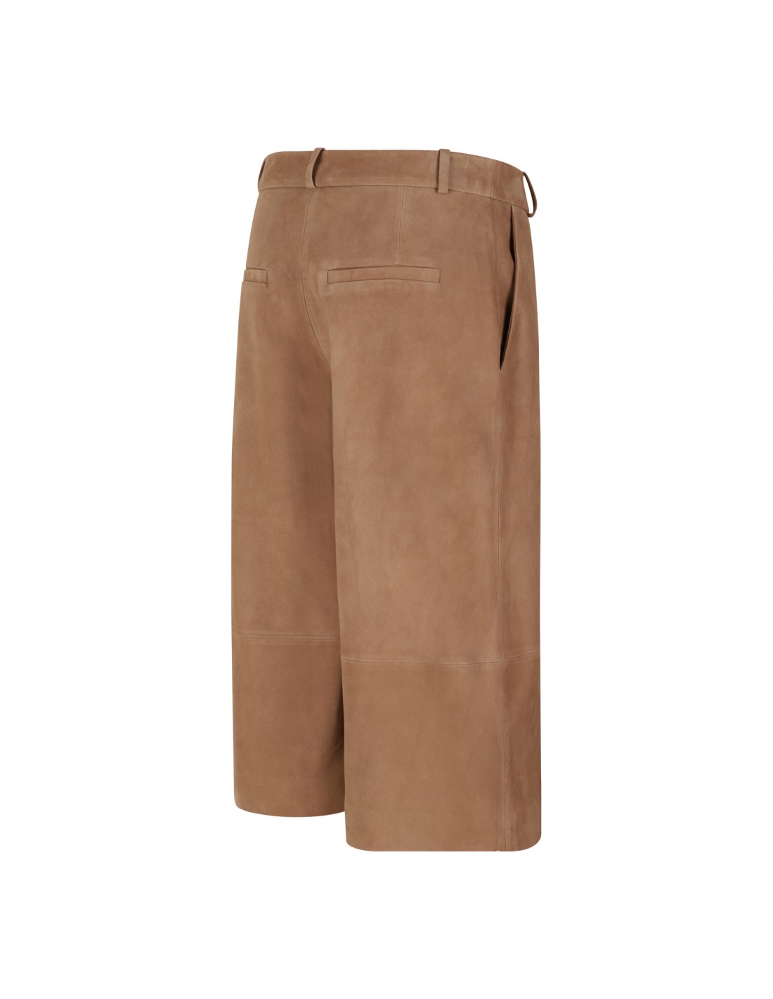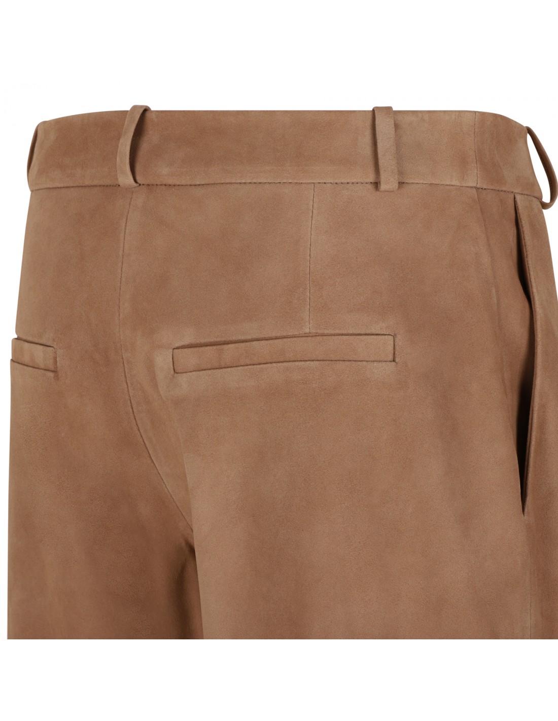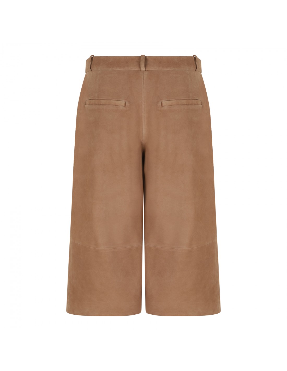 Mocha hue suede leather Jina bermuda pants from Arma featuring wide leg, concealed button-hook fastening, zip fly, side pockets, belt loops on the waistband, back slit pockets.